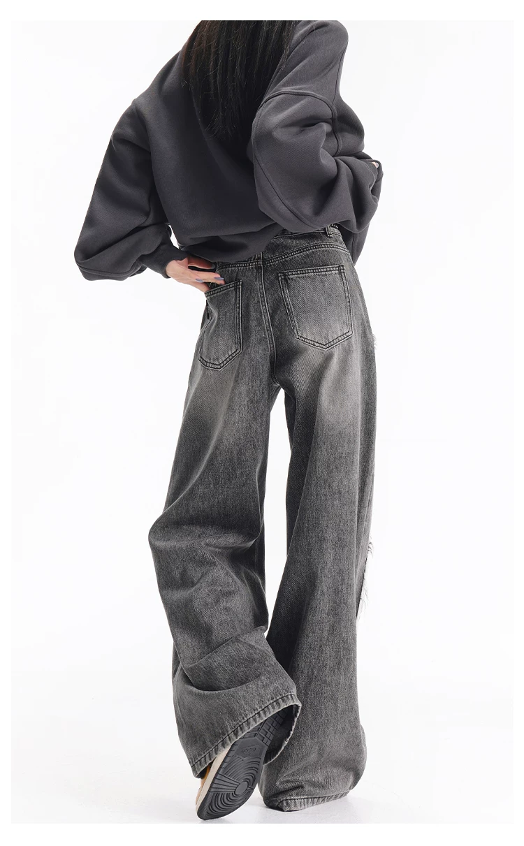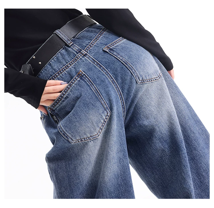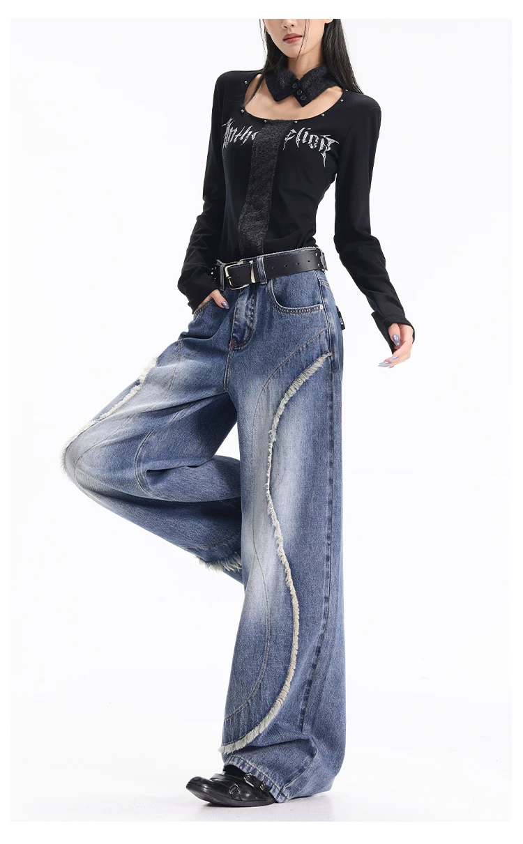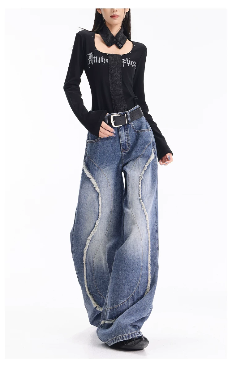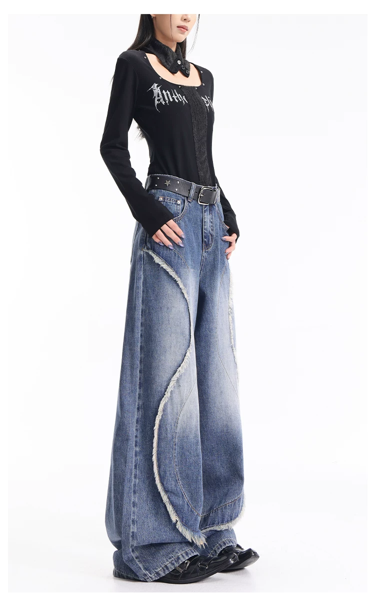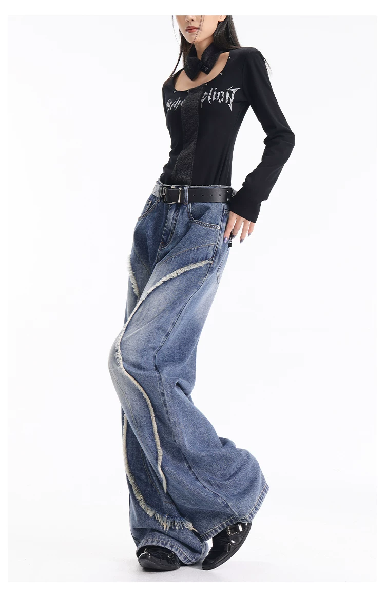 - KEN STUDIO quần jean chắp vá viền tua rua cổ điển mới mùa thu đông dành cho nữ, quần cạp cao, dáng rộng, dáng suông, quần ống rộng, dài đến sàn