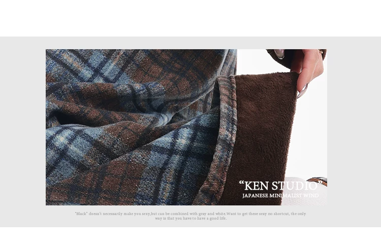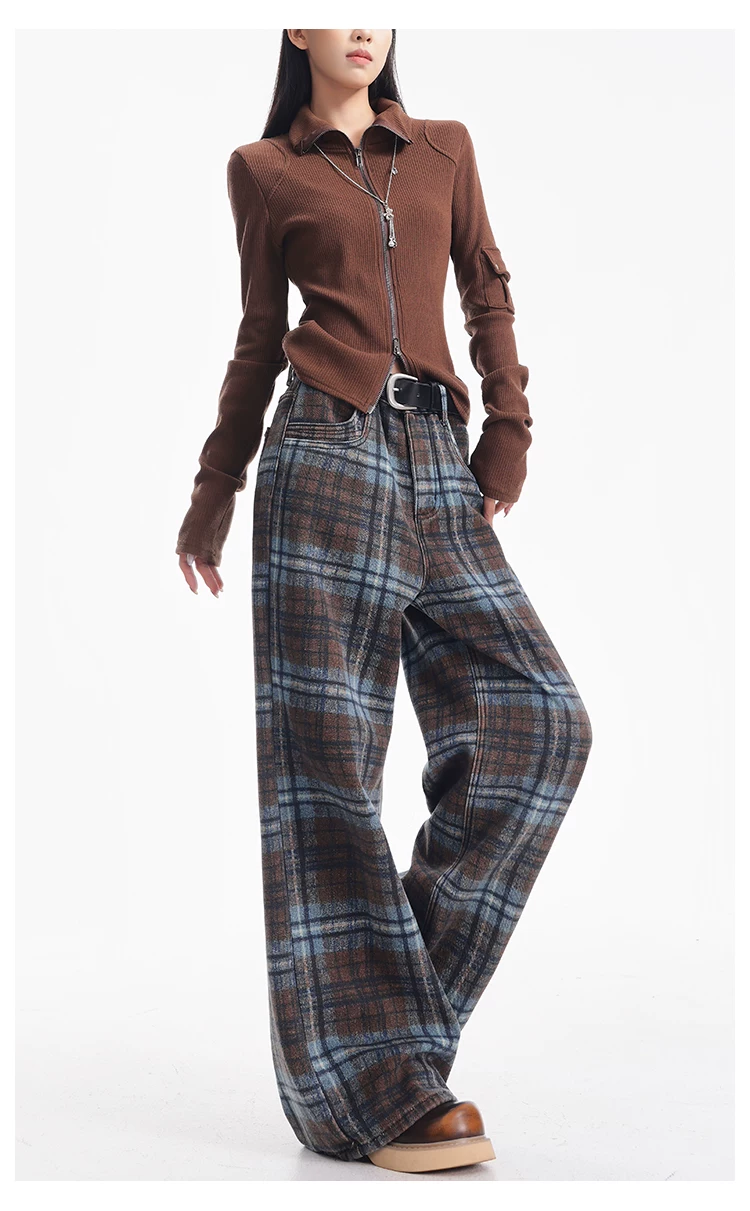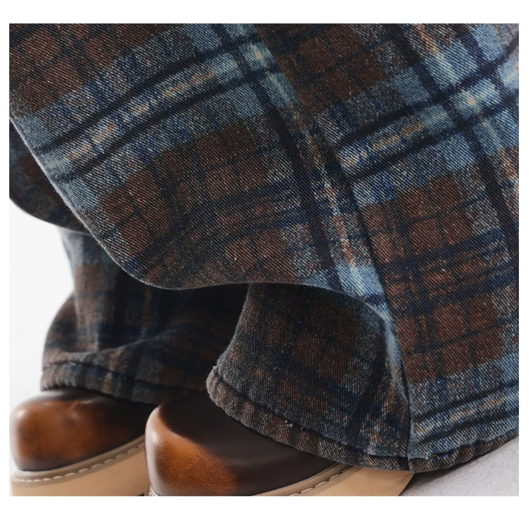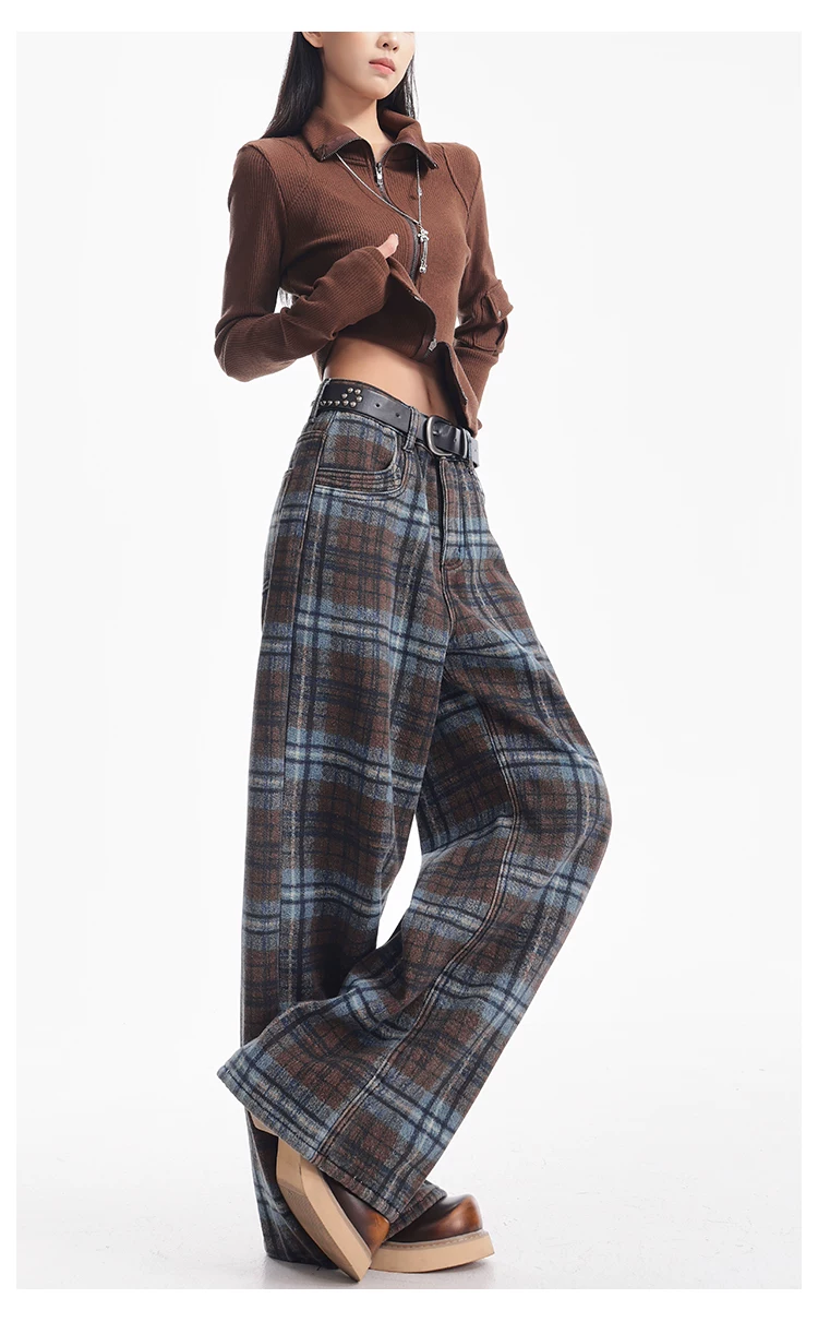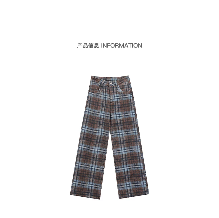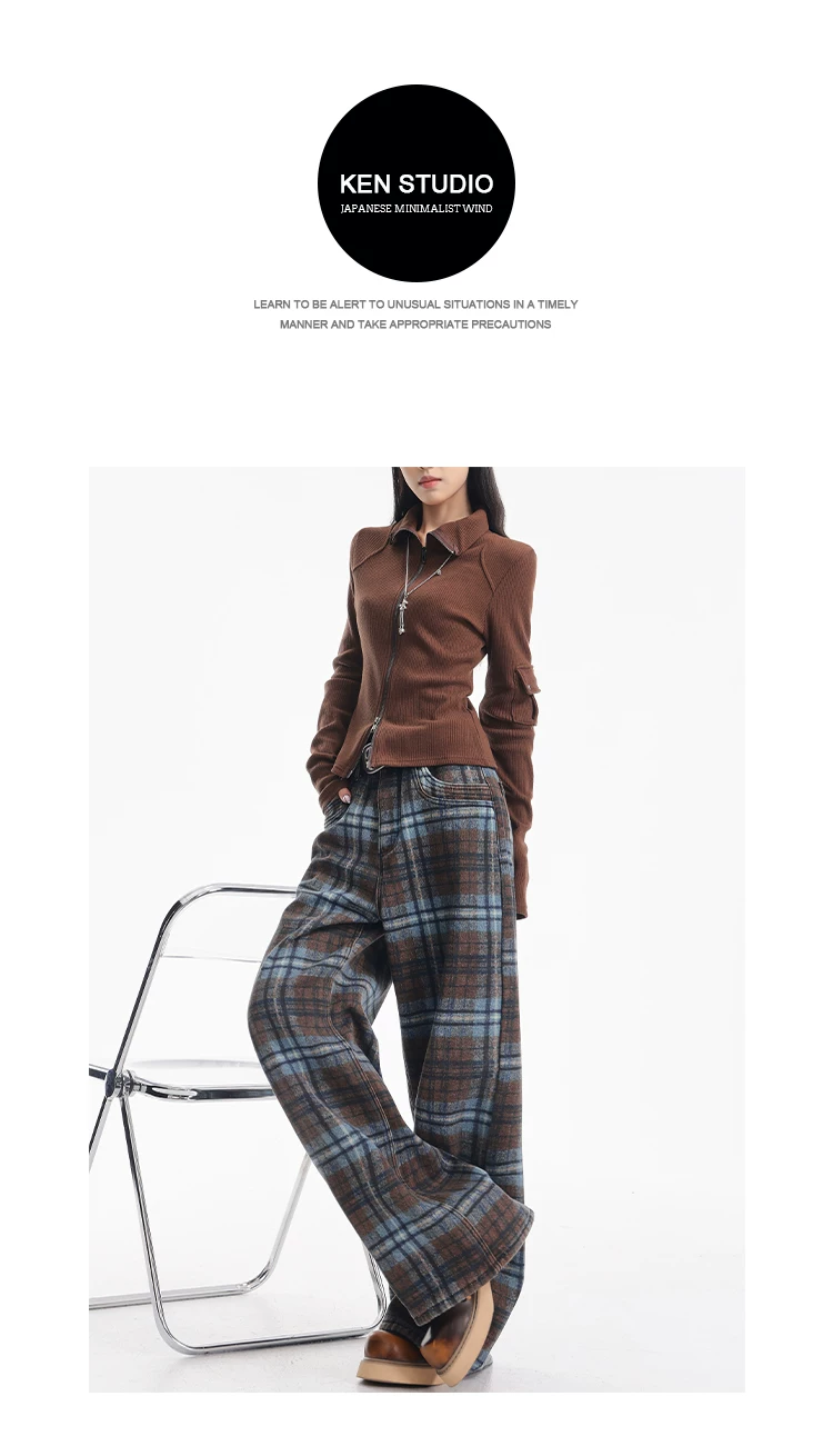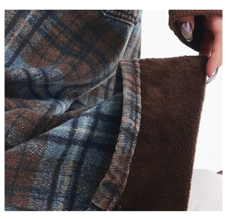 KEN STUDIO Quần jean kẻ sọc xanh mùa thu đông mới dành cho nữ, lót lông cừu, dày dặn, dáng rộng, giảm béo, quần ống rộng.