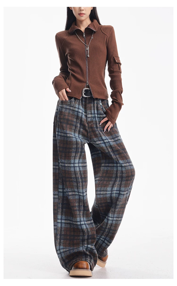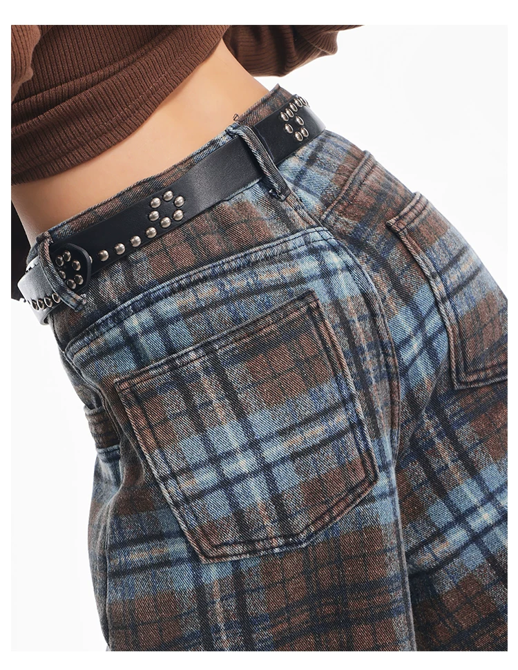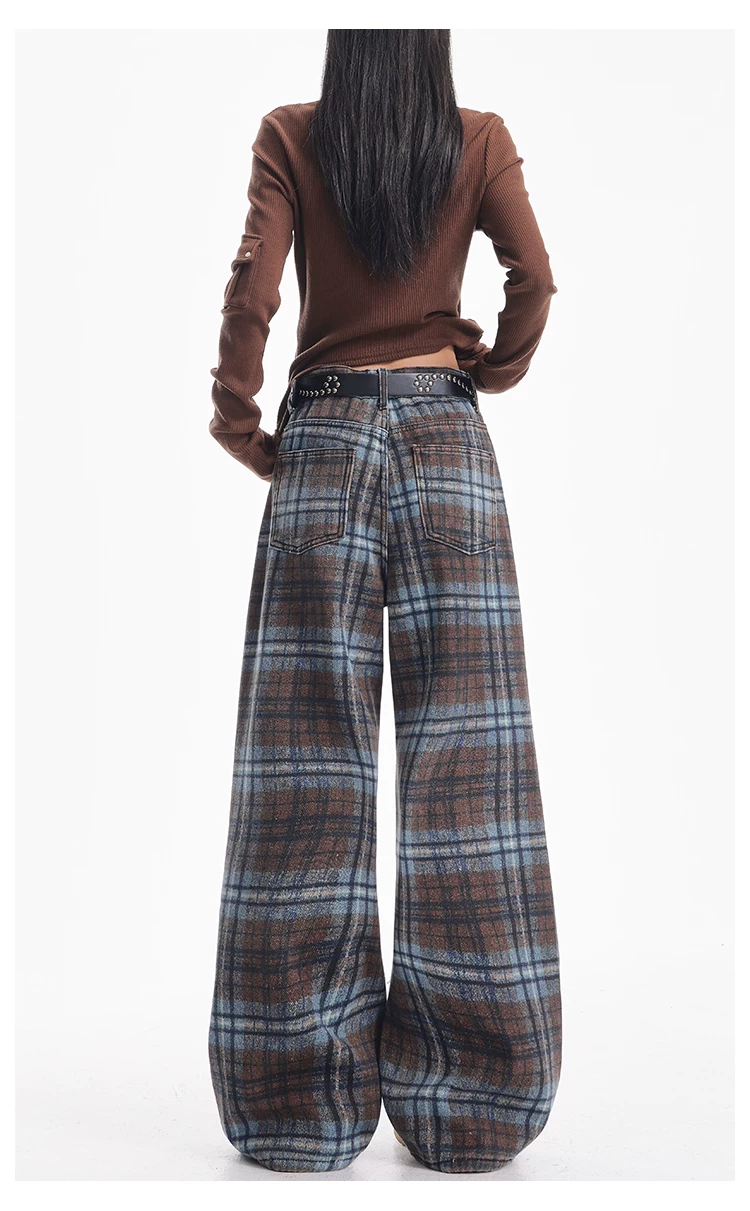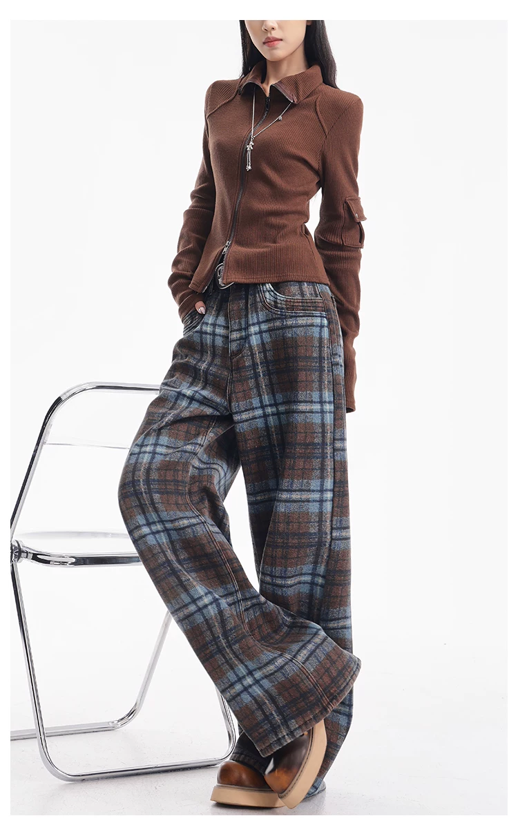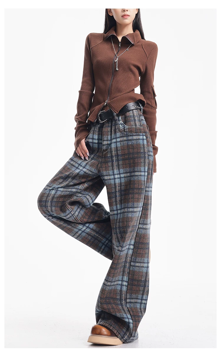 KEN STUDIO Quần jean kẻ sọc xanh mùa thu đông mới dành cho nữ, lót lông cừu, dày dặn, dáng rộng, giảm béo, quần ống rộng.