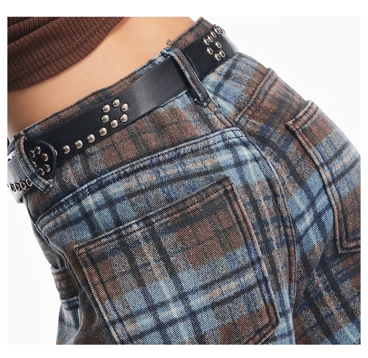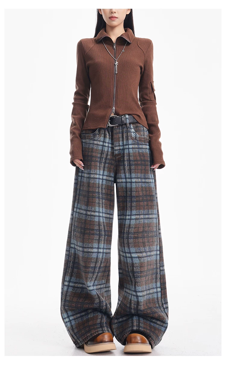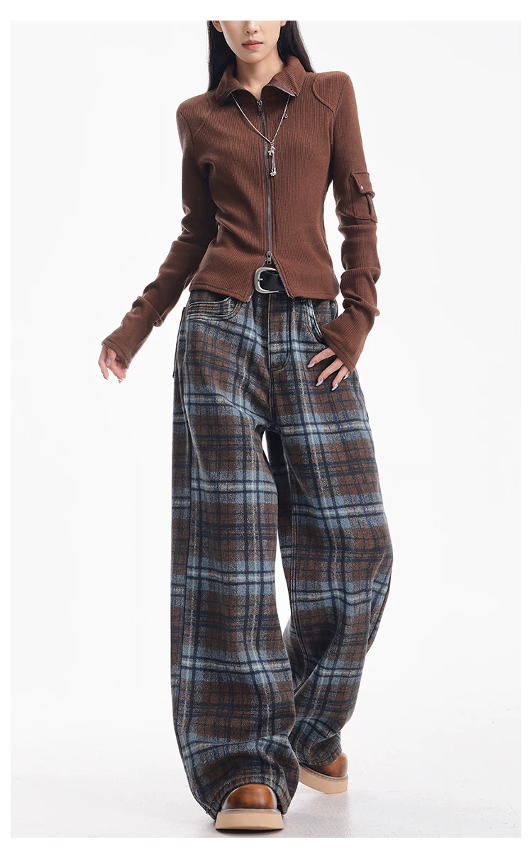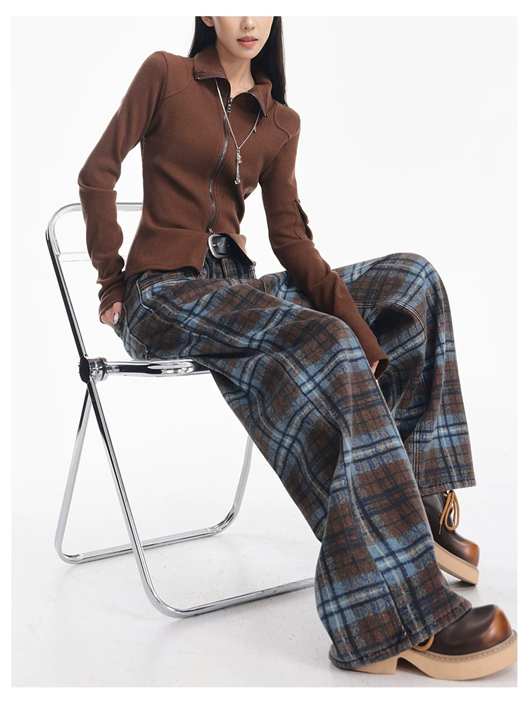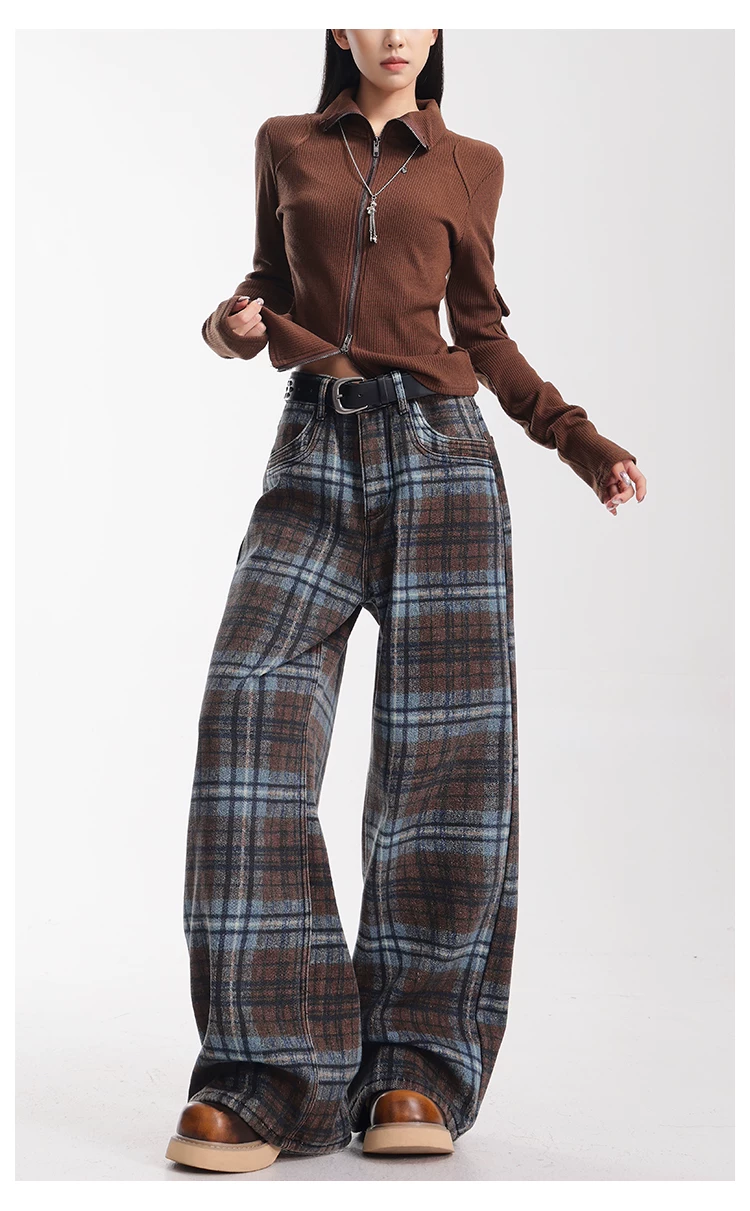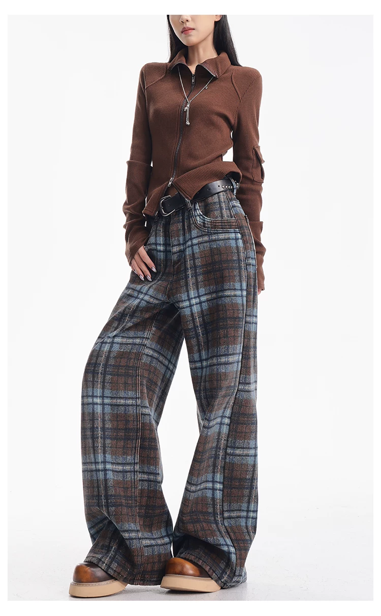 KEN STUDIO Quần jean kẻ sọc xanh mùa thu đông mới dành cho nữ, lót lông cừu, dày dặn, dáng rộng, giảm béo, quần ống rộng.