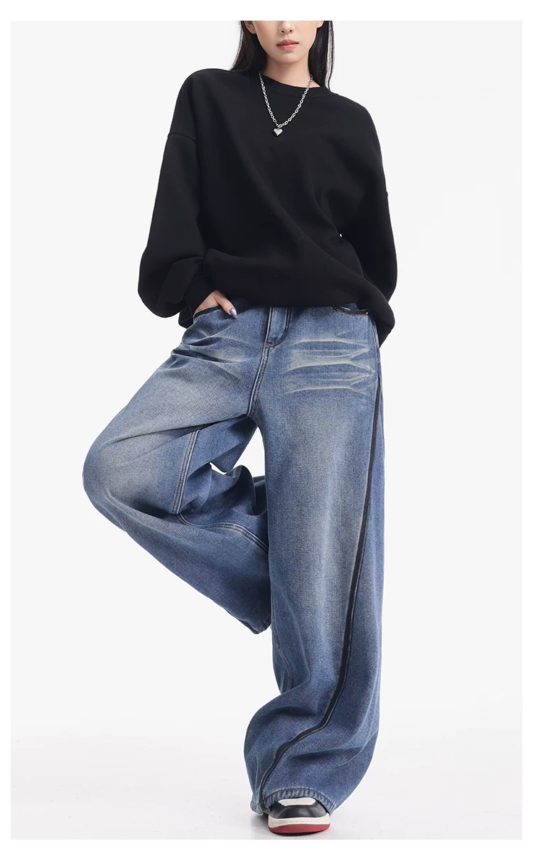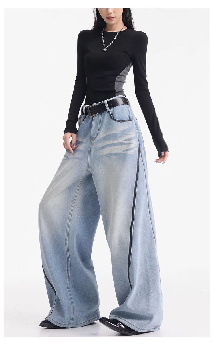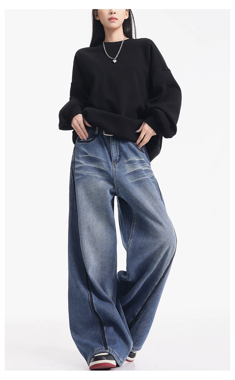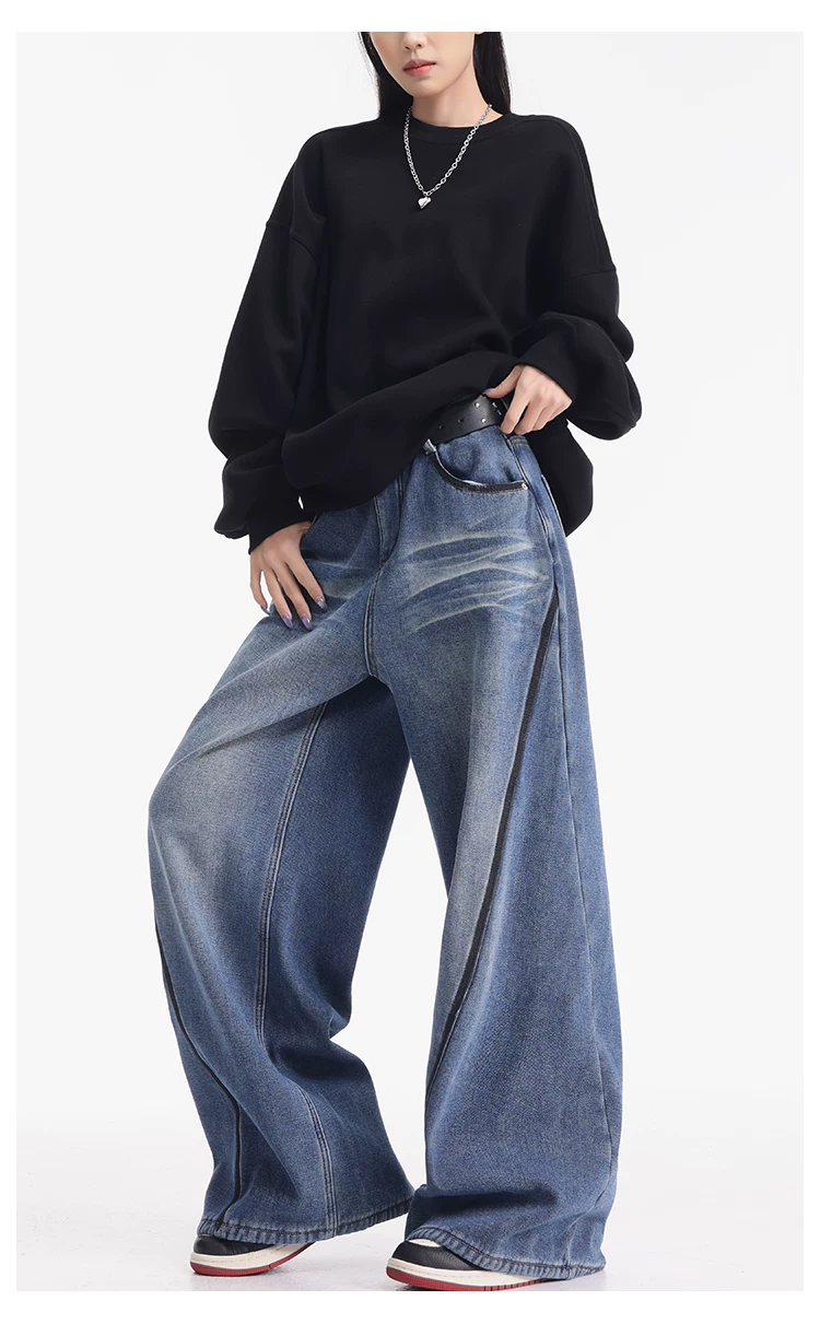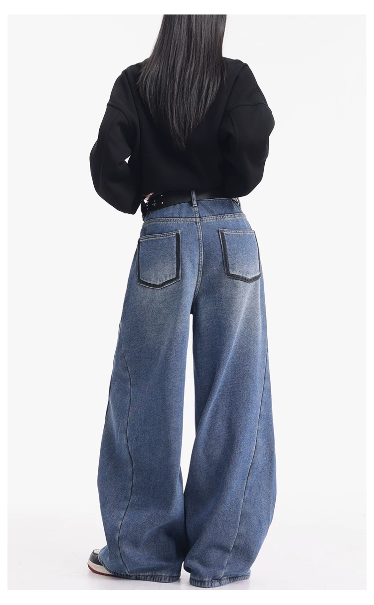 - KEN STUDIO quần jean lót lông cừu dày màu xanh nhạt mới dành cho nữ mùa thu đông, quần ống rộng được thiết kế theo phong cách phối màu đã qua xử lý.