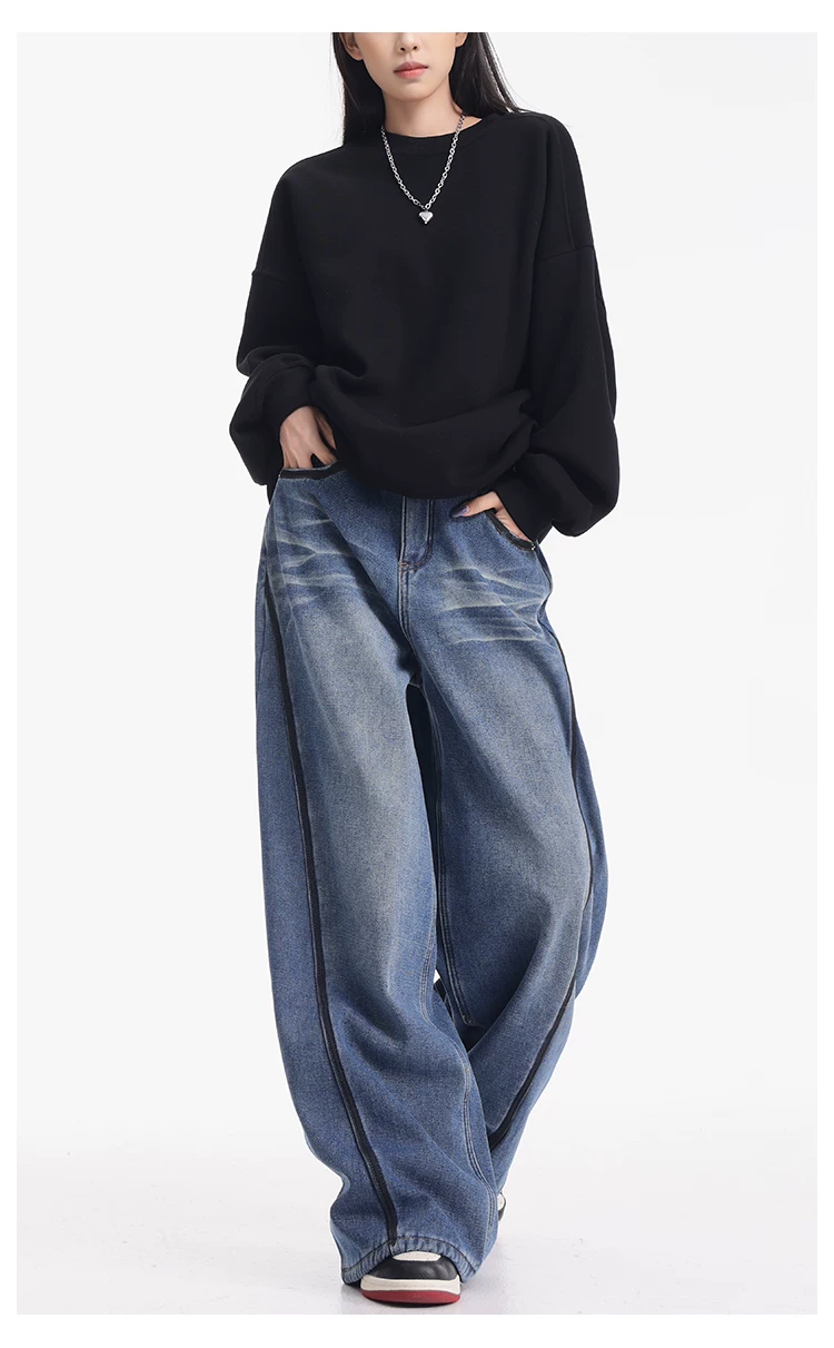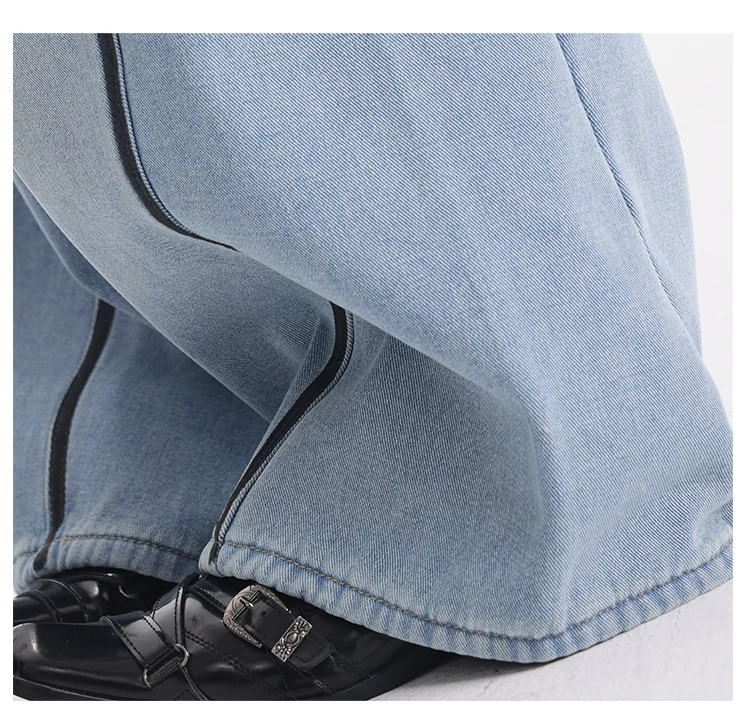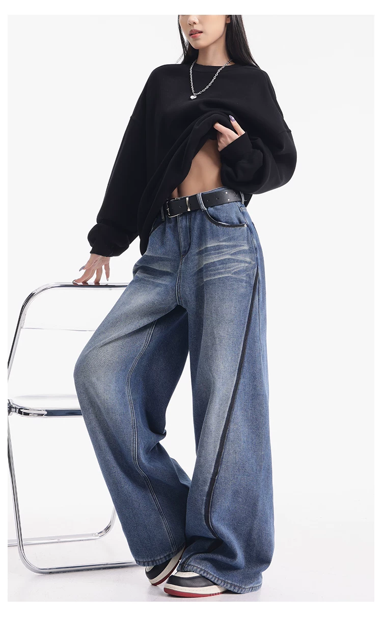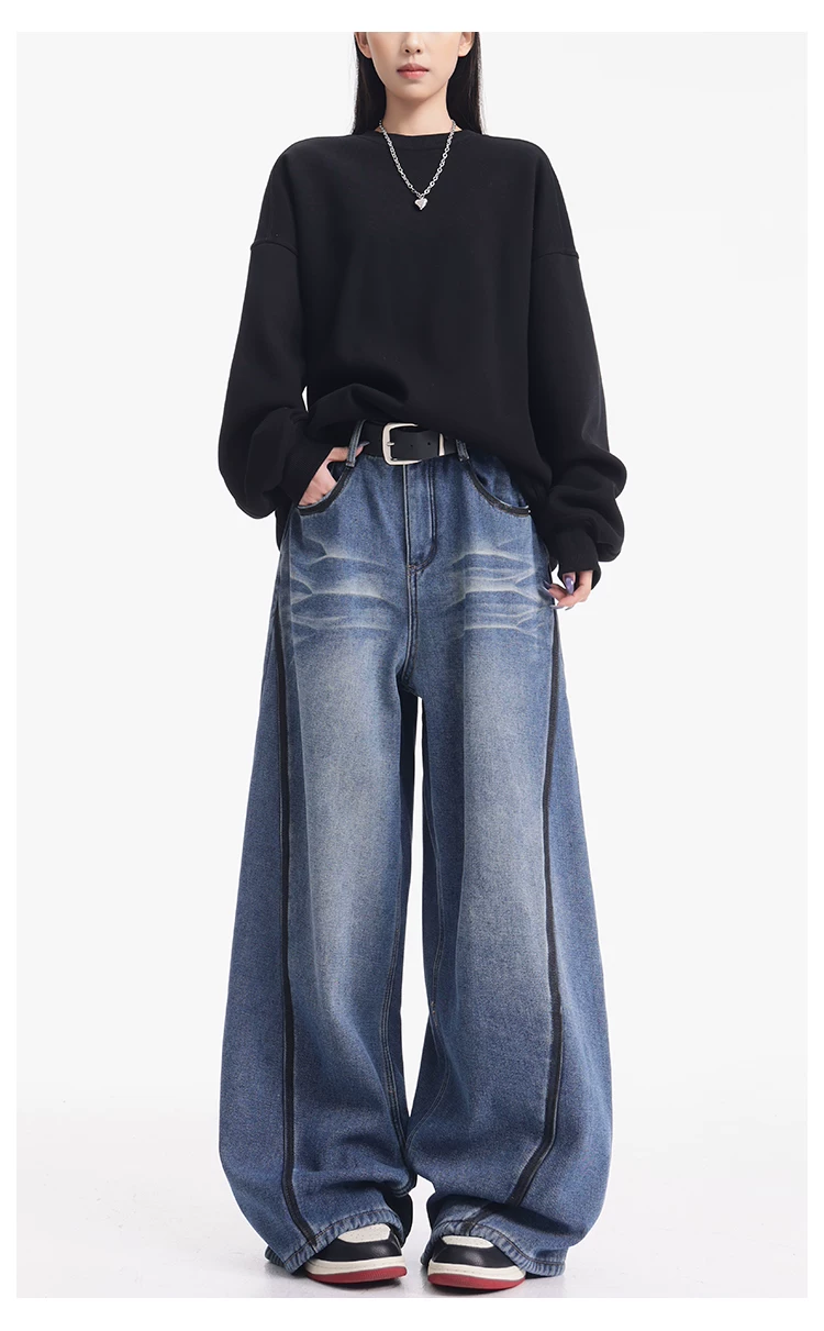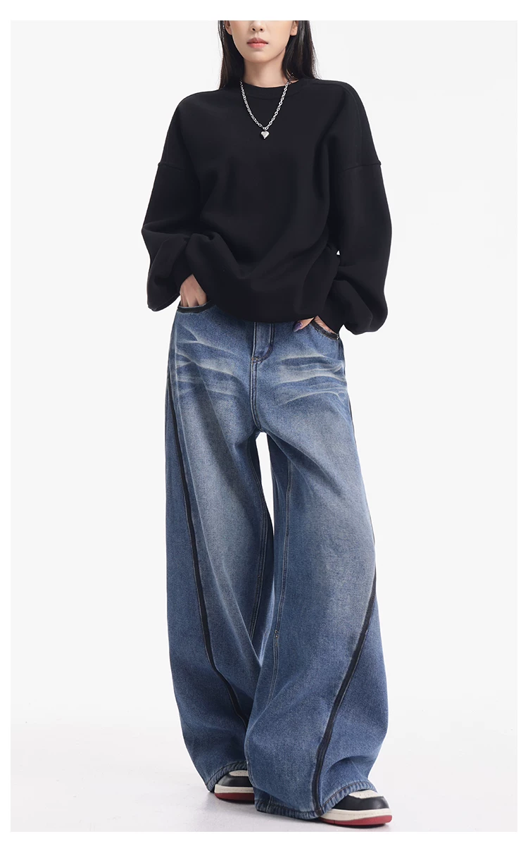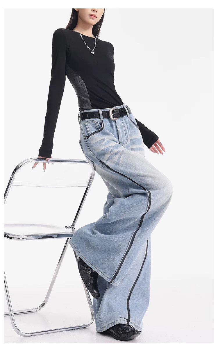 - KEN STUDIO quần jean lót lông cừu dày màu xanh nhạt mới dành cho nữ mùa thu đông, quần ống rộng được thiết kế theo phong cách phối màu đã qua xử lý.