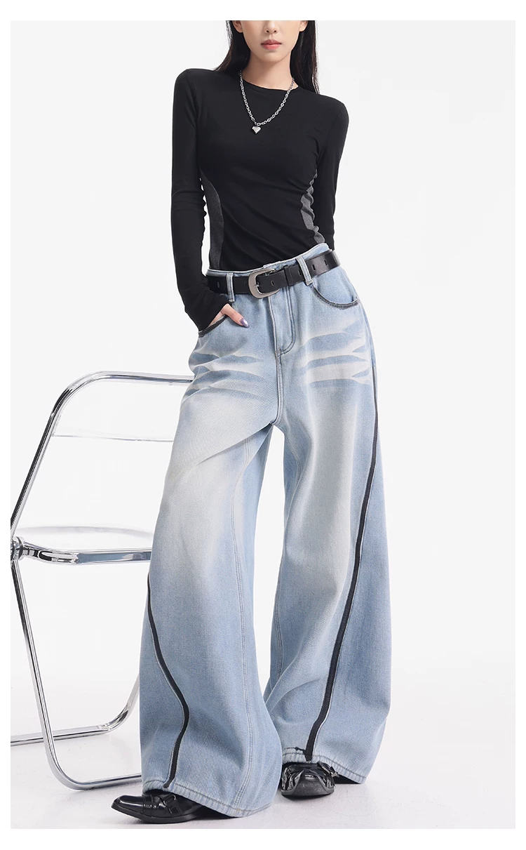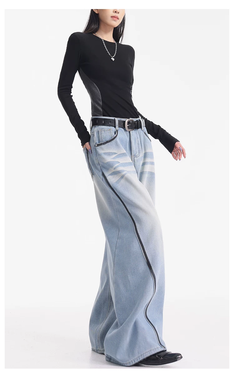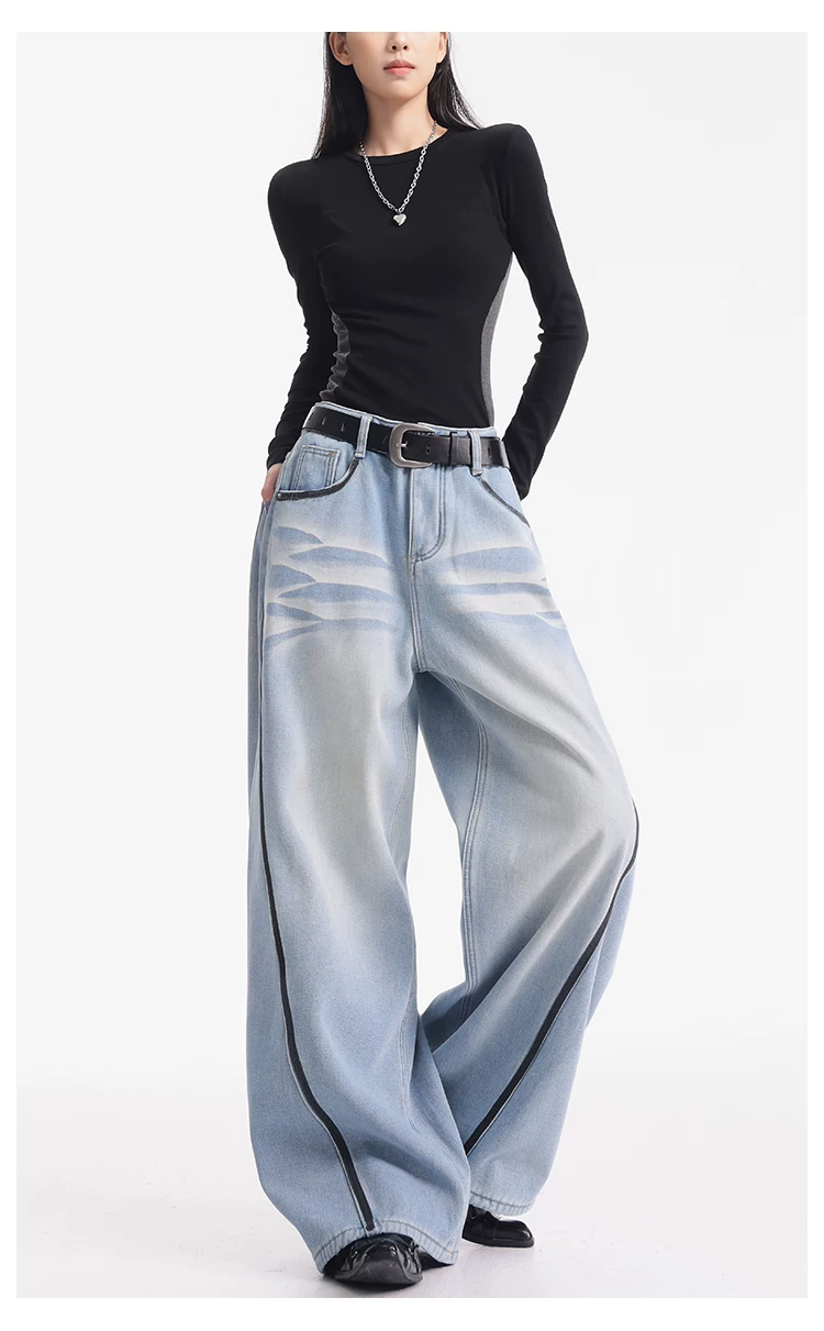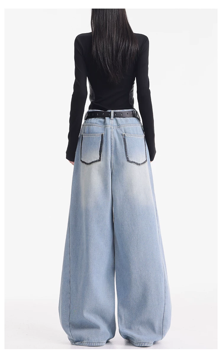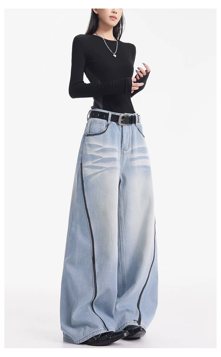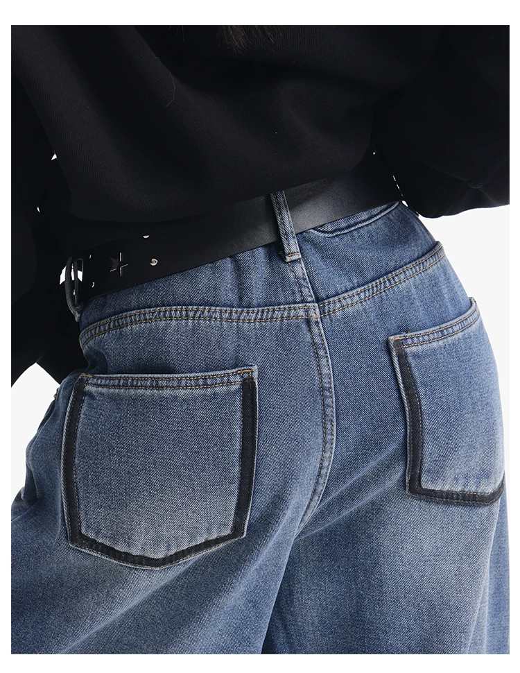 - KEN STUDIO quần jean lót lông cừu dày màu xanh nhạt mới dành cho nữ mùa thu đông, quần ống rộng được thiết kế theo phong cách phối màu đã qua xử lý.