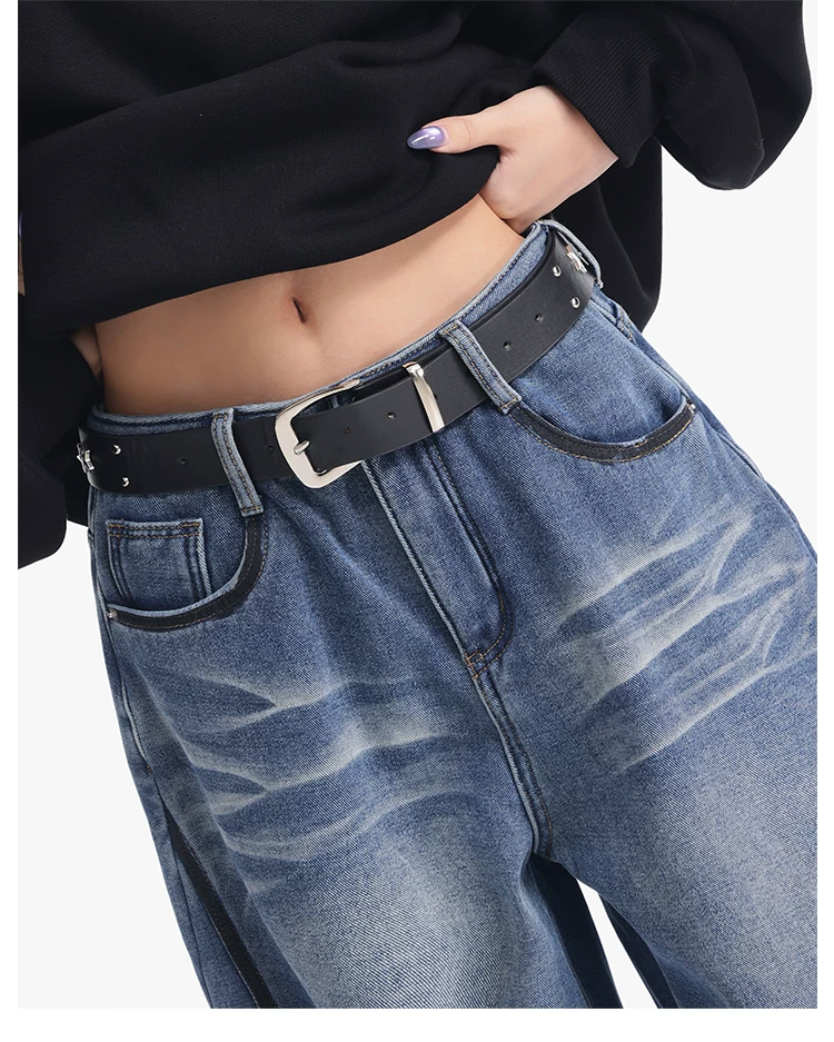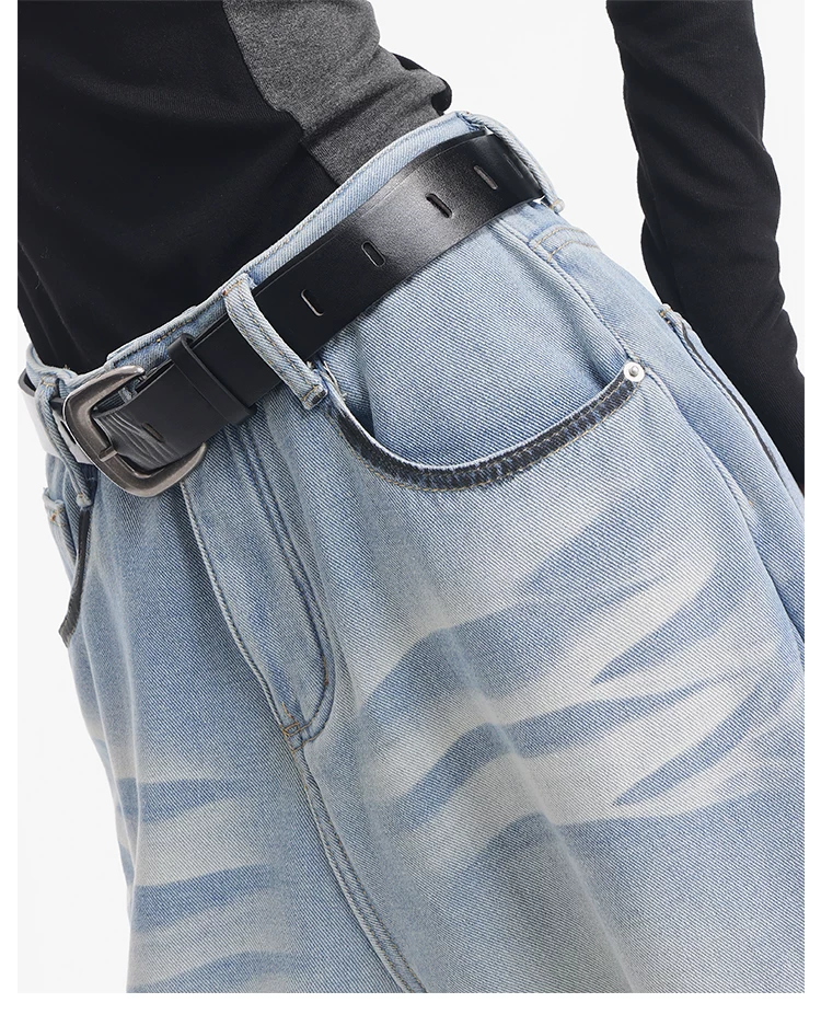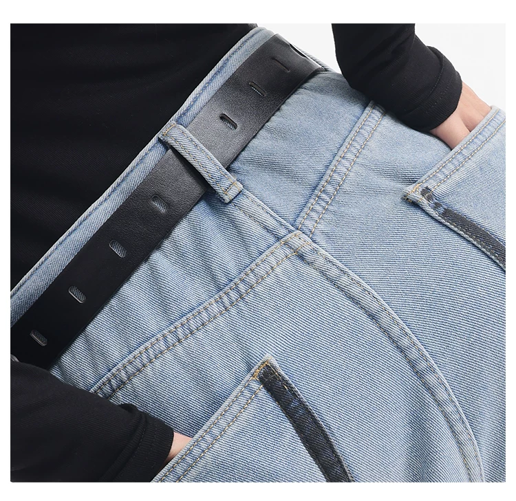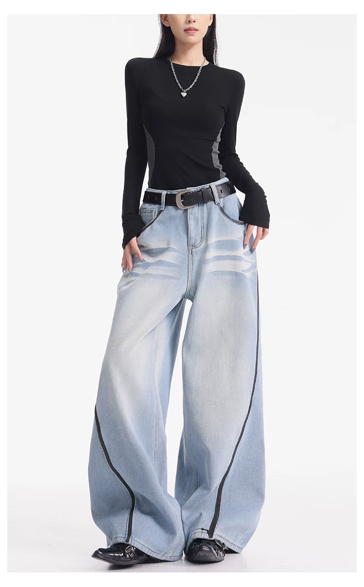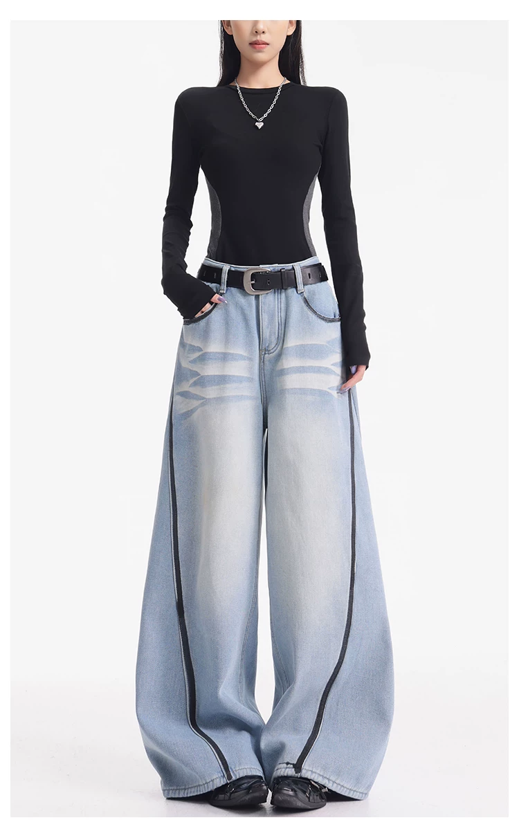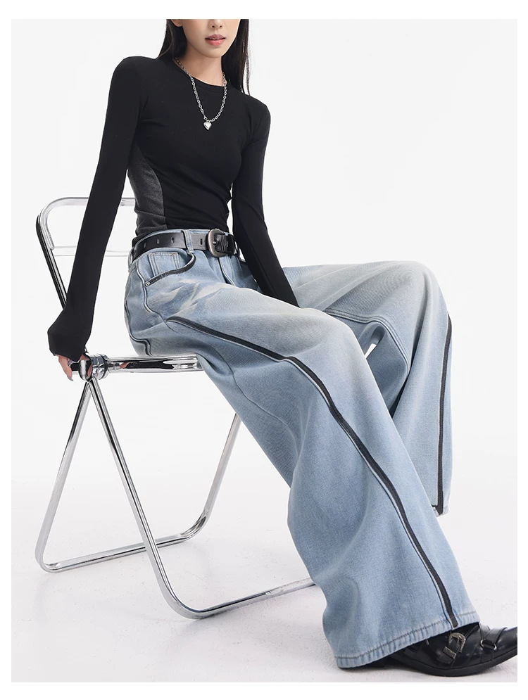 - KEN STUDIO quần jean lót lông cừu dày màu xanh nhạt mới dành cho nữ mùa thu đông, quần ống rộng được thiết kế theo phong cách phối màu đã qua xử lý.