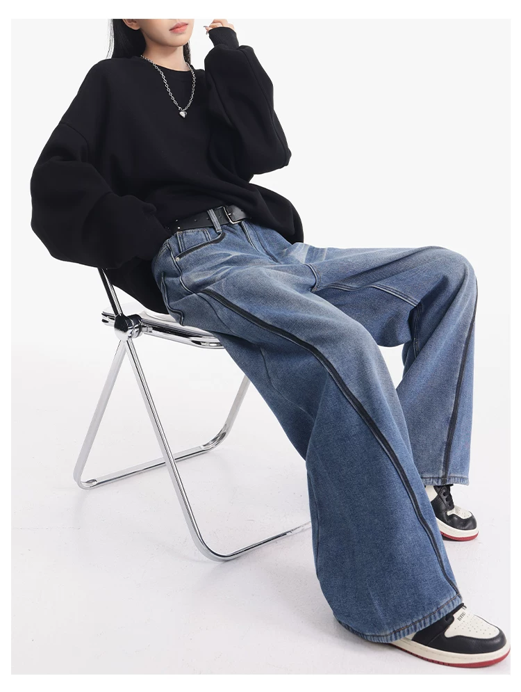 KEN STUDIO quần jean lót lông cừu dày màu xanh nhạt mới dành cho nữ mùa thu đông, quần ống rộng được thiết kế theo phong cách phối màu đã qua xử lý.