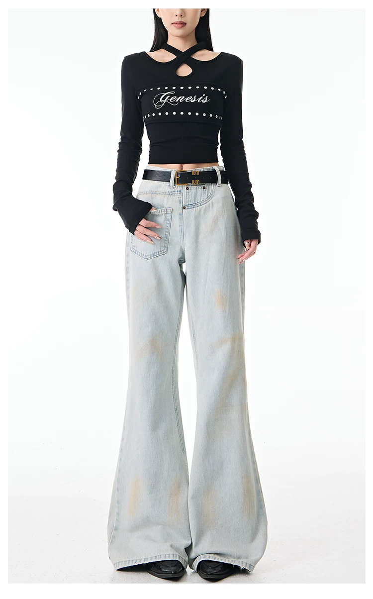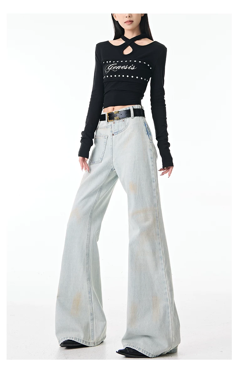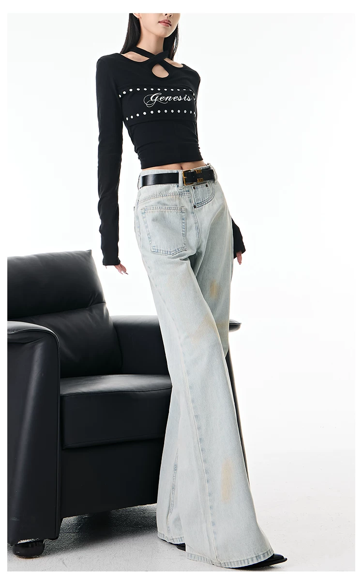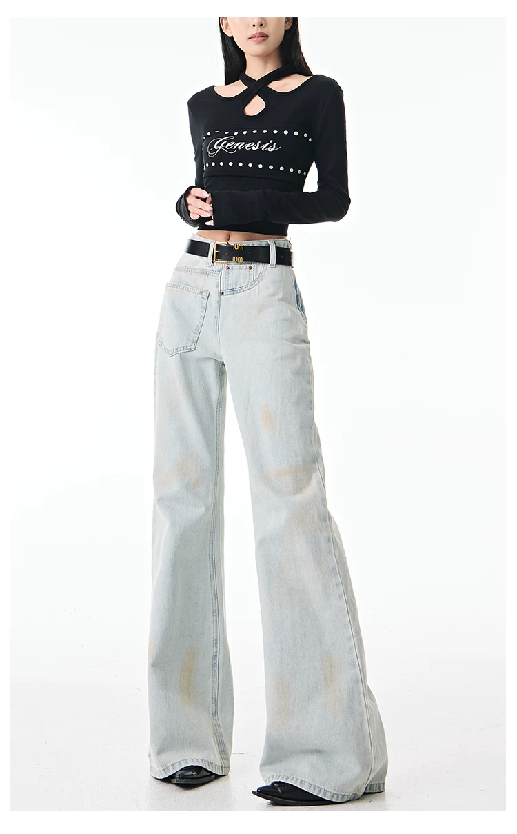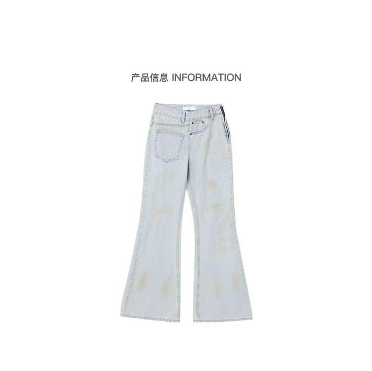 - KEN STUDIO Quần jean ống loe màu xanh mùa thu mới dành cho nữ với thiết kế khóa kéo bên hông, quần ống loe dáng rộng