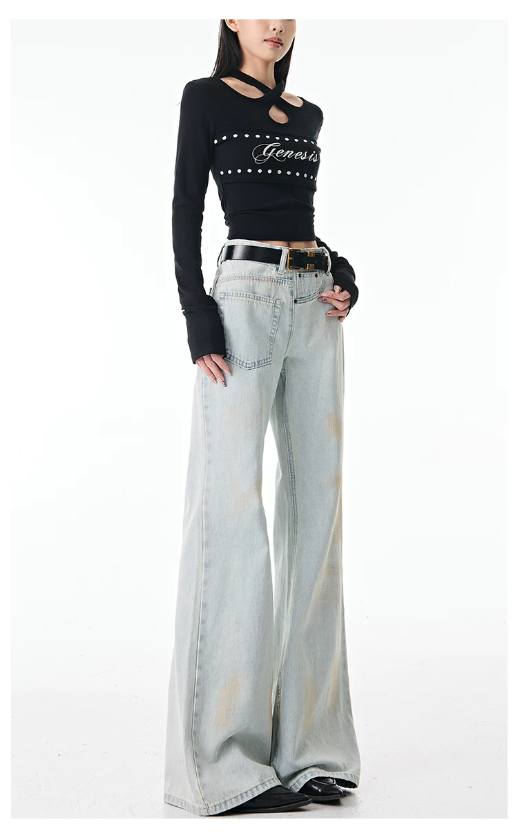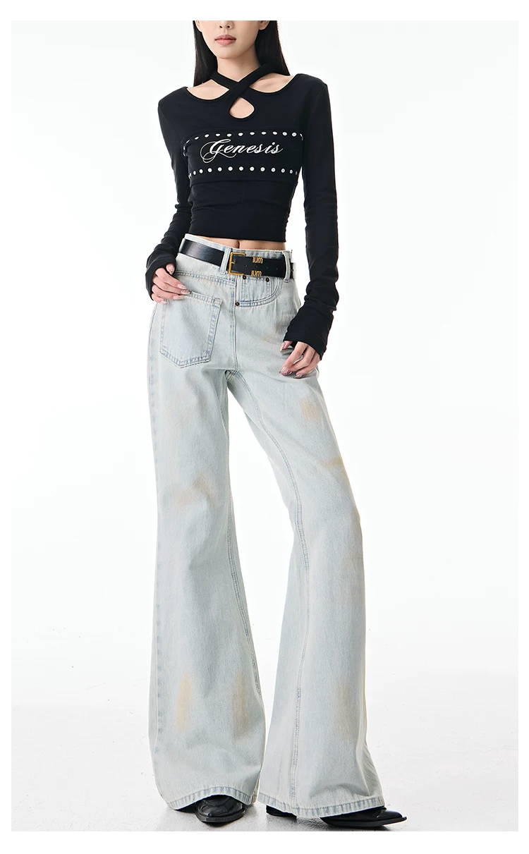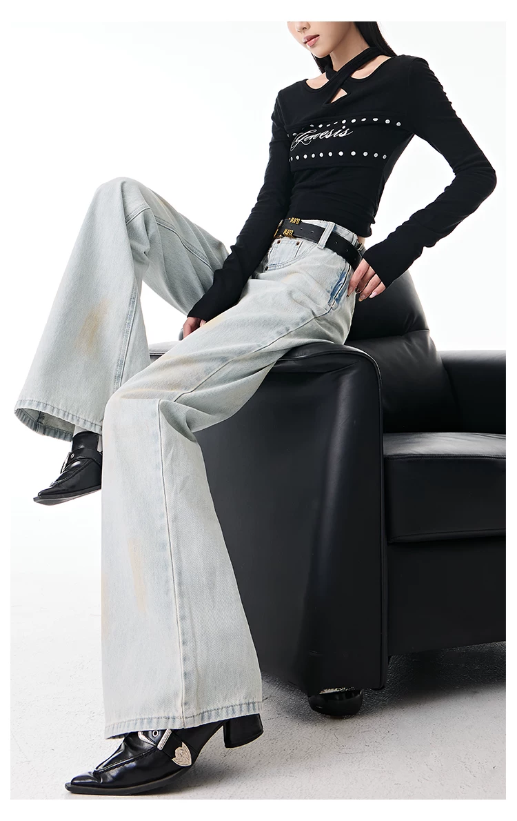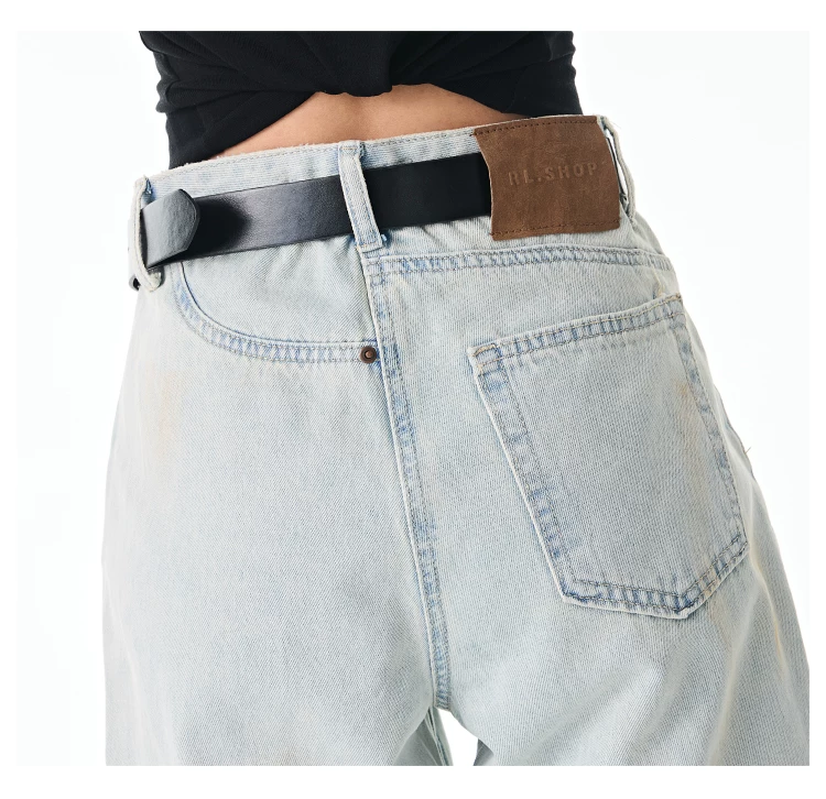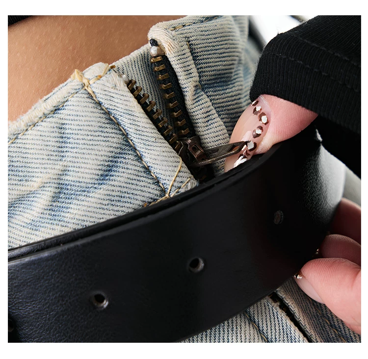 - KEN STUDIO Quần jean ống loe màu xanh mùa thu mới dành cho nữ với thiết kế khóa kéo bên hông, quần ống loe dáng rộng