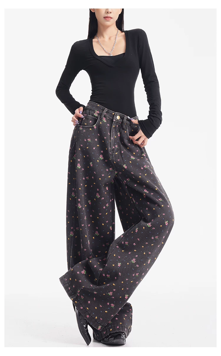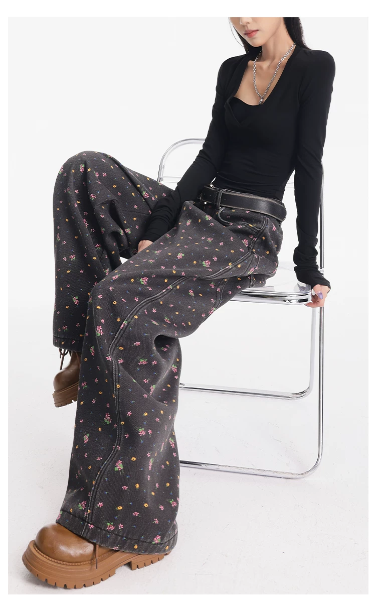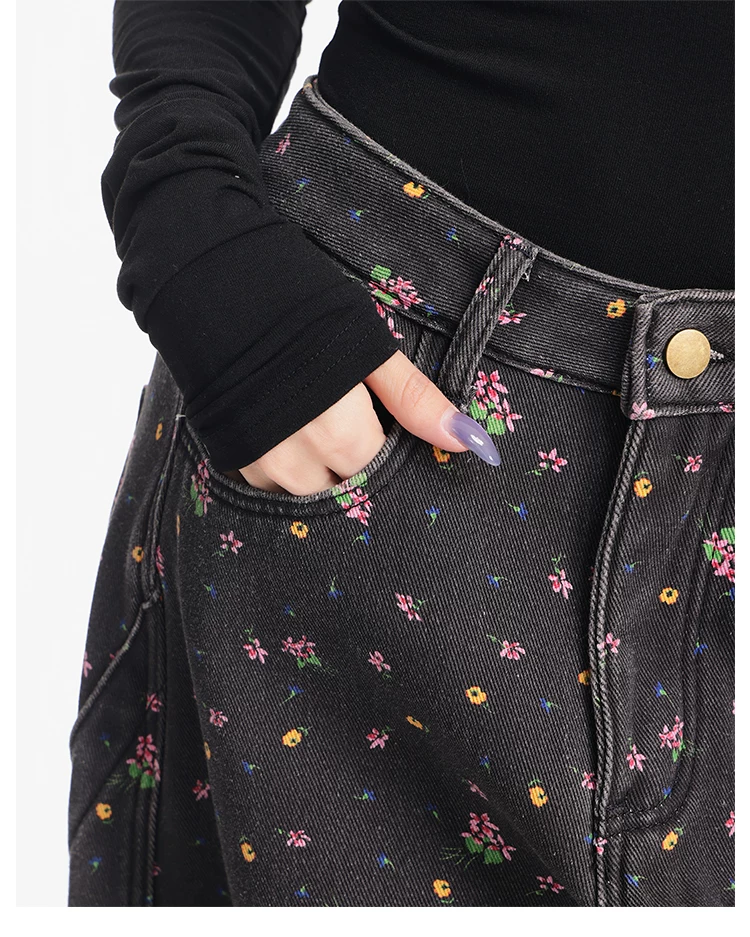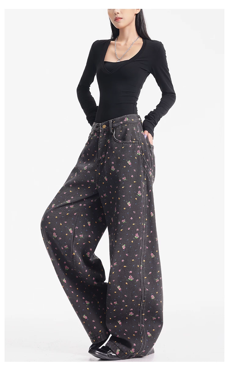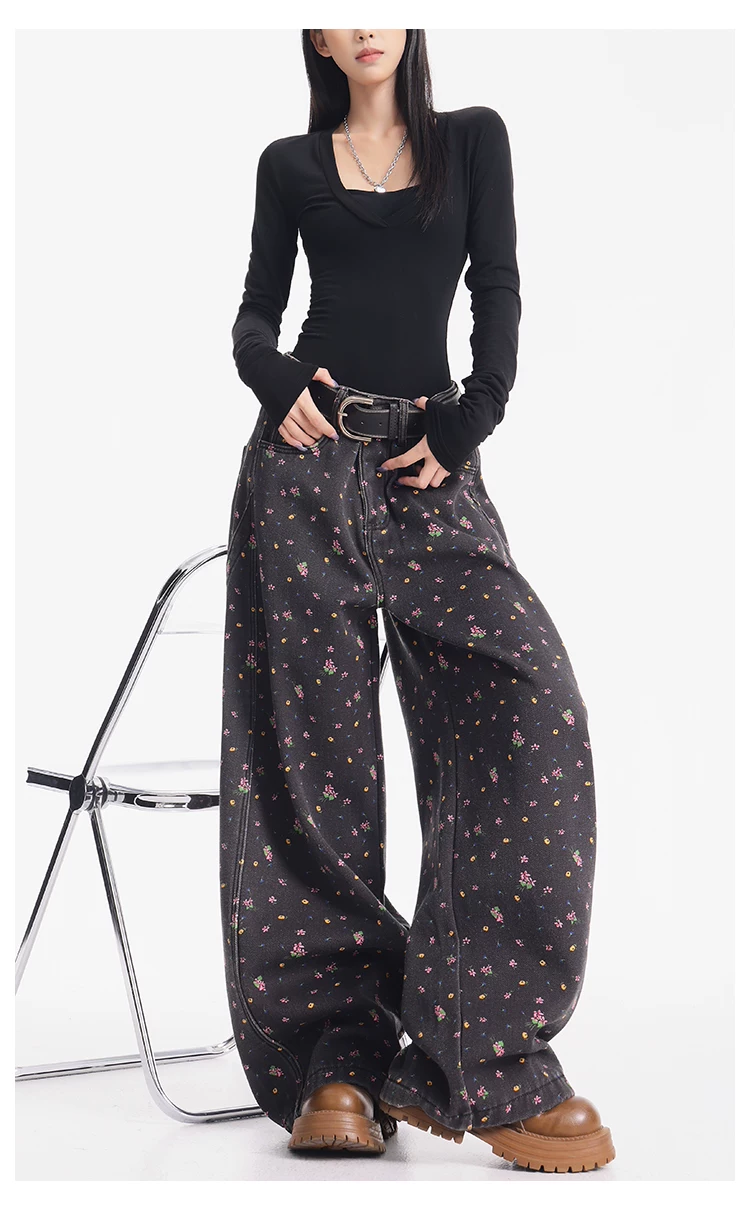 - KEN STUDIO quần jean ống rộng họa tiết hoa cà phê đậm phong cách mới thu đông dành cho nữ, quần dài ống rộng dày dặn và lót lông cừu.