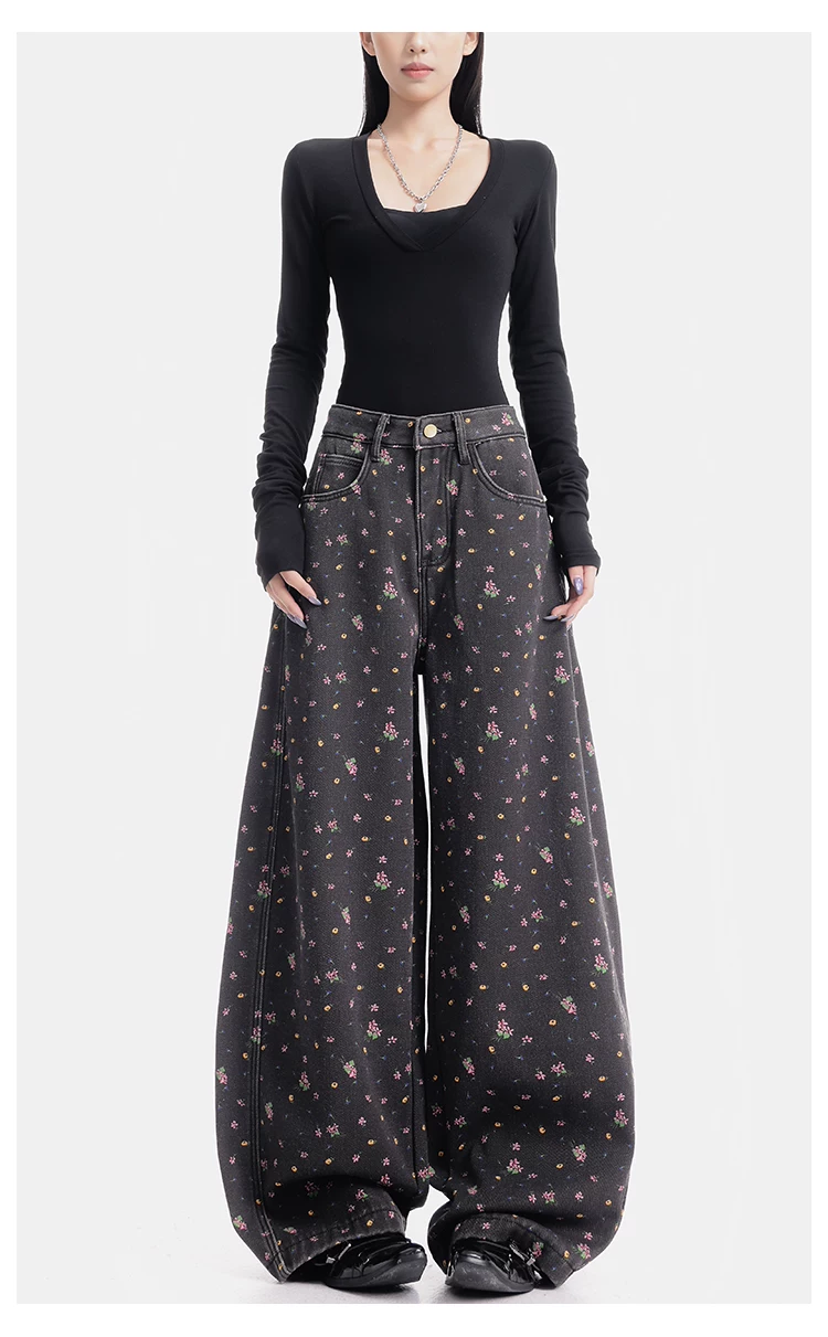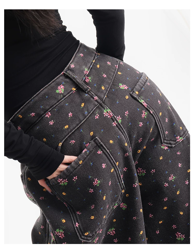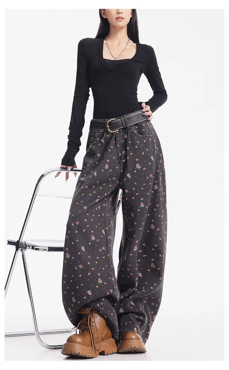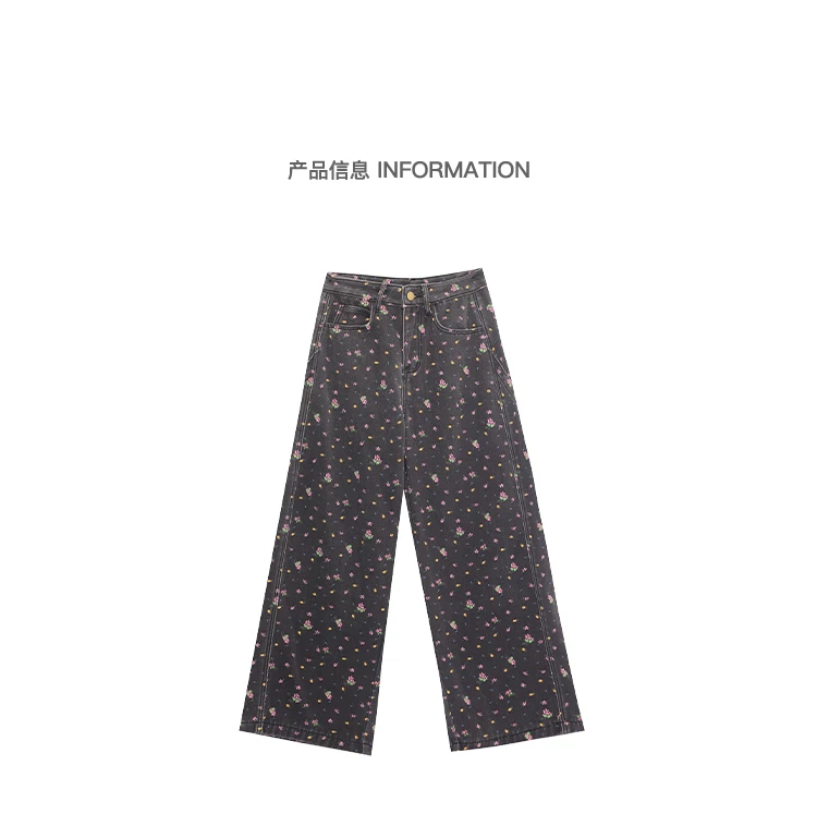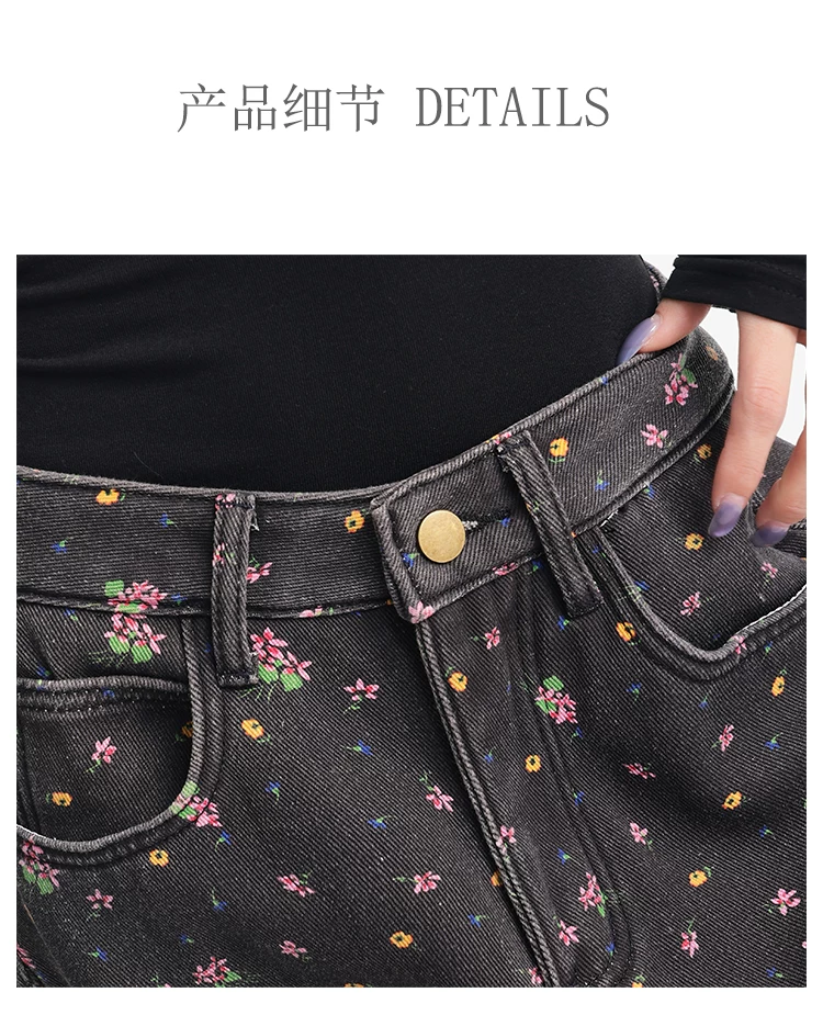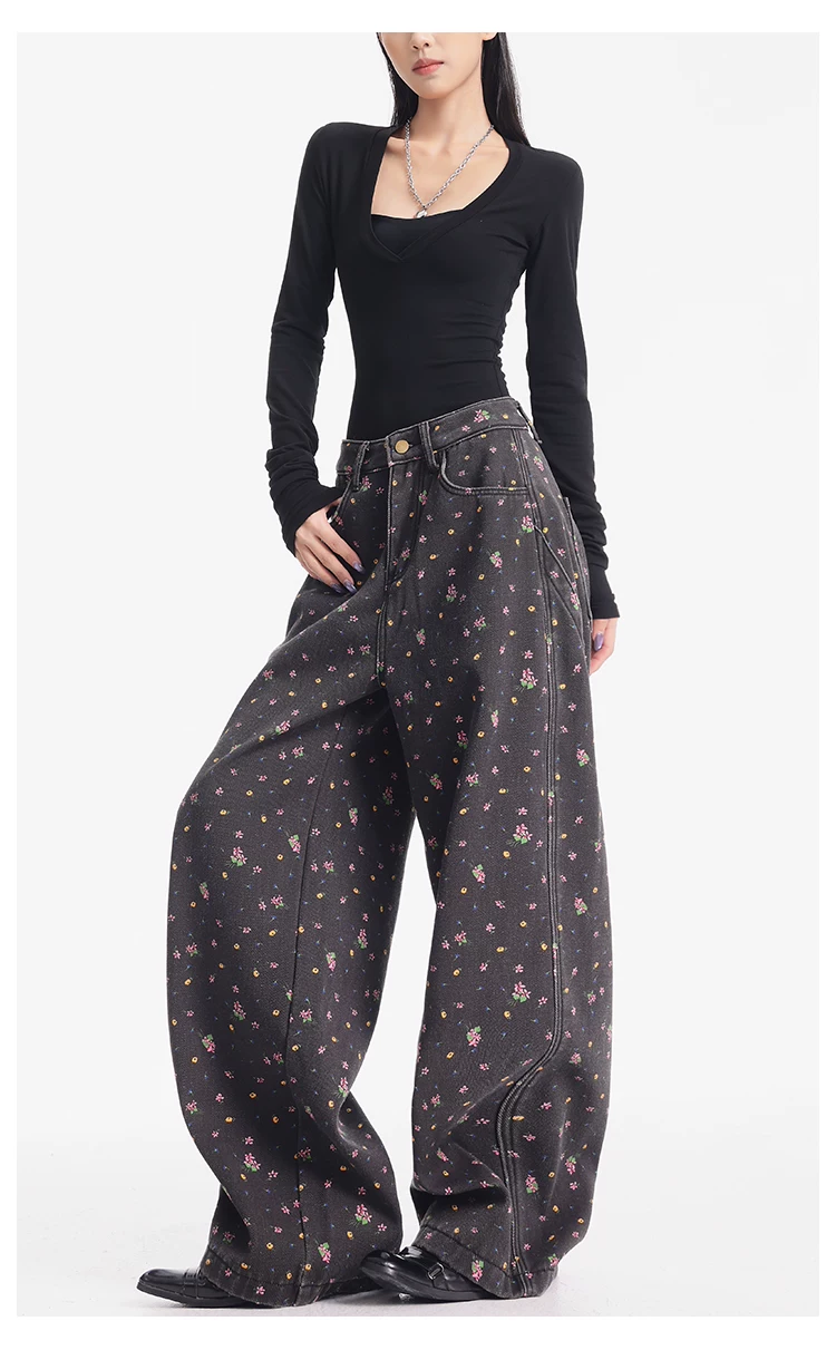 - KEN STUDIO quần jean ống rộng họa tiết hoa cà phê đậm phong cách mới thu đông dành cho nữ, quần dài ống rộng dày dặn và lót lông cừu.