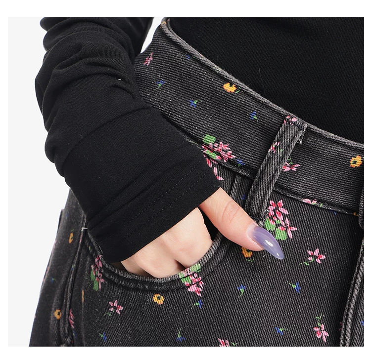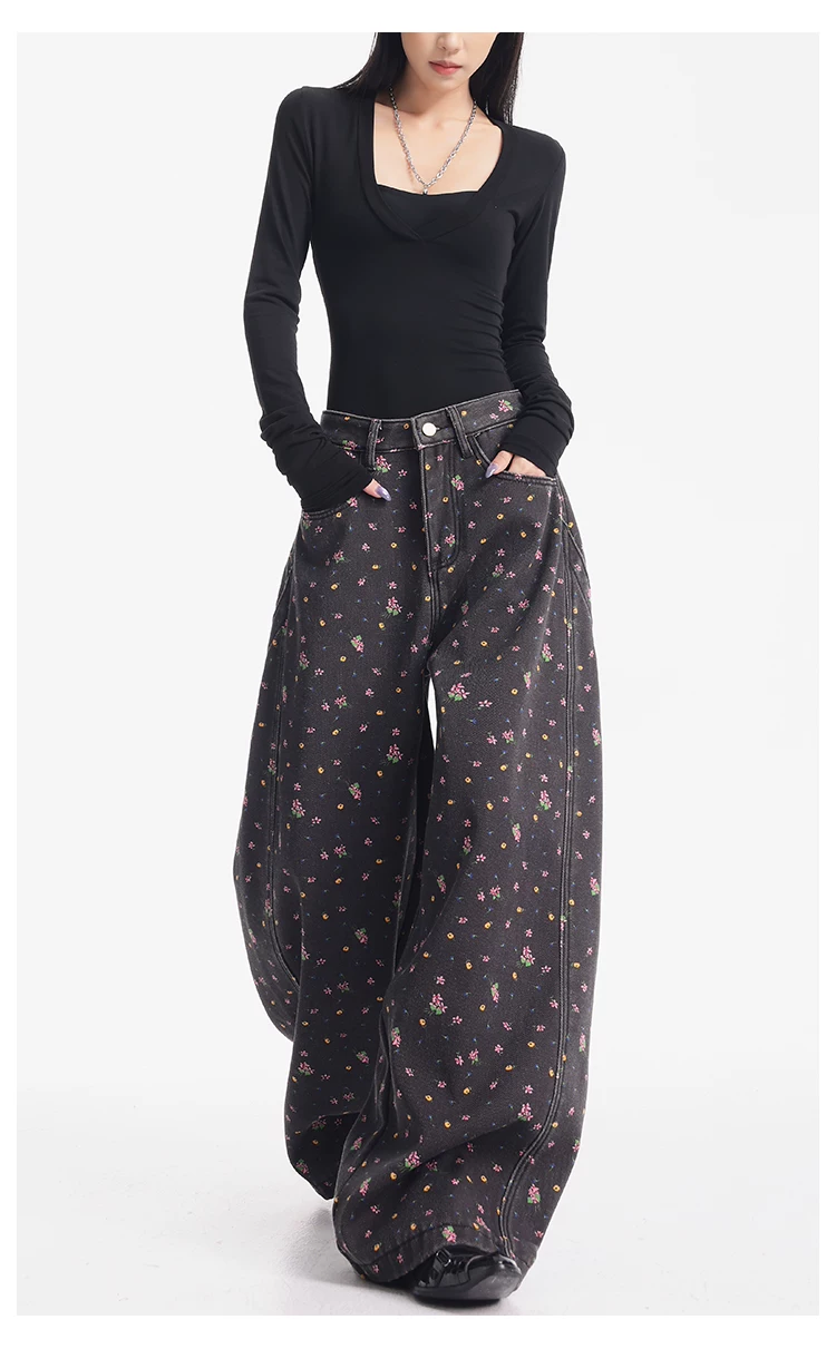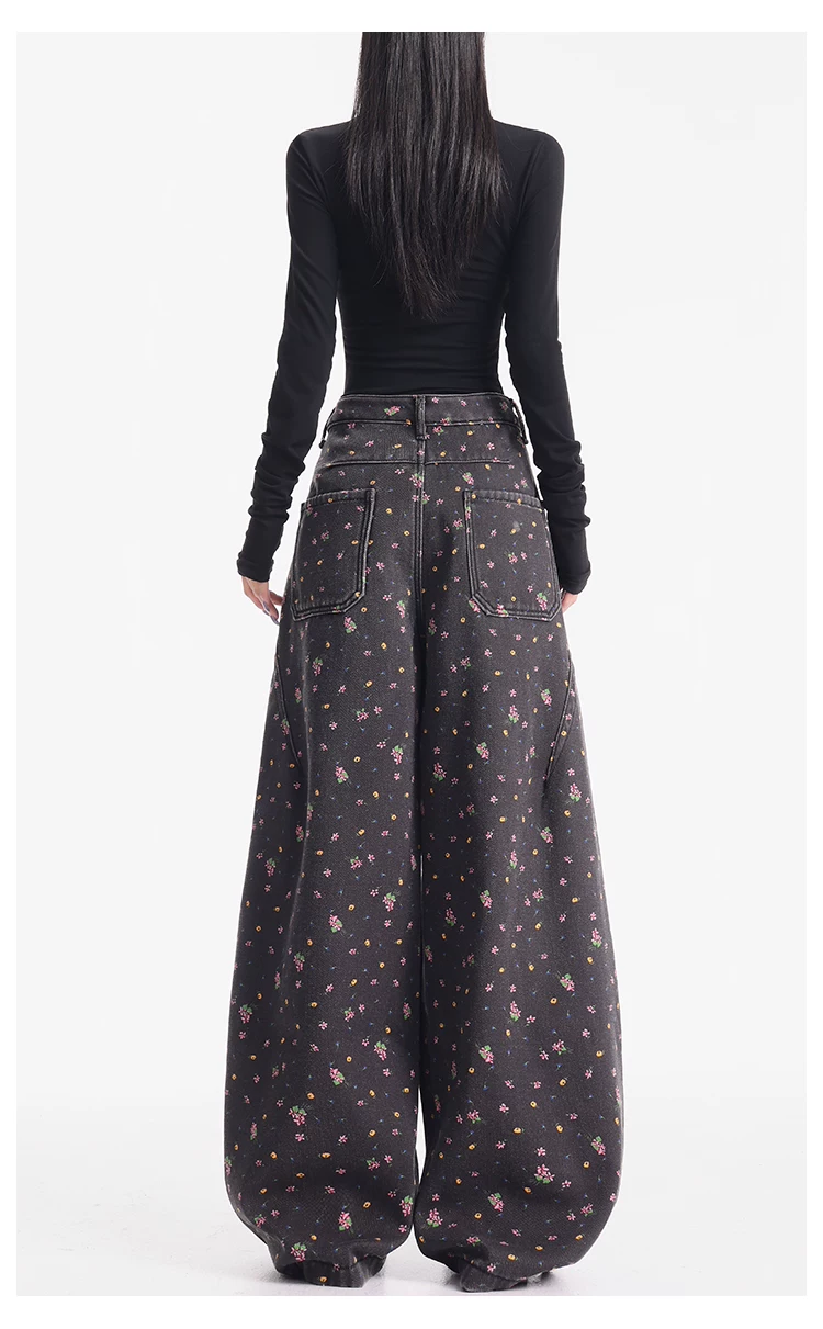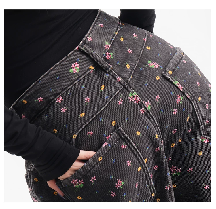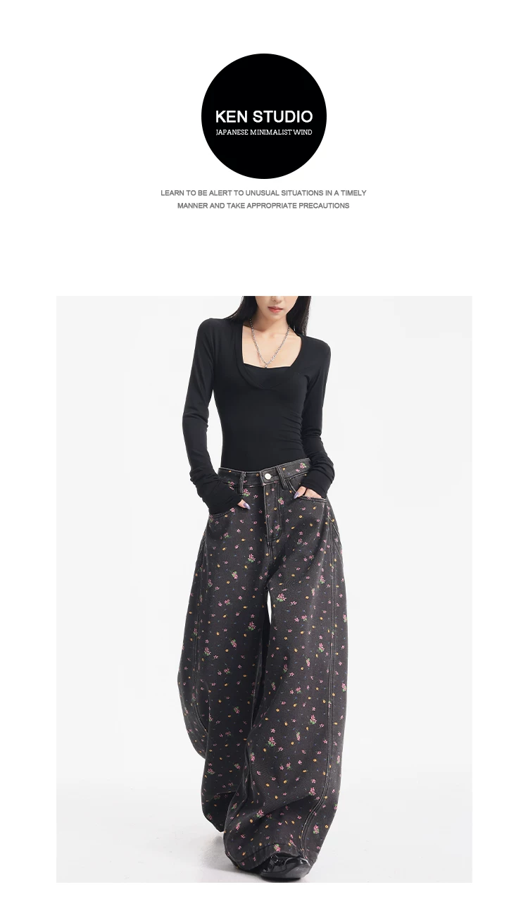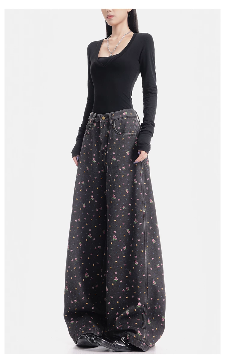 - KEN STUDIO quần jean ống rộng họa tiết hoa cà phê đậm phong cách mới thu đông dành cho nữ, quần dài ống rộng dày dặn và lót lông cừu.