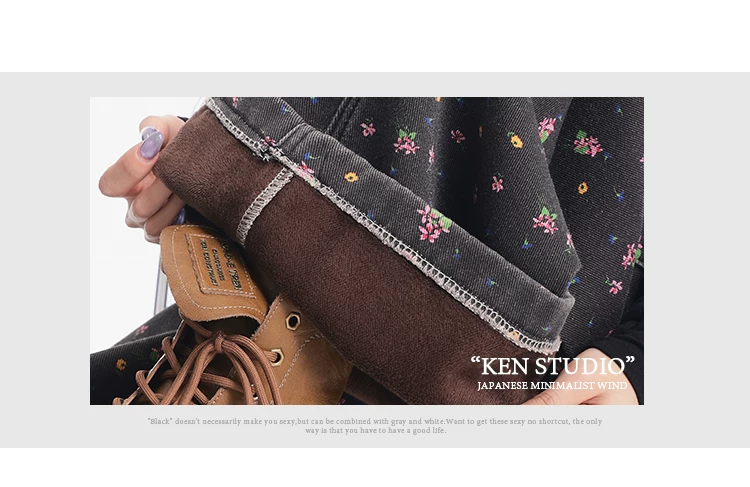 KEN STUDIO quần jean ống rộng họa tiết hoa cà phê đậm phong cách mới thu đông dành cho nữ, quần dài ống rộng dày dặn và lót lông cừu.