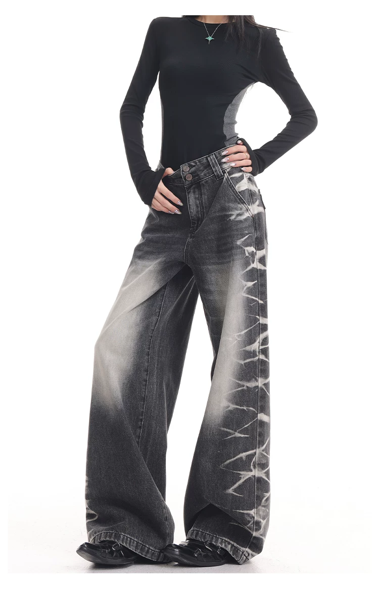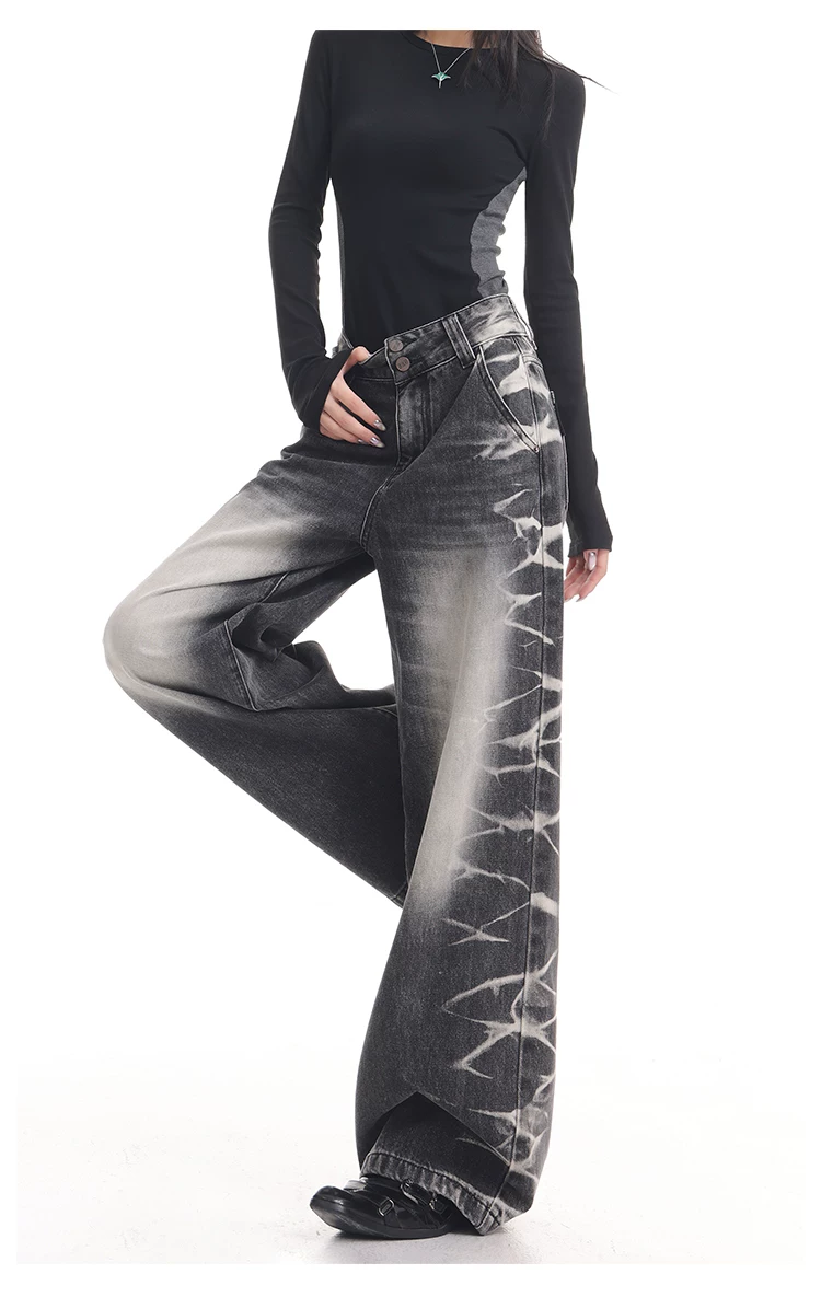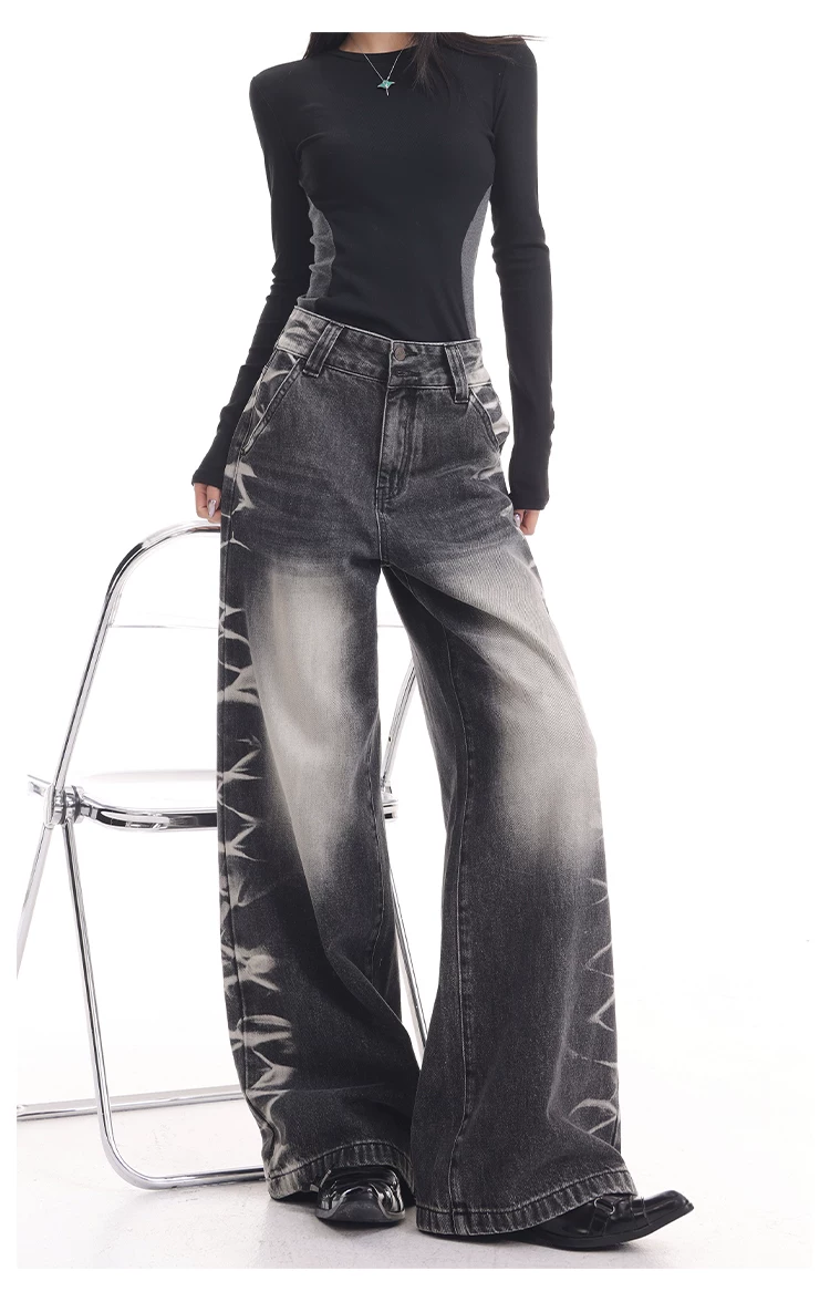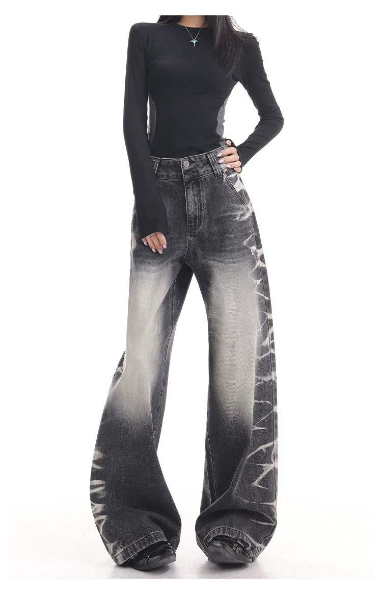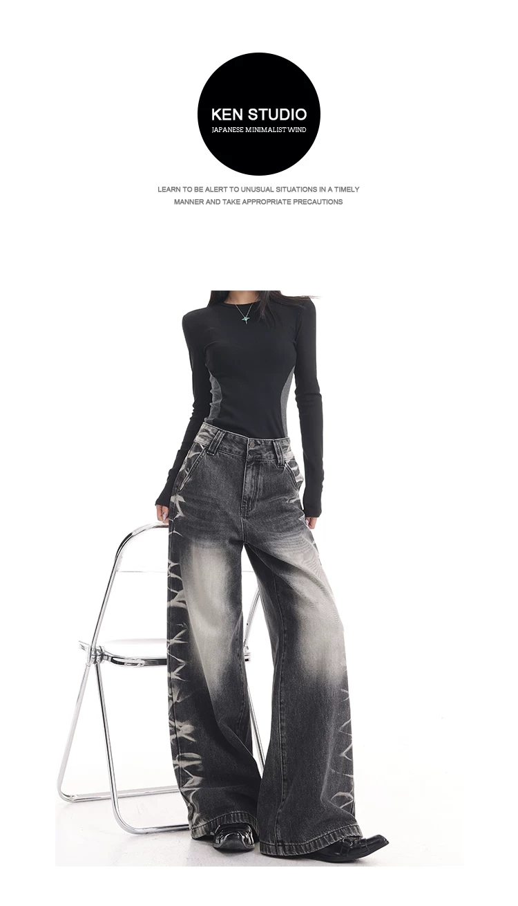 - KEN STUDIO quần jean ống rộng màu đen cổ điển mới mùa thu đông dành cho nữ, quần dài màu phối màu đã qua xử lý, quần dài rộng đến sàn