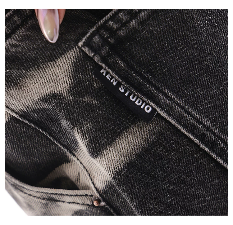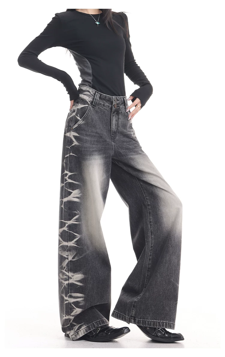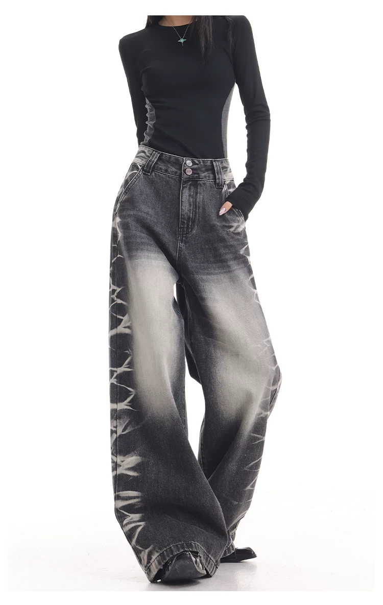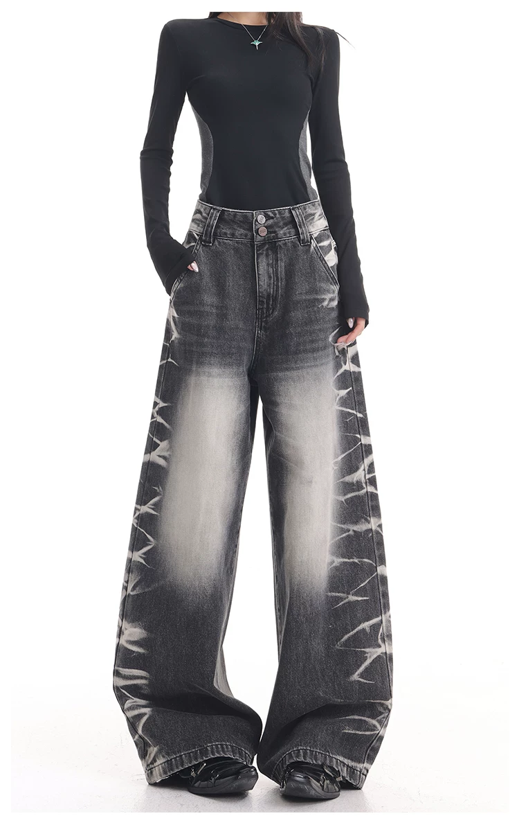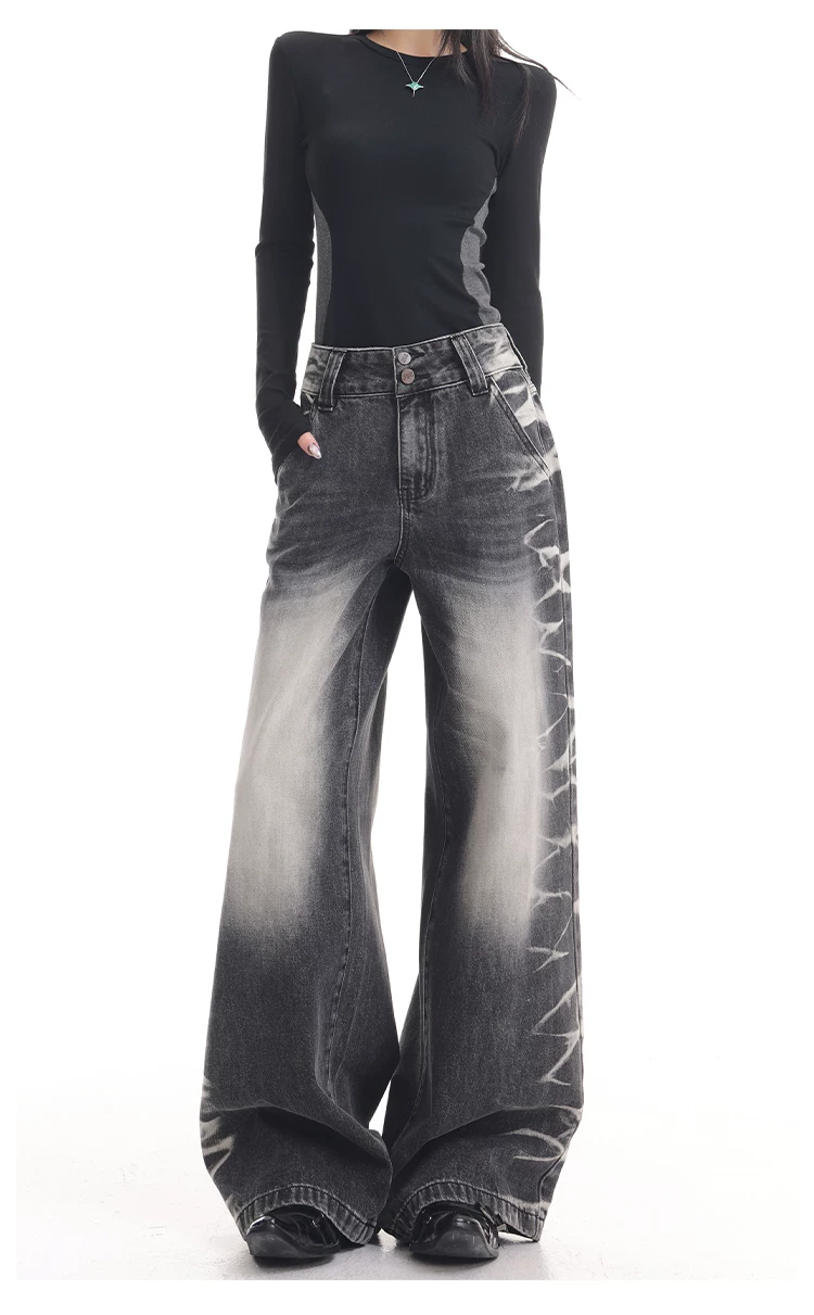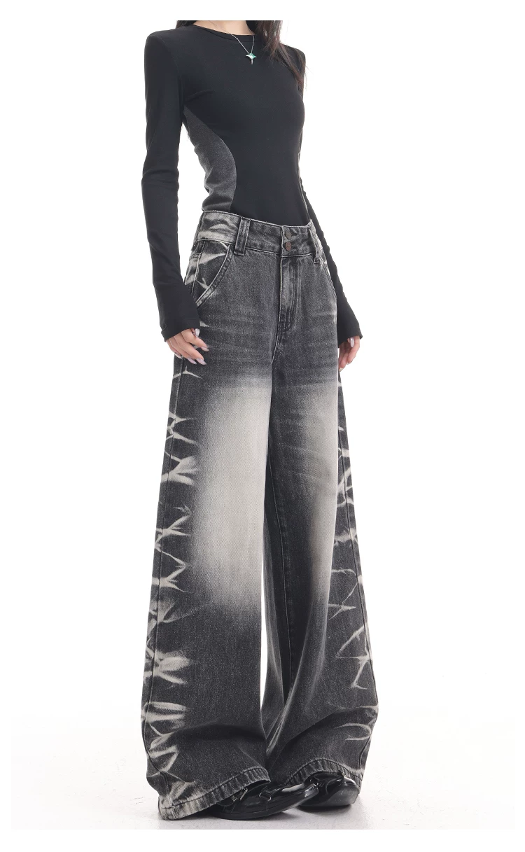 - KEN STUDIO quần jean ống rộng màu đen cổ điển mới mùa thu đông dành cho nữ, quần dài màu phối màu đã qua xử lý, quần dài rộng đến sàn