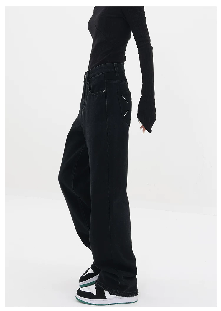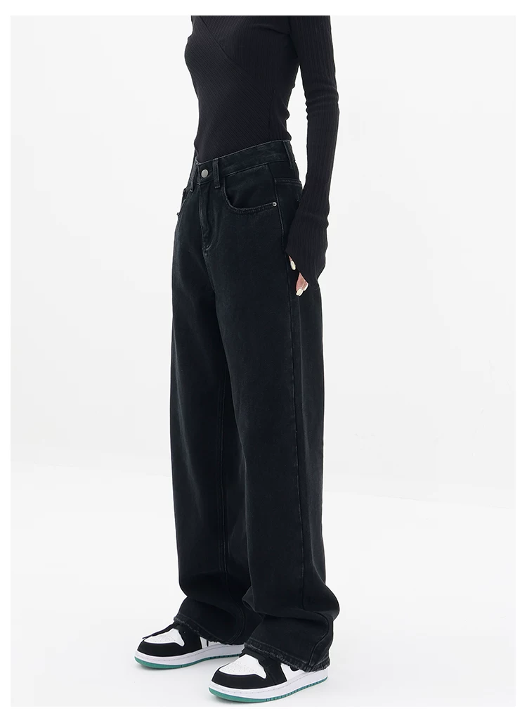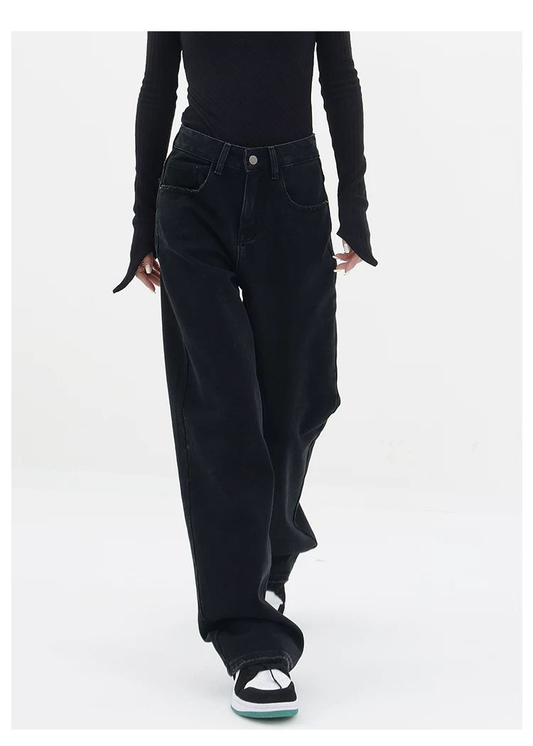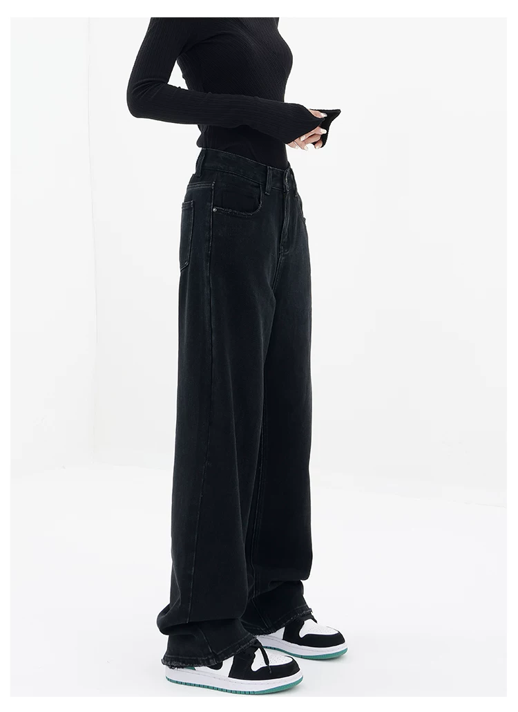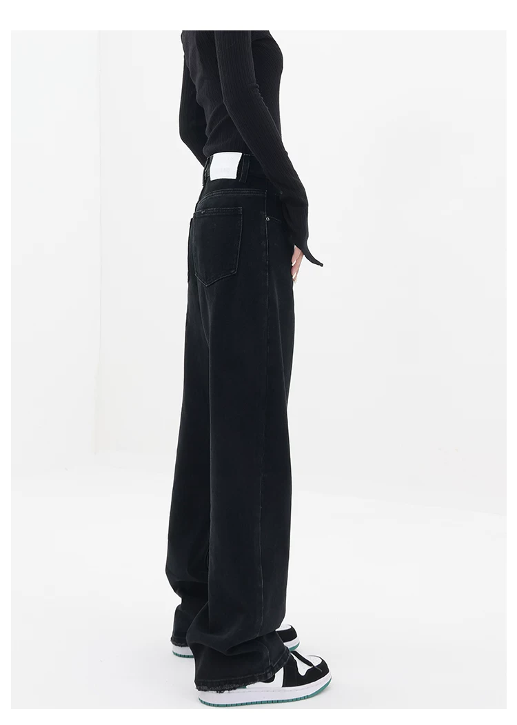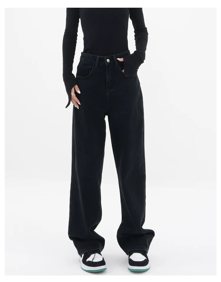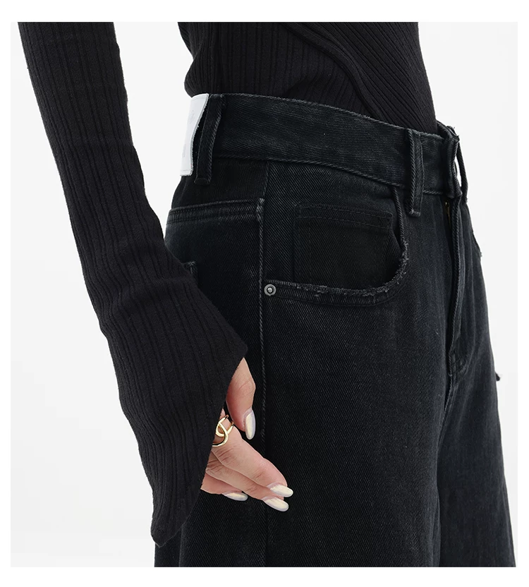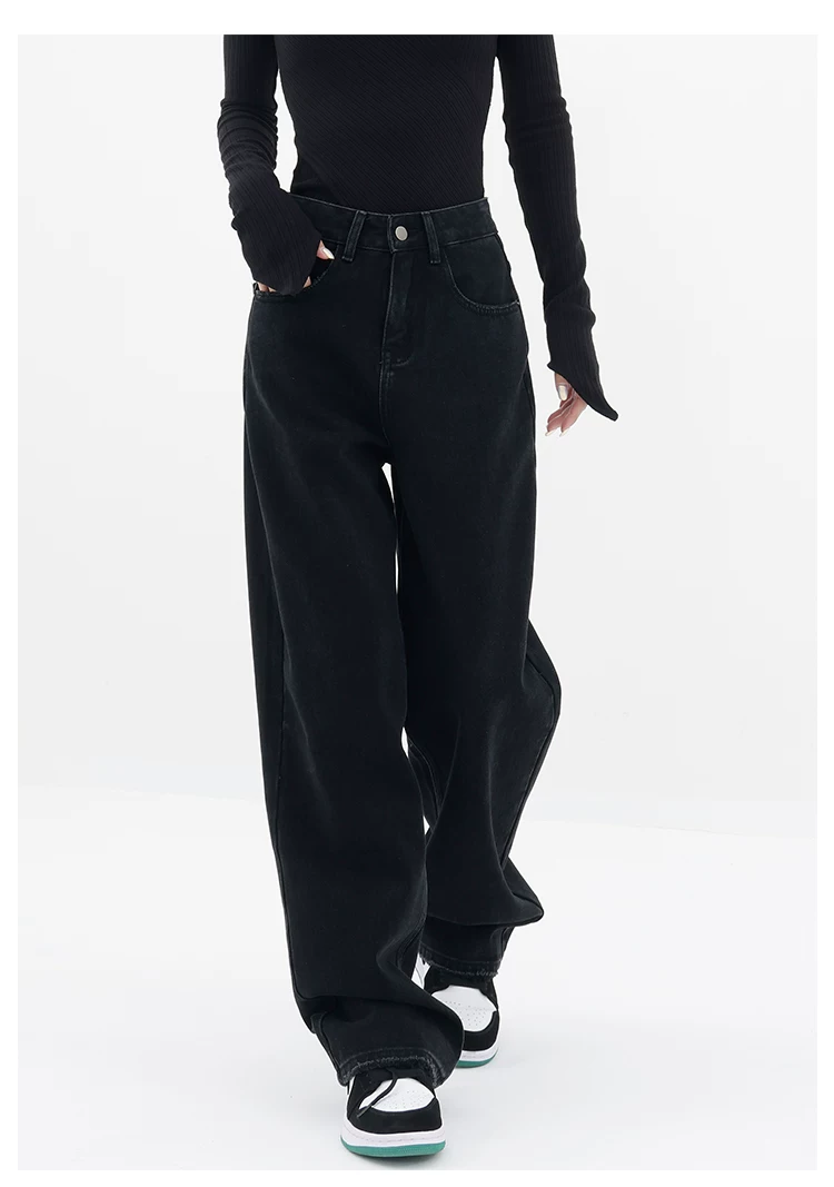 - KEN STUDIO Quần jean ống rộng màu đen lót lông cừu mùa thu đông dành cho nữ, quần ống đứng cạp cao, quần dài, quần thường ngày.