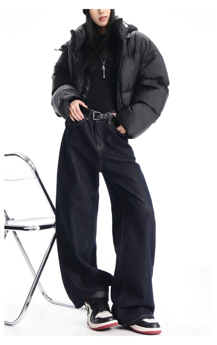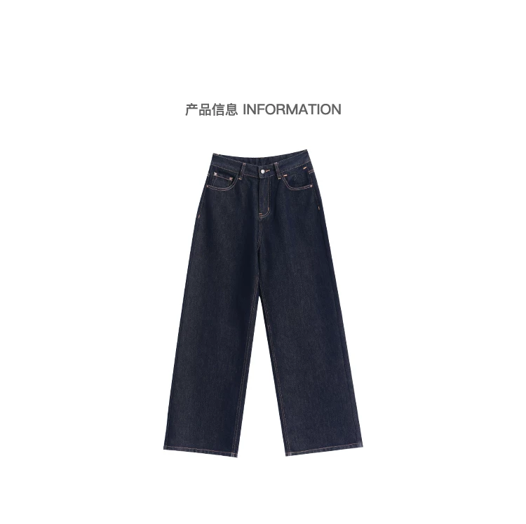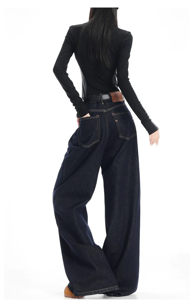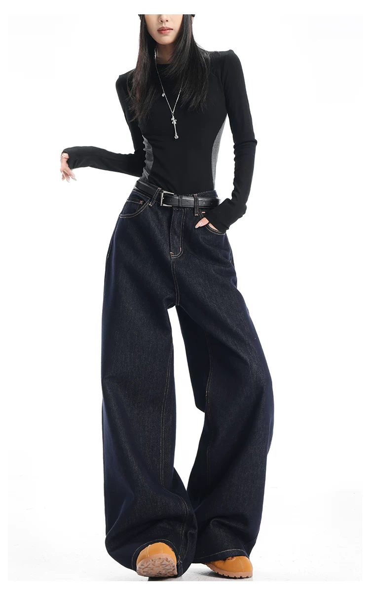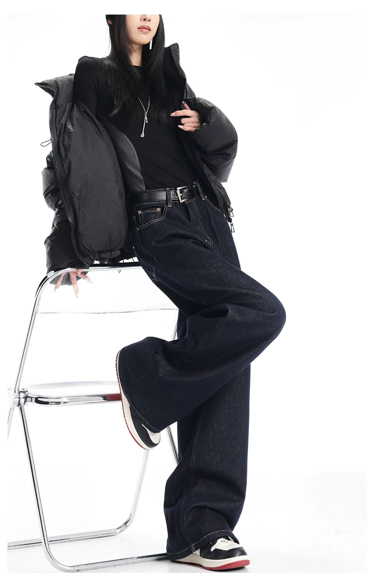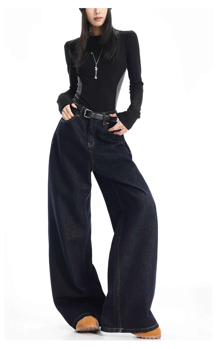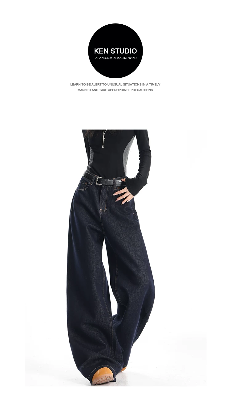 - KEN STUDIO quần jean ống rộng màu xanh đậm có lót lông cừu mùa thu đông dành cho nữ quần dài ống rộng lưng cao dáng rộng