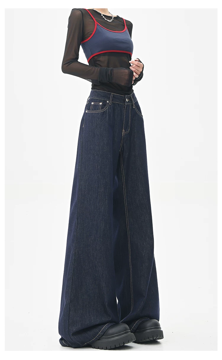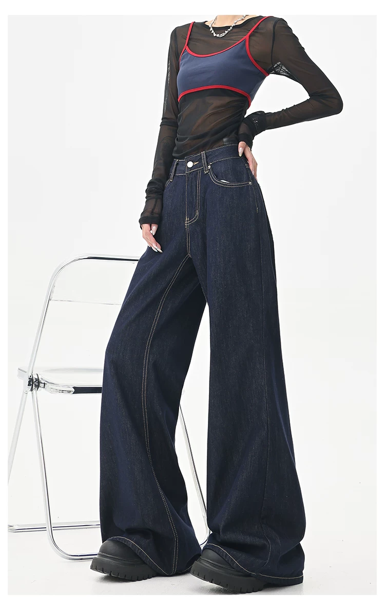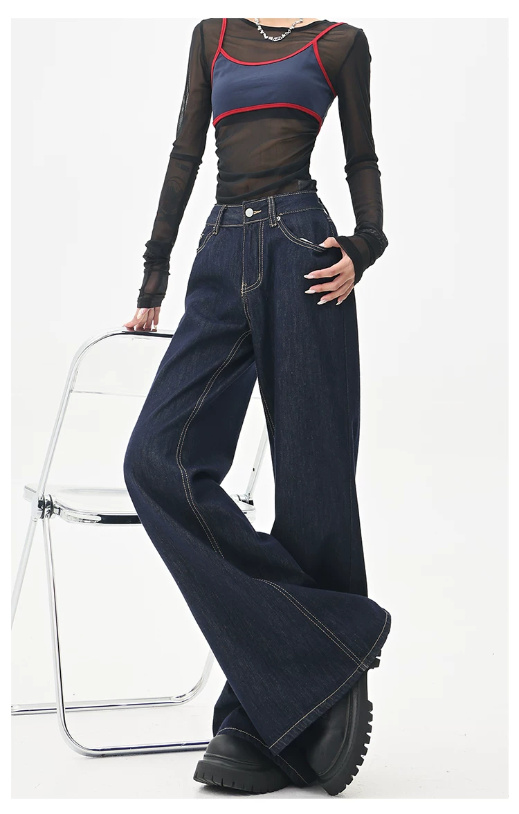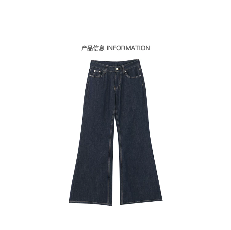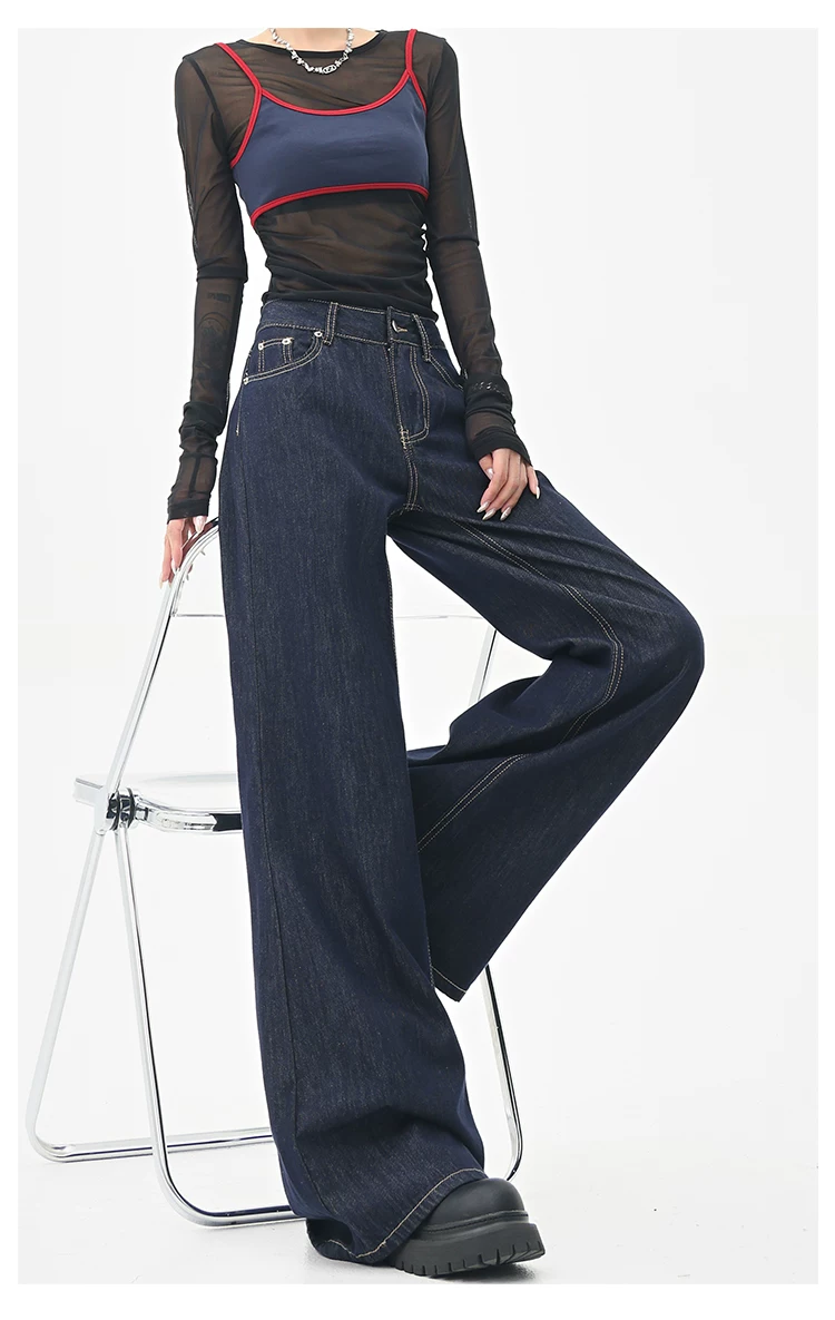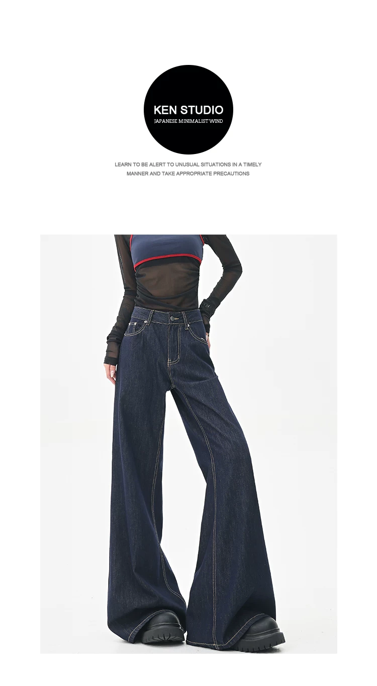 - KEN STUDIO Quần jean ống rộng màu xanh đậm theo phong cách retro của Mỹ dành cho nữ, quần ống rộng cạp cao kiểu dáng mùa hè mới, quần ống rộng dáng thẳng