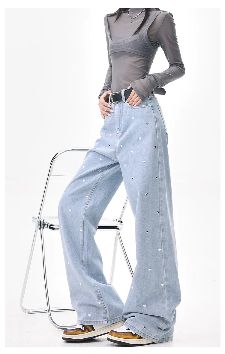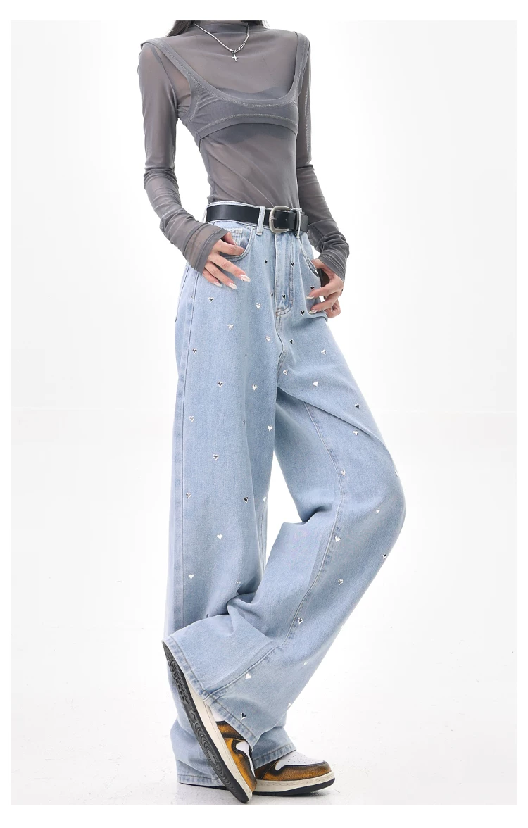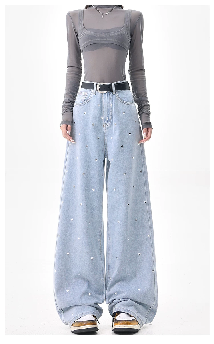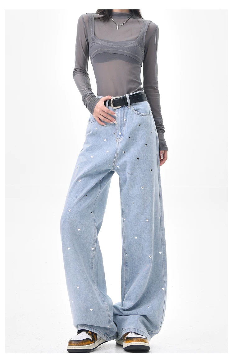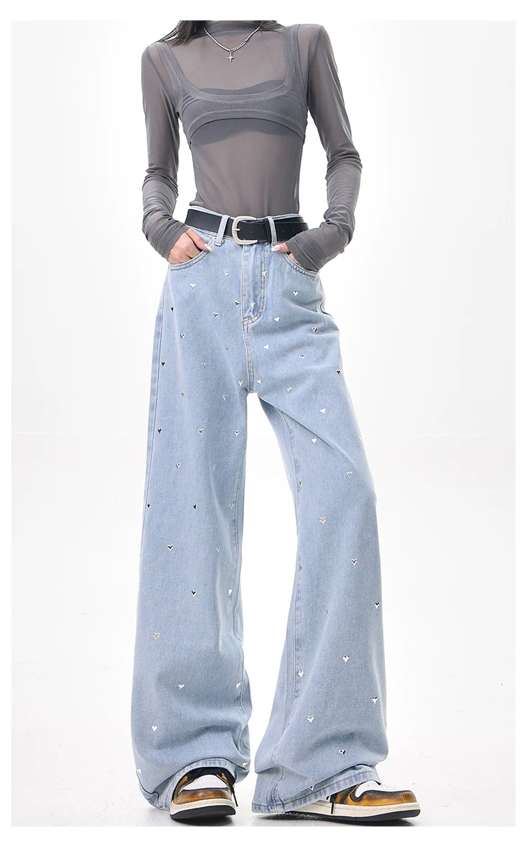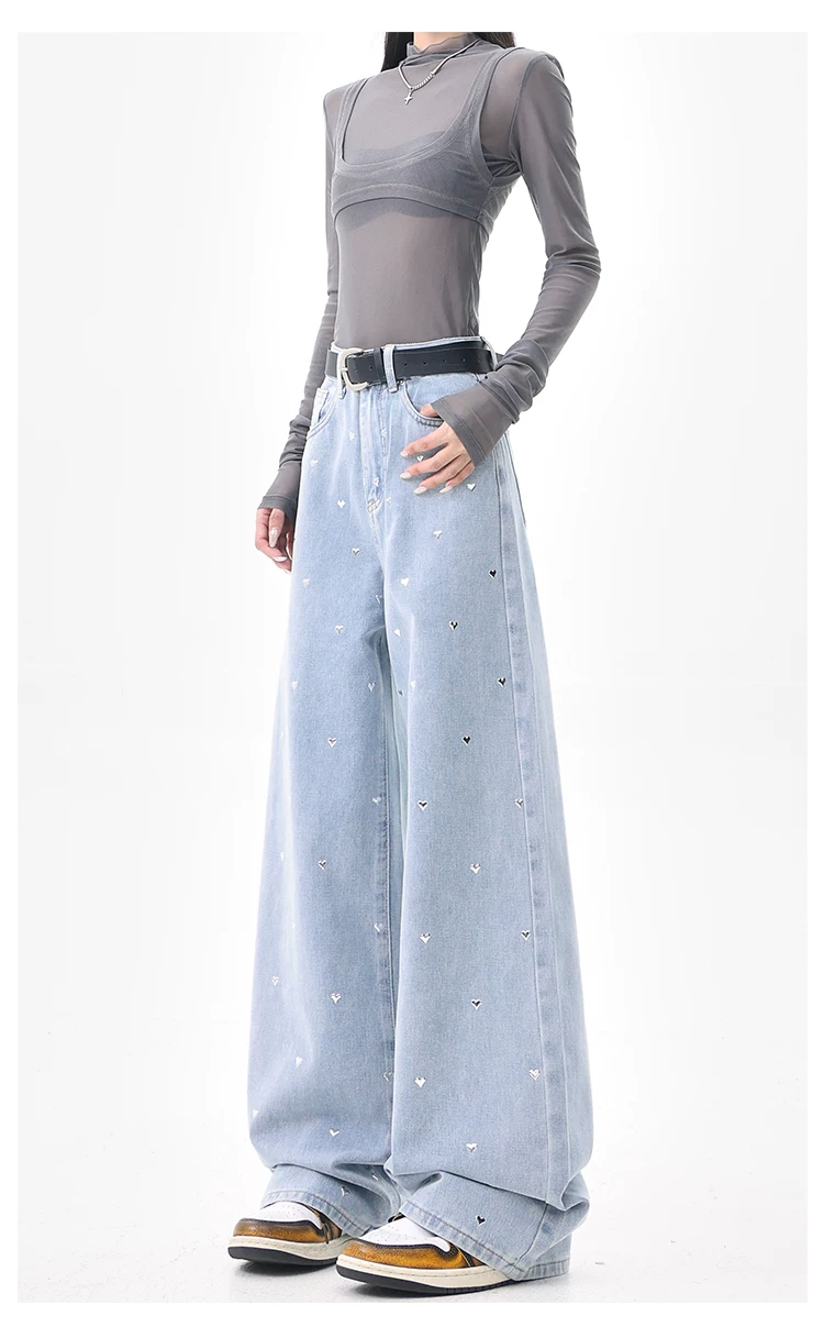 - KEN STUDIO quần jean ống rộng màu xanh lam cổ điển dành cho nữ mùa hè và mùa thu quần ống rộng dáng rộng thông thường