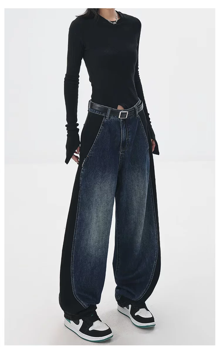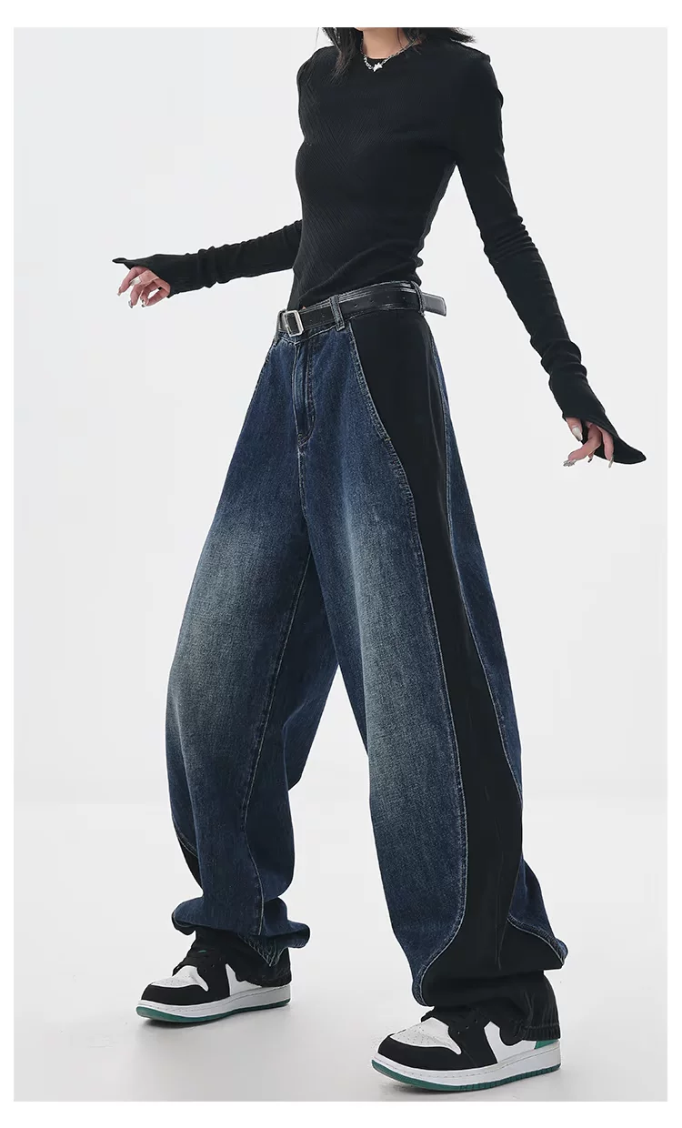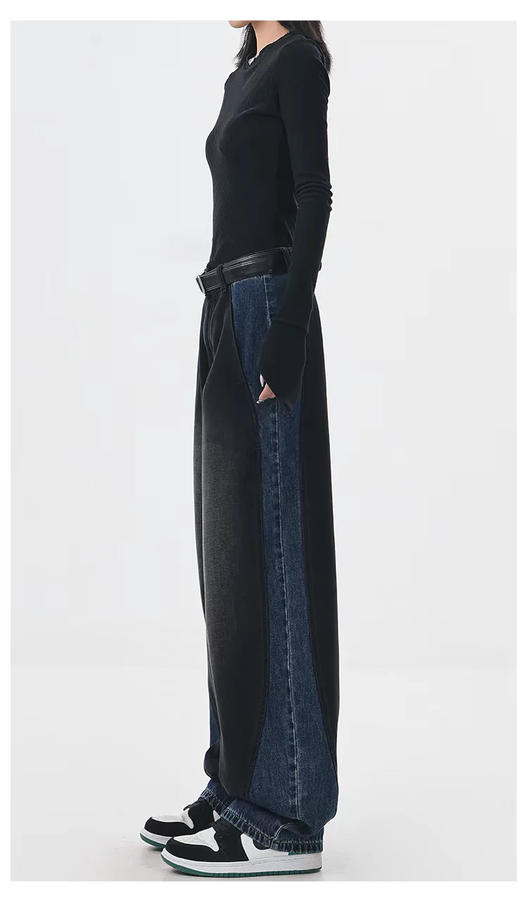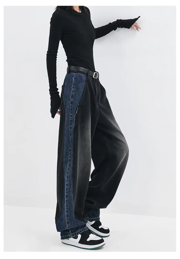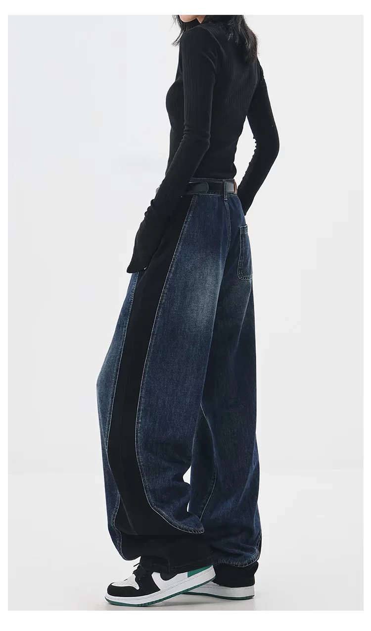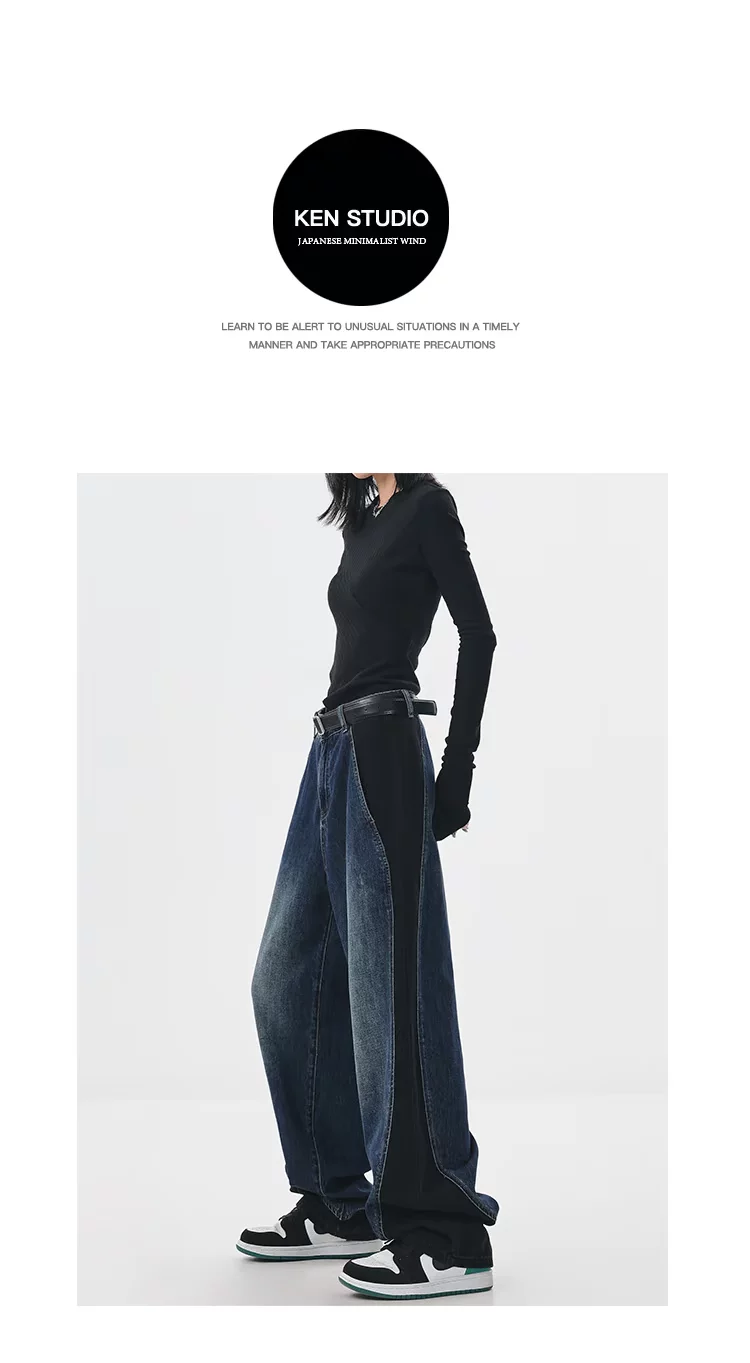 - KEN STUDIO quần jean phối màu chắp vá mùa thu đông mới dành cho nữ, quần ống rộng dáng rộng sành điệu, quần chuối