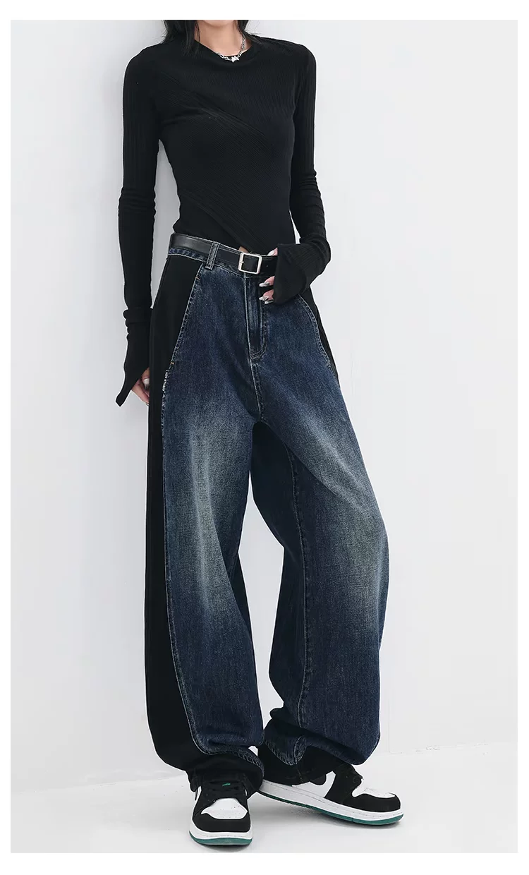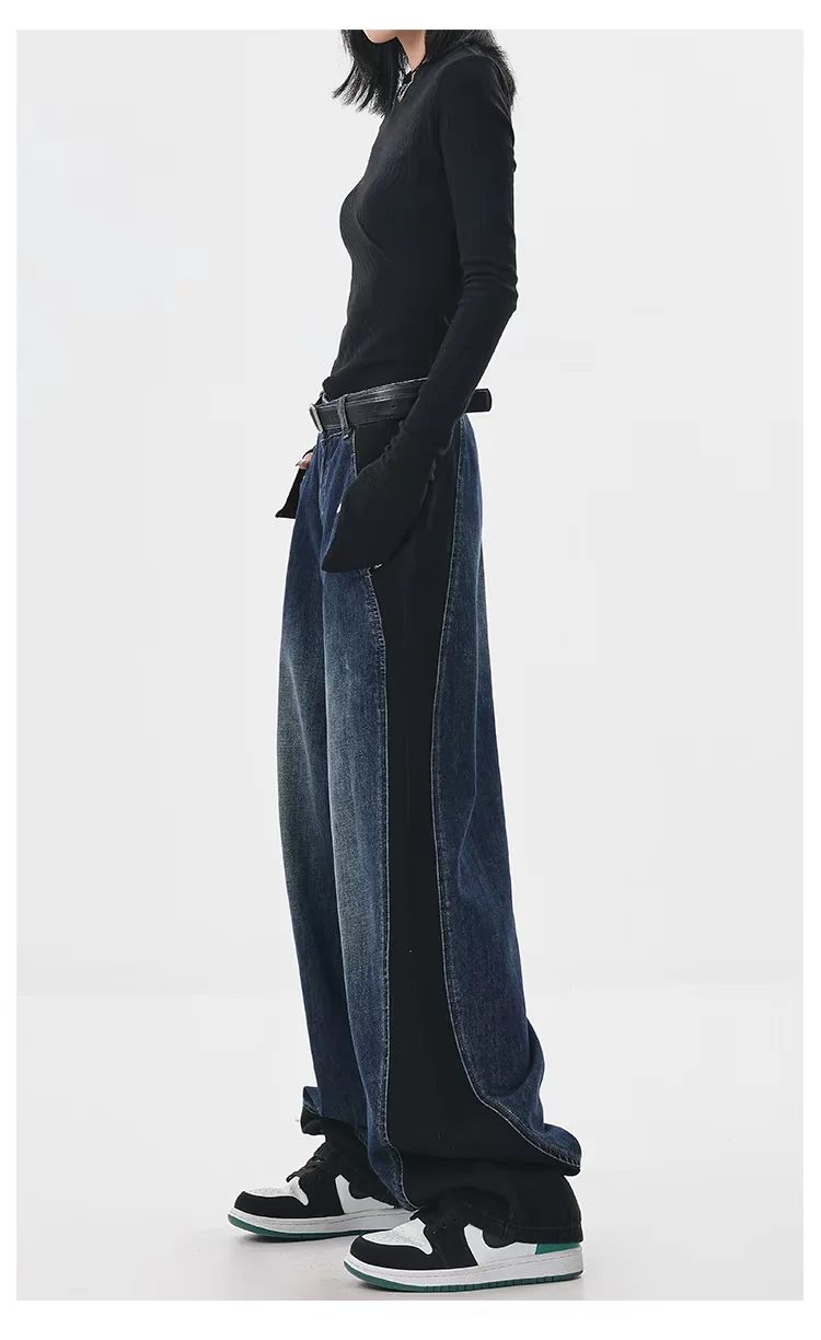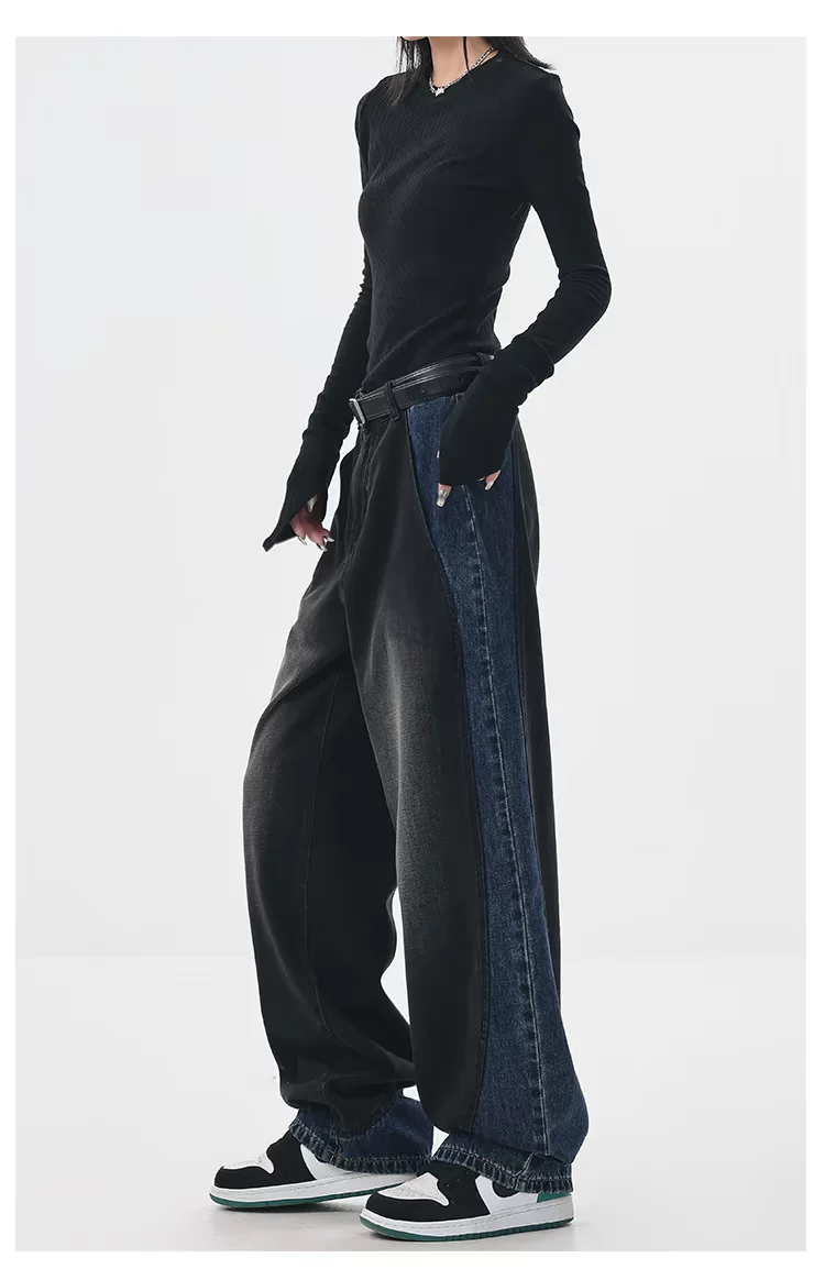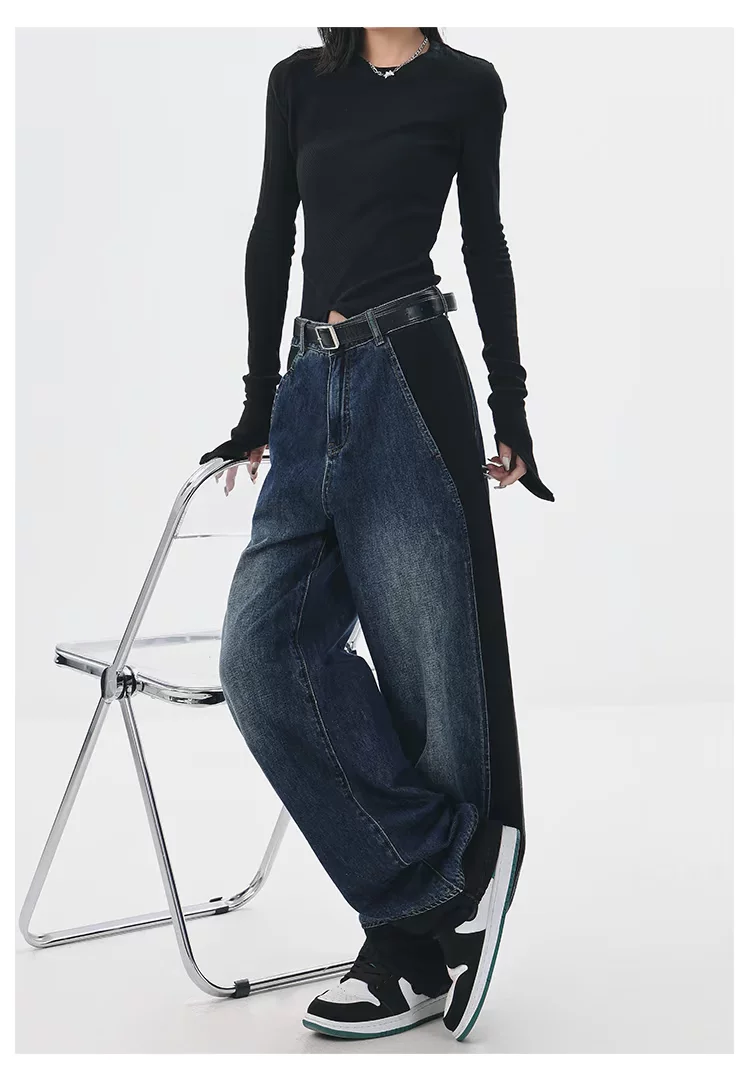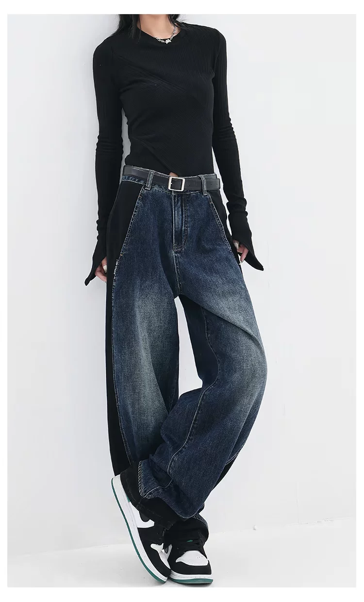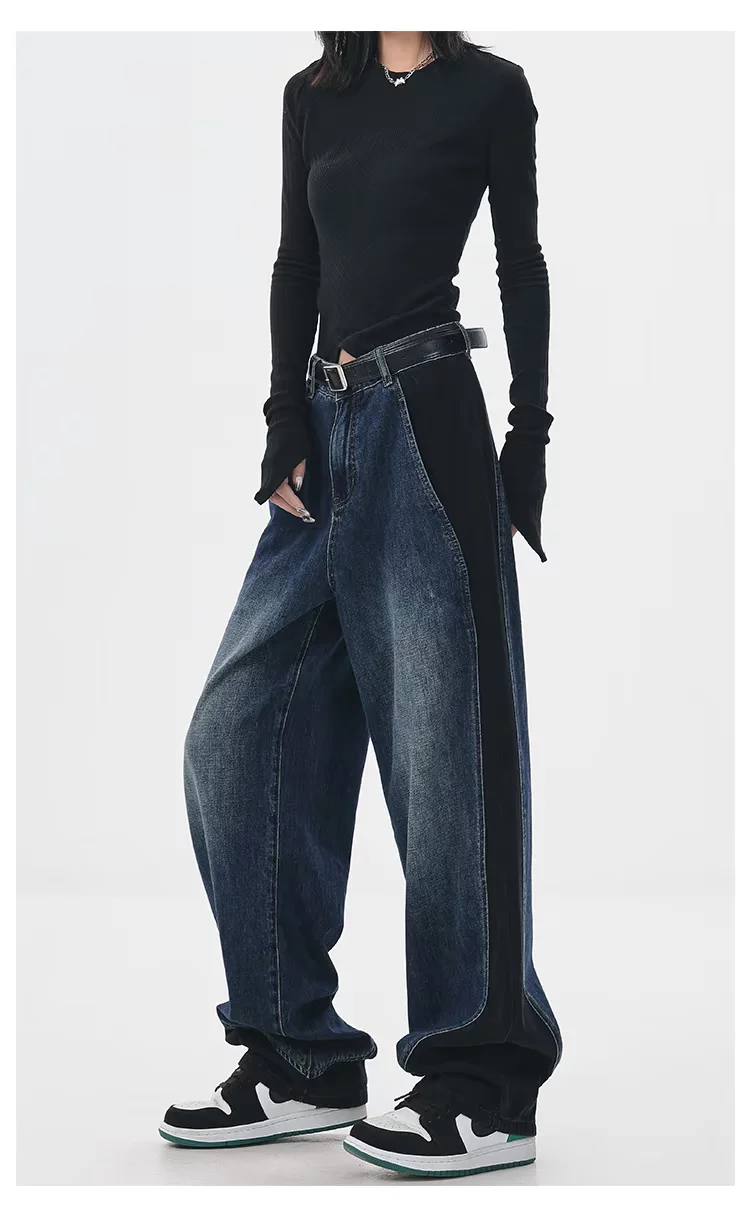- KEN STUDIO quần jean phối màu chắp vá mùa thu đông mới dành cho nữ, quần ống rộng dáng rộng sành điệu, quần chuối