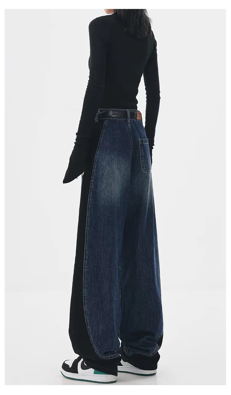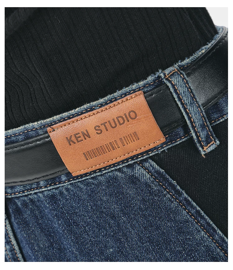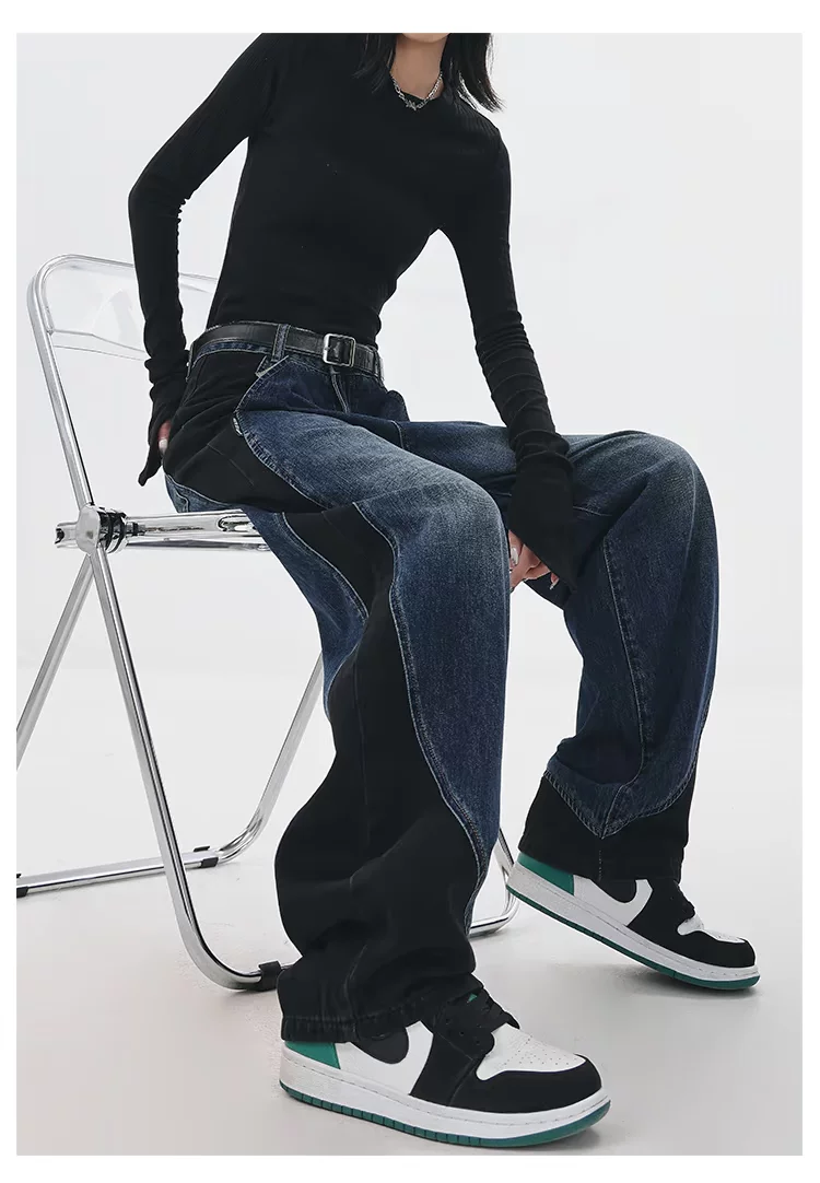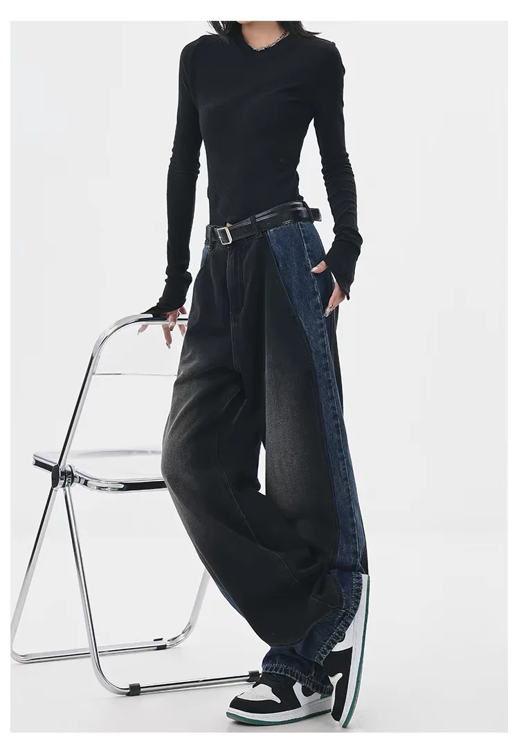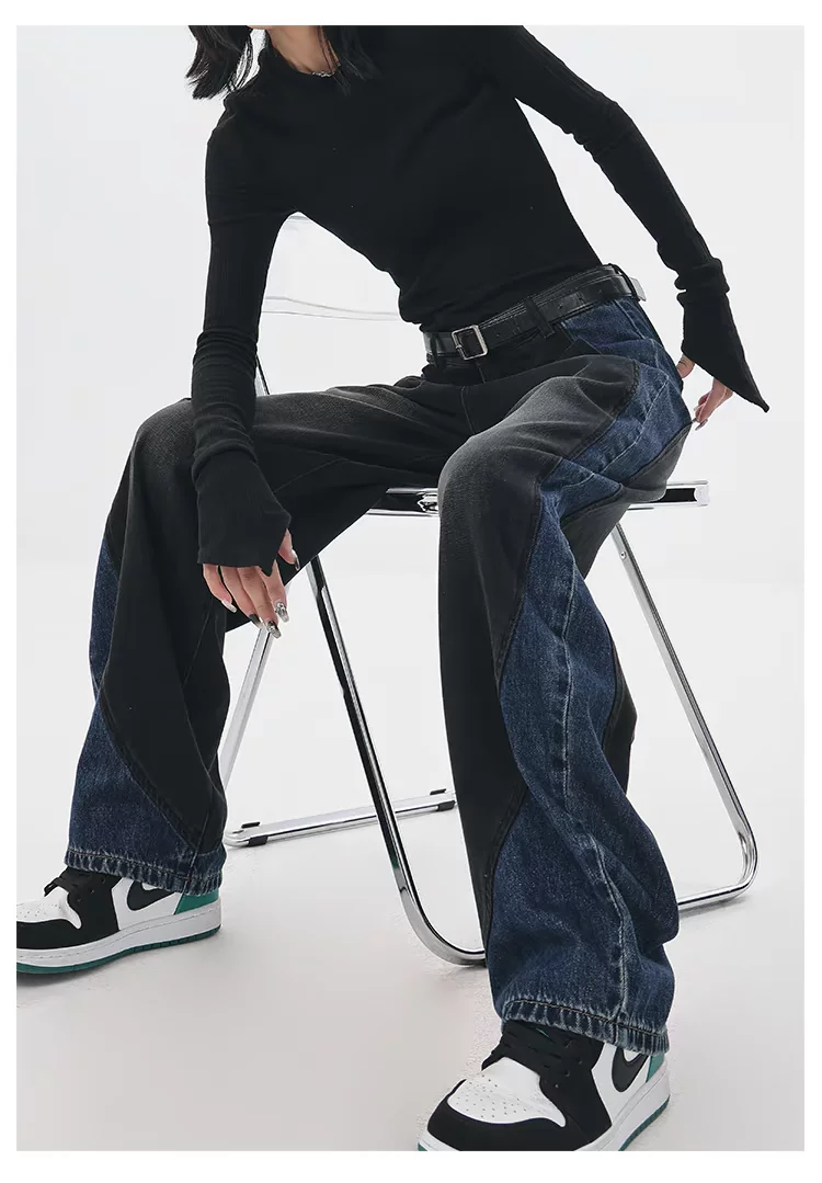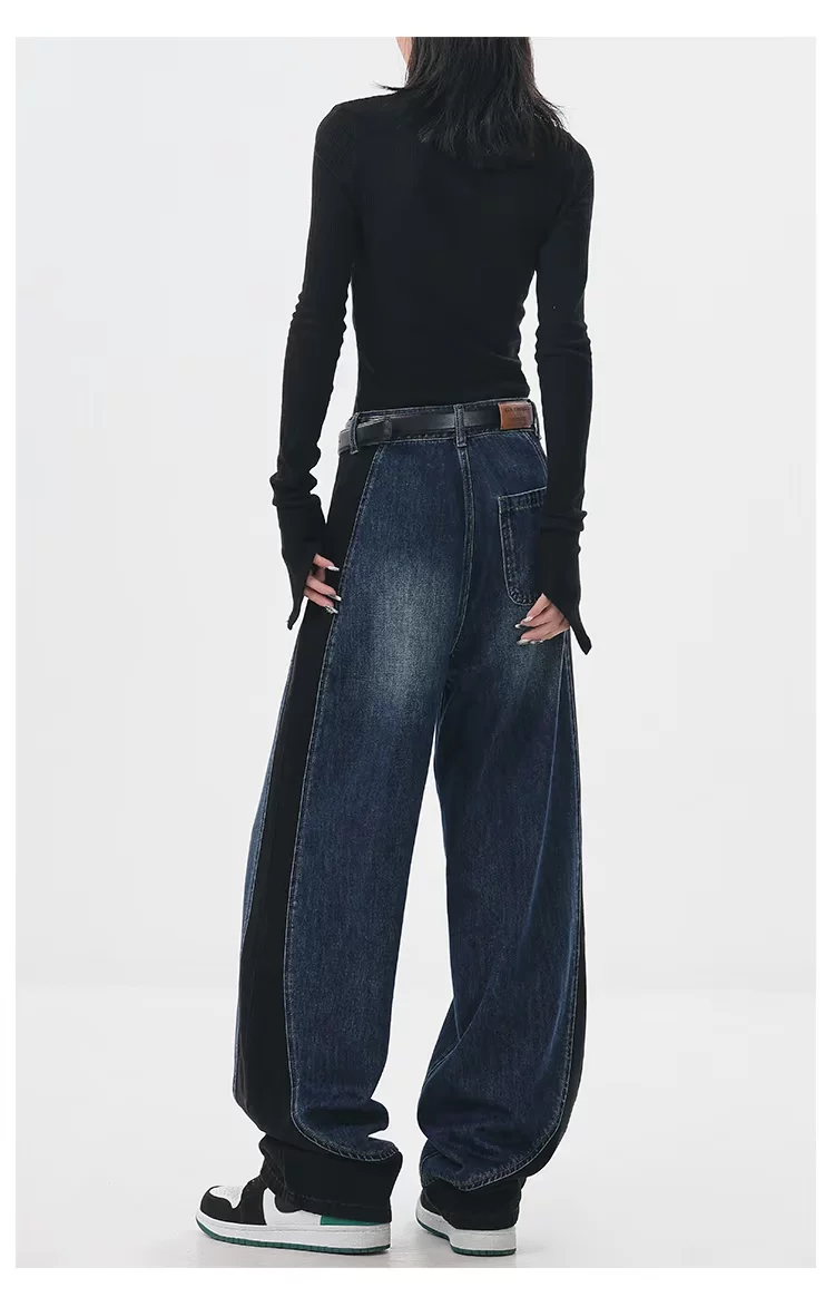 - KEN STUDIO quần jean phối màu chắp vá mùa thu đông mới dành cho nữ, quần ống rộng dáng rộng sành điệu, quần chuối