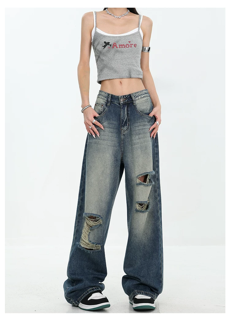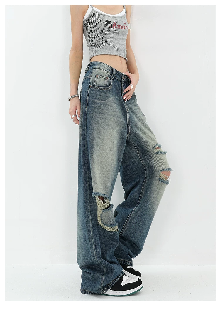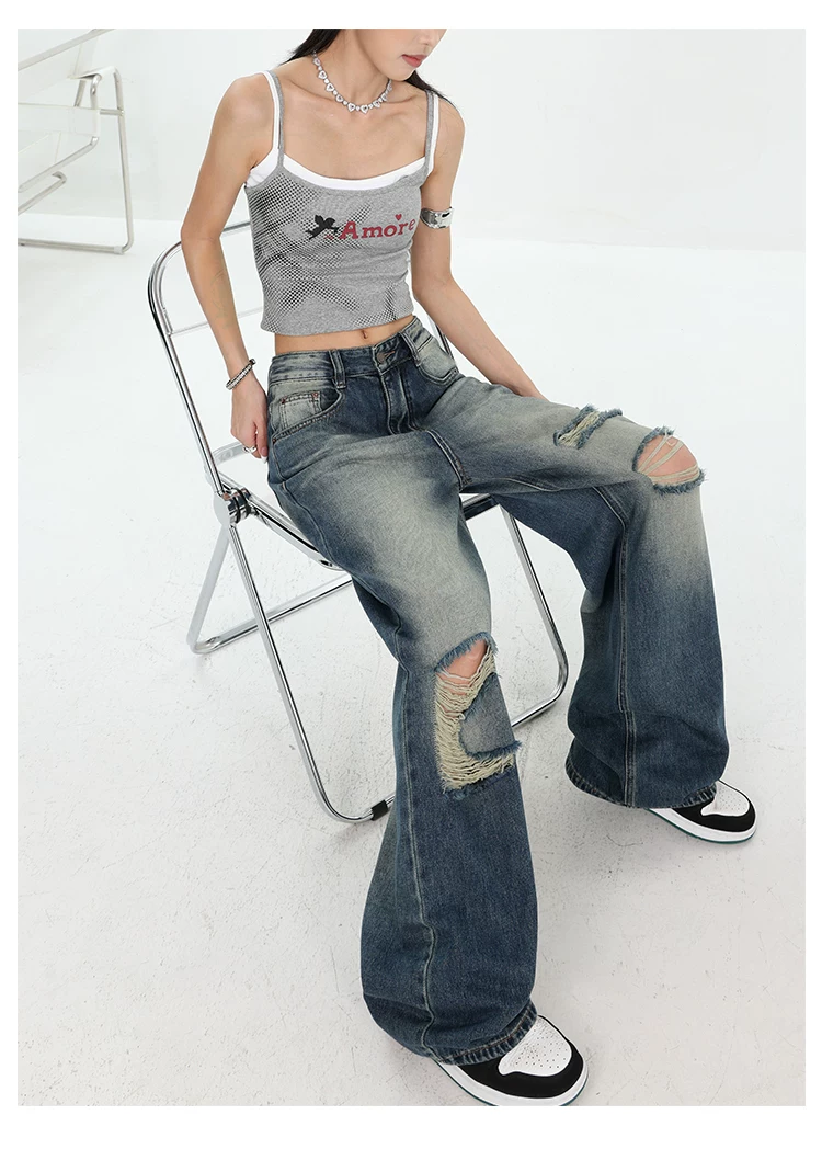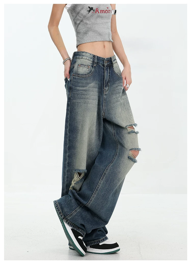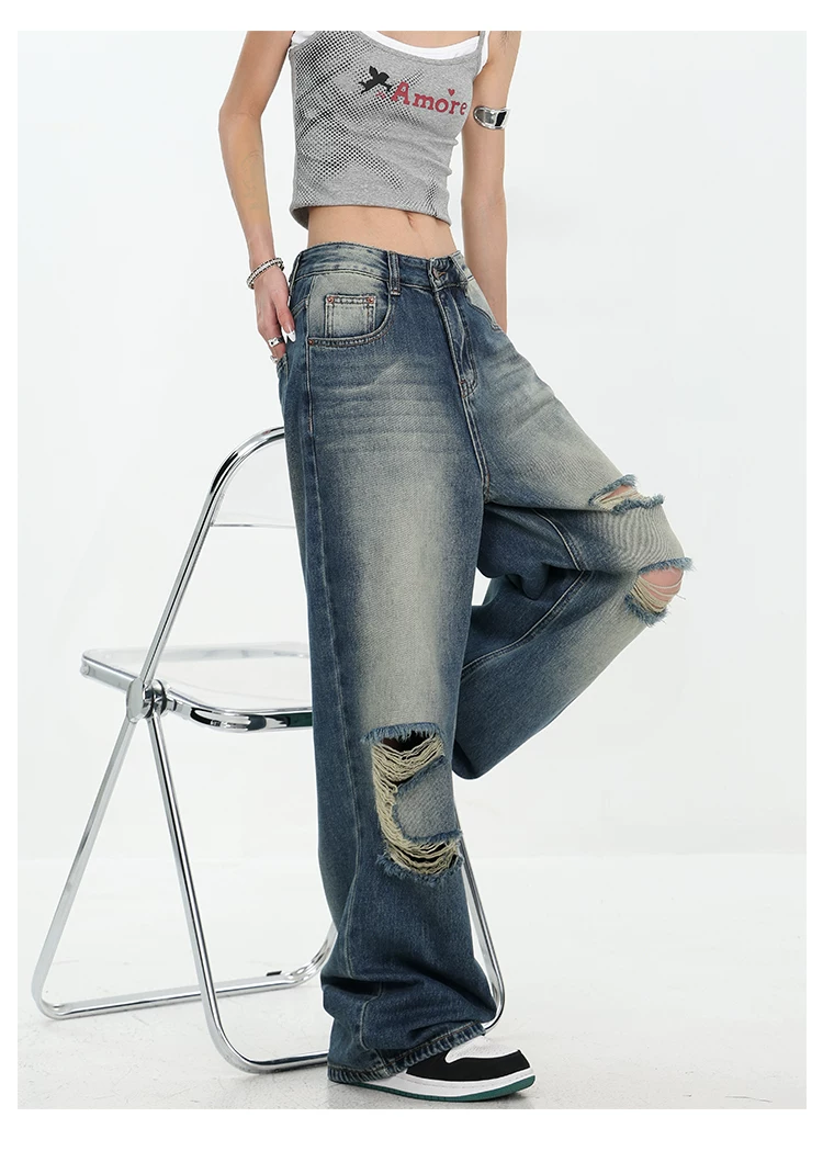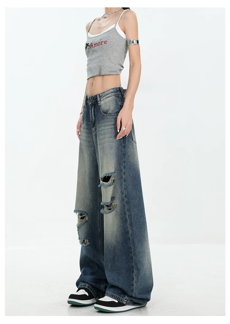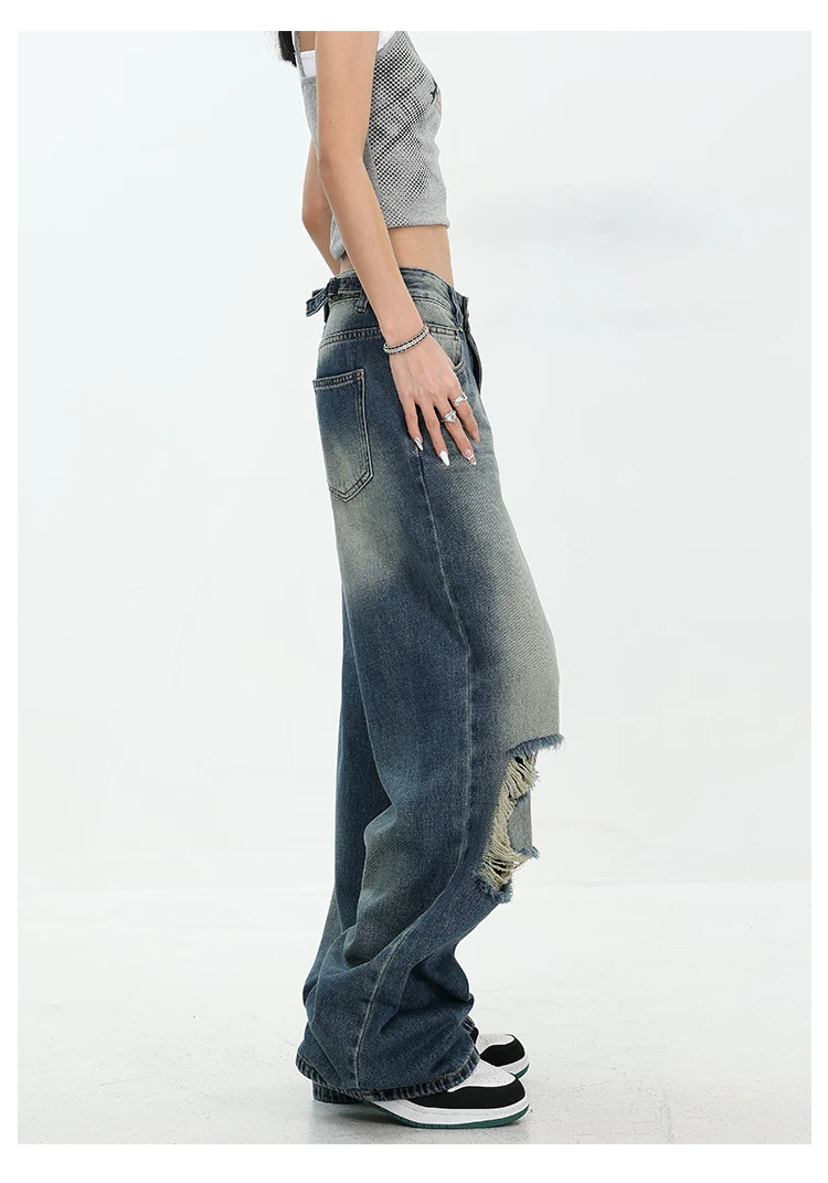 - KEN STUDIO Quần jean rách ống rộng màu trắng phong cách Mỹ dành cho nữ, phong cách mùa hè mới, quần dài xếp nếp và đa năng