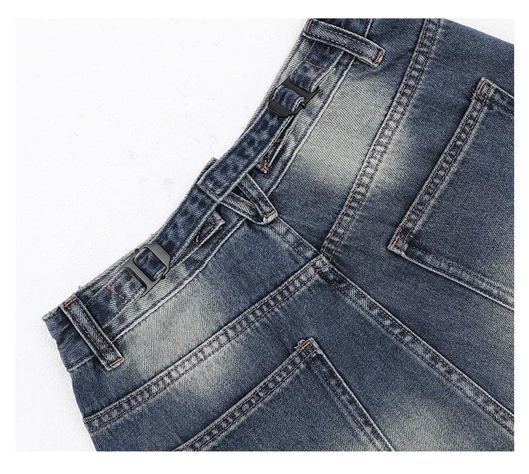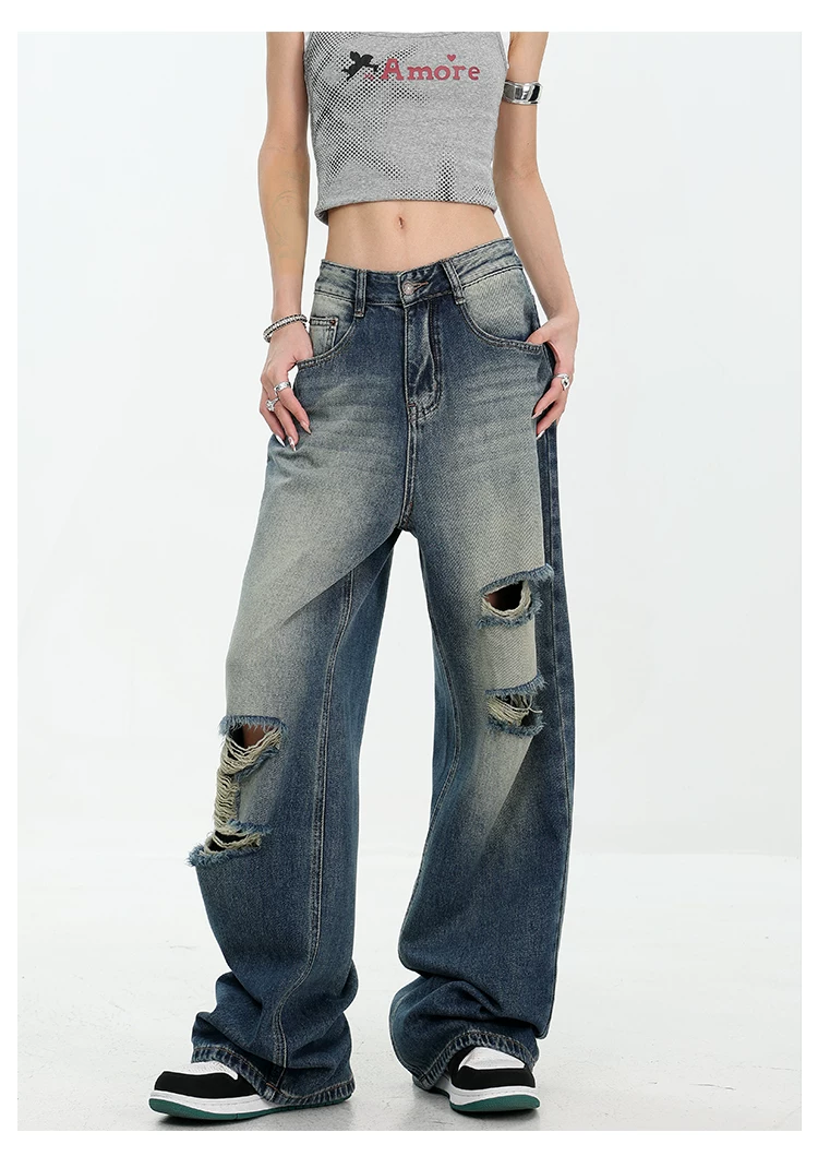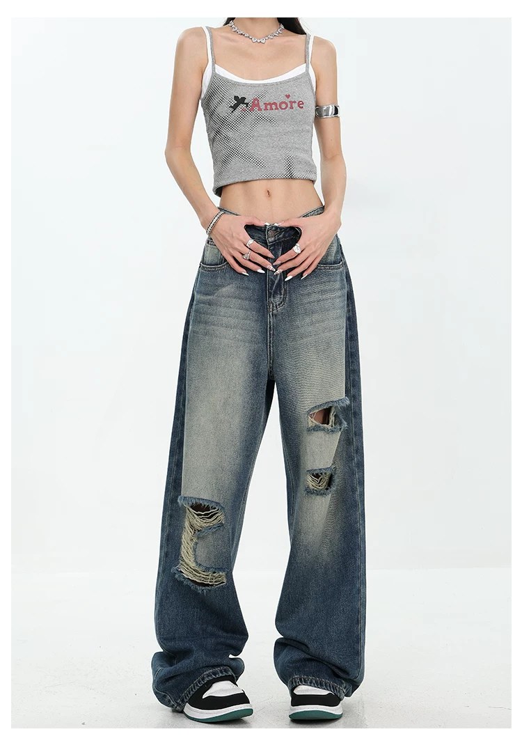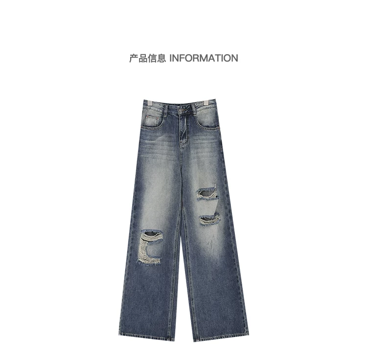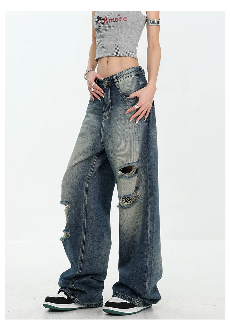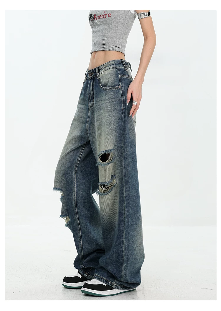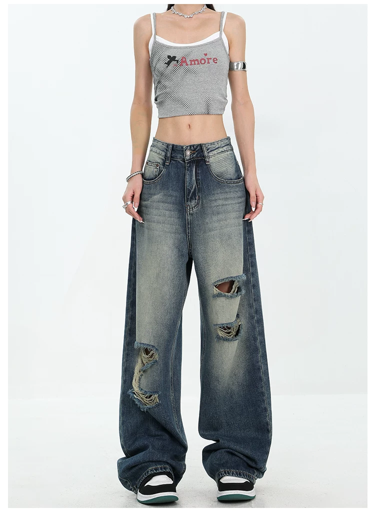 - KEN STUDIO Quần jean rách ống rộng màu trắng phong cách Mỹ dành cho nữ, phong cách mùa hè mới, quần dài xếp nếp và đa năng