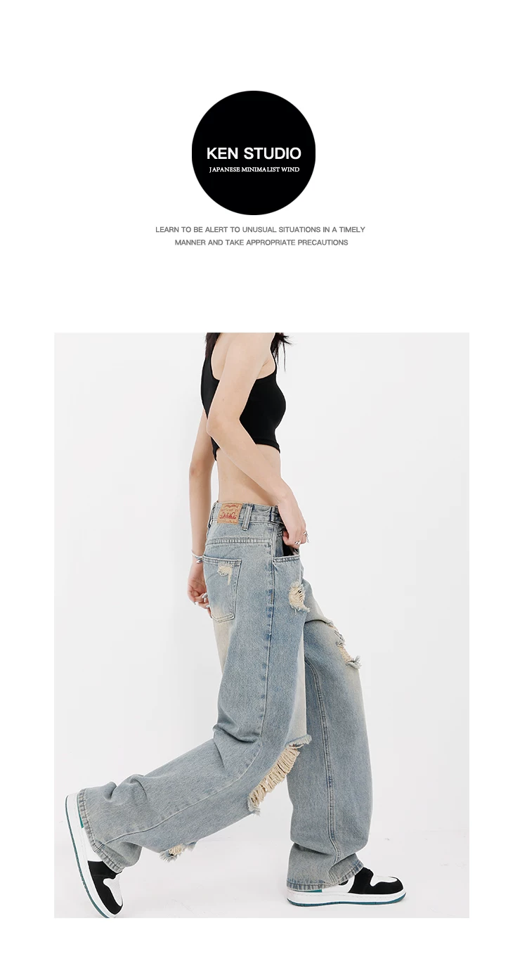 KEN STUDIO quần jean rách phối màu cho nữ, quần ống rộng dáng rộng dài đến sàn mùa xuân hè mới