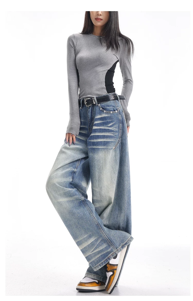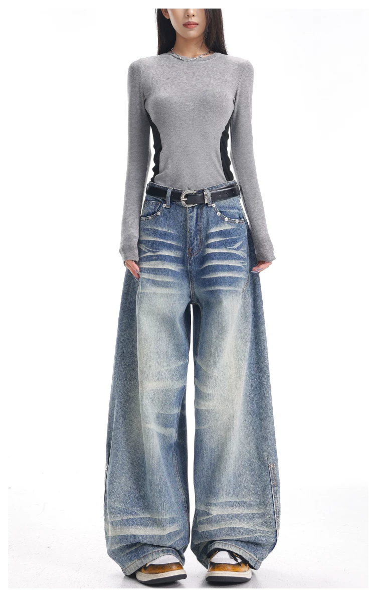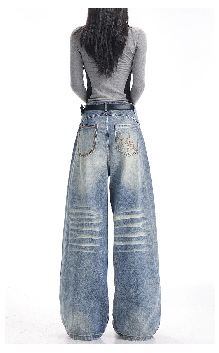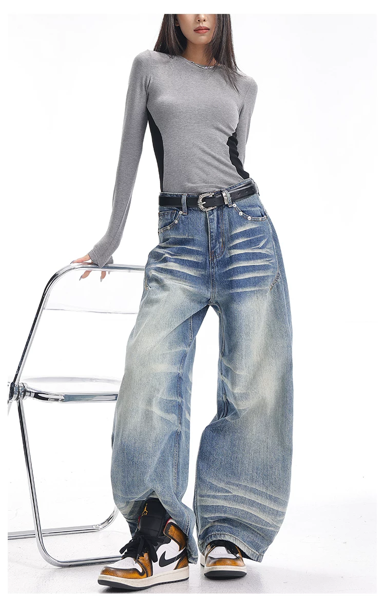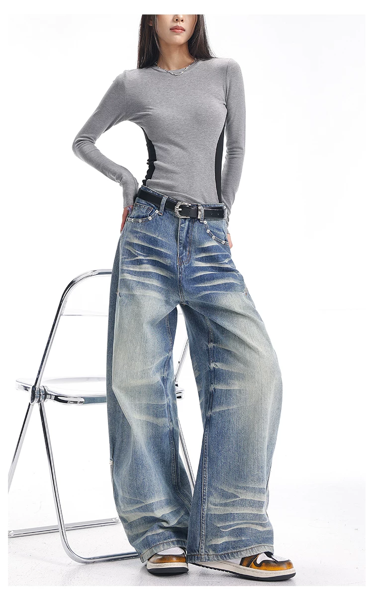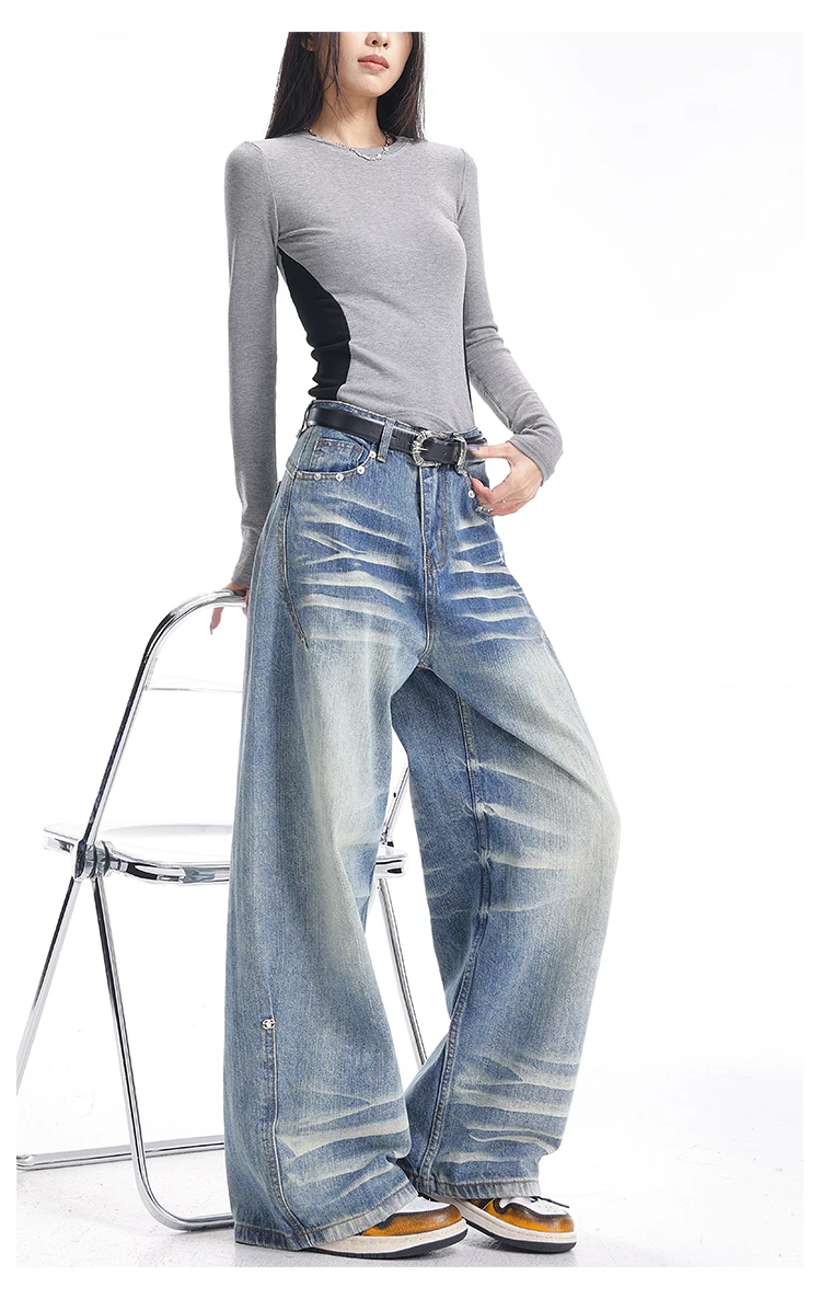 - KEN STUDIO quần jean xanh có râu phong cách retro mới mùa thu đông dành cho nữ, quần ống rộng đa năng giảm béo ba chiều