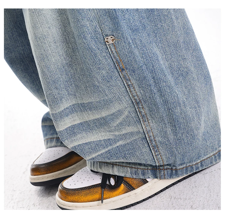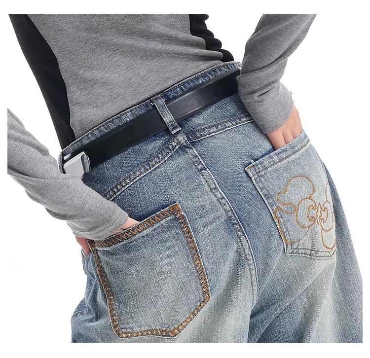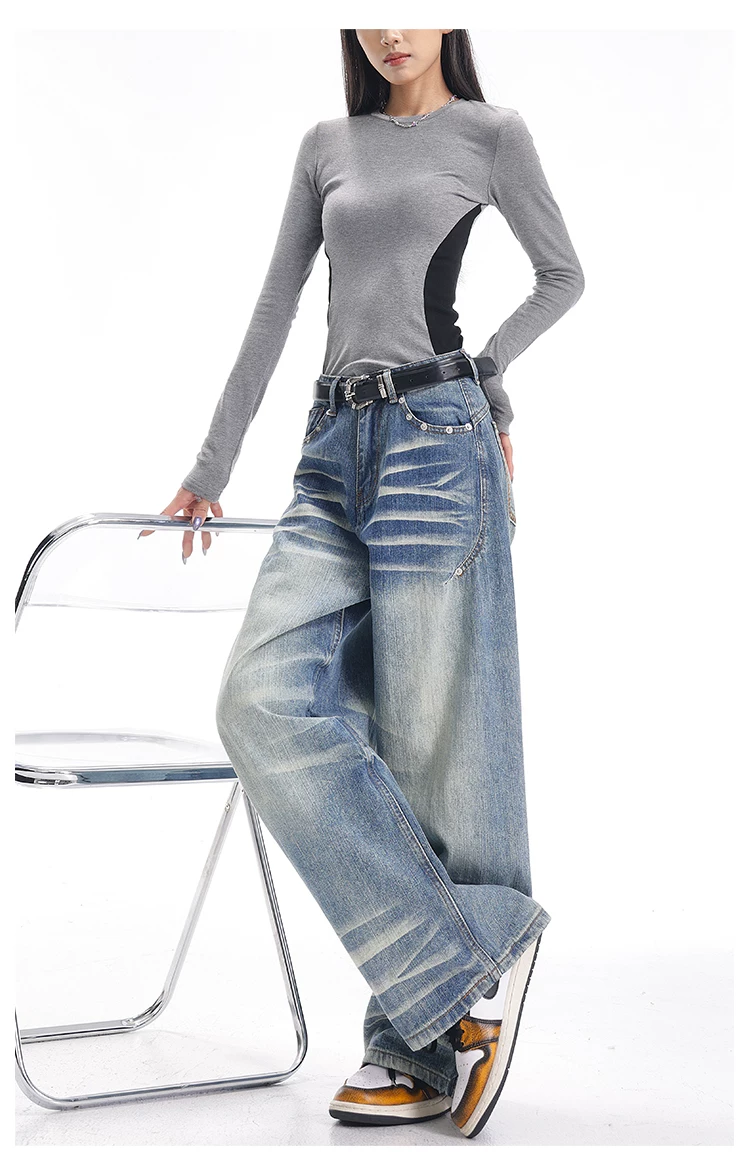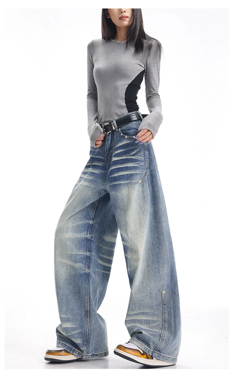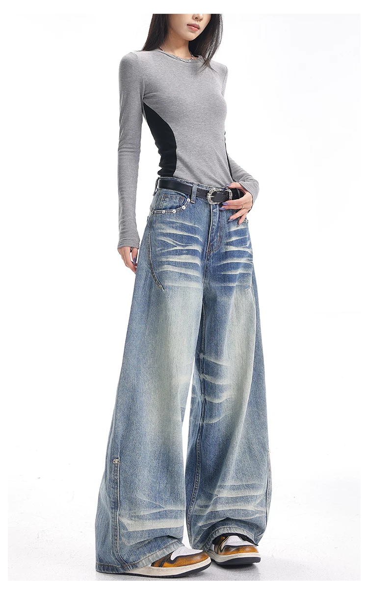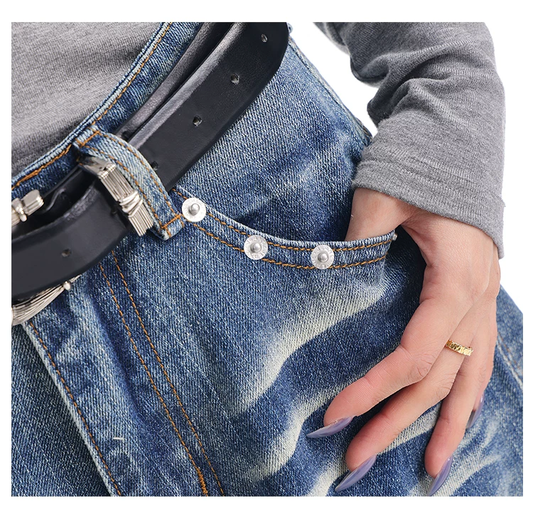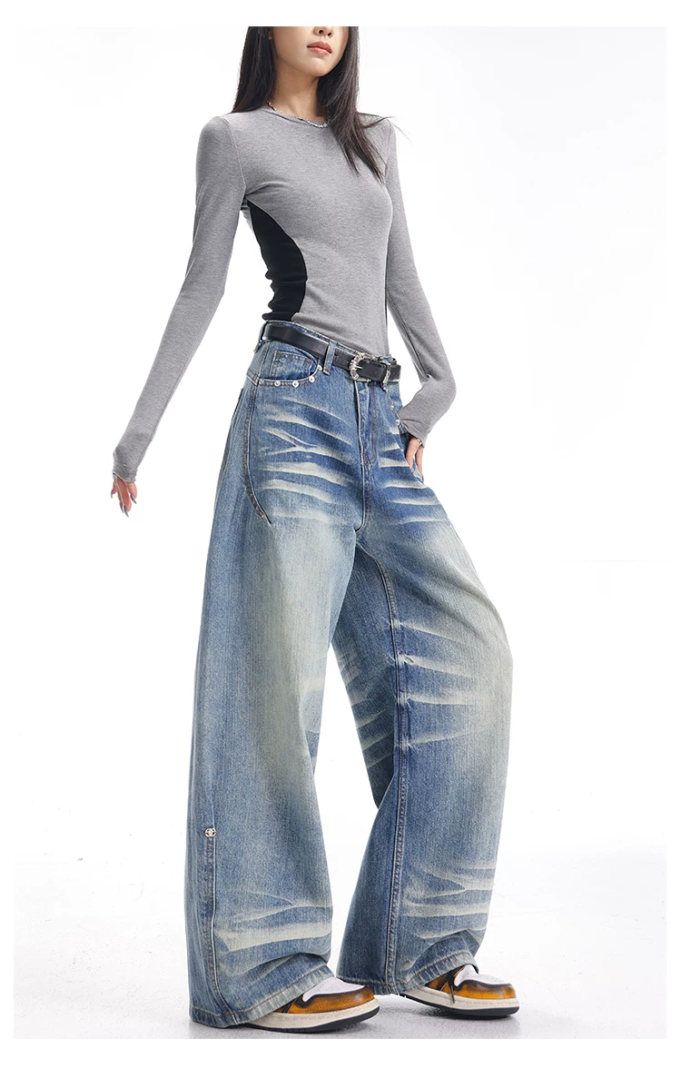 - KEN STUDIO quần jean xanh có râu phong cách retro mới mùa thu đông dành cho nữ, quần ống rộng đa năng giảm béo ba chiều