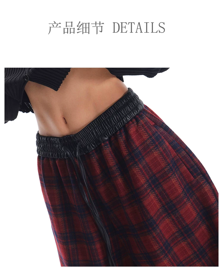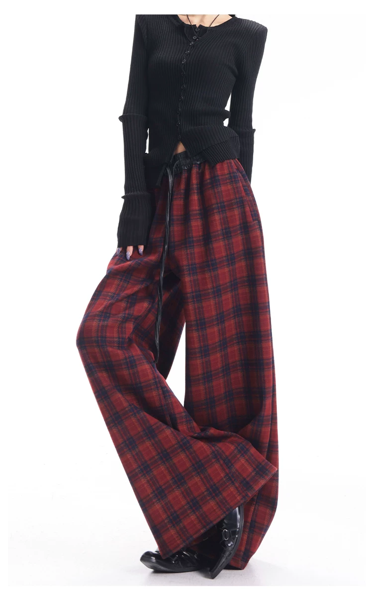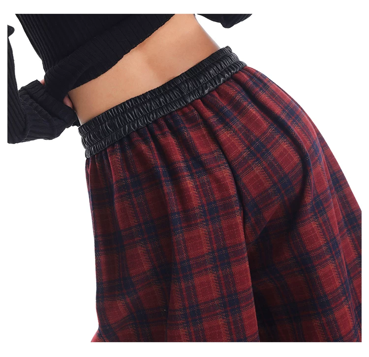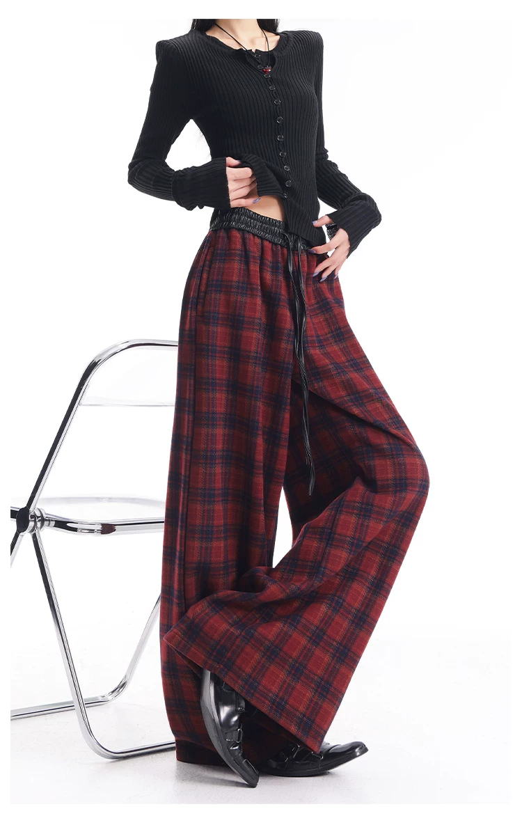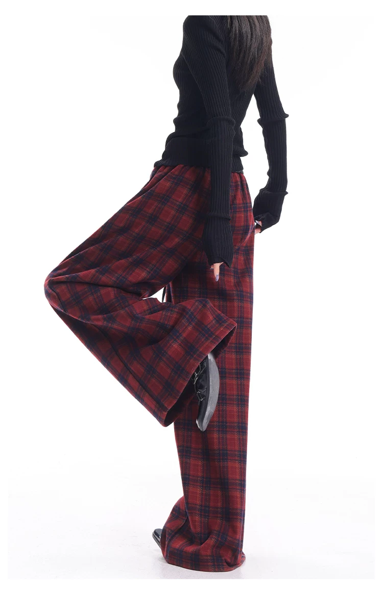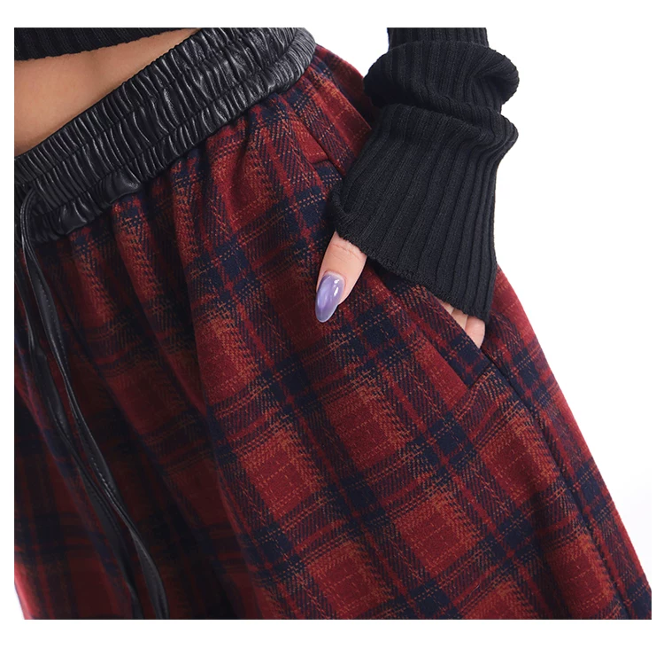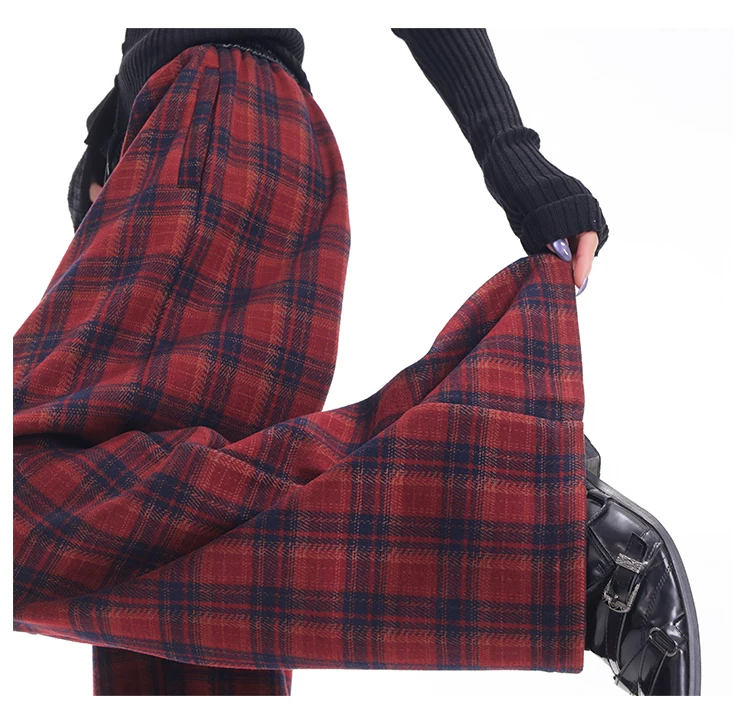 - KEN STUDIO Quần kẻ sọc dày lót lông cừu màu đỏ thu đông mới dành cho nữ có eo co giãn và quần ống rộng bằng vải chắp vá