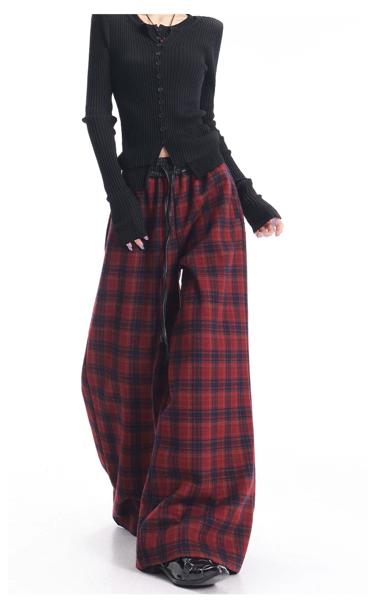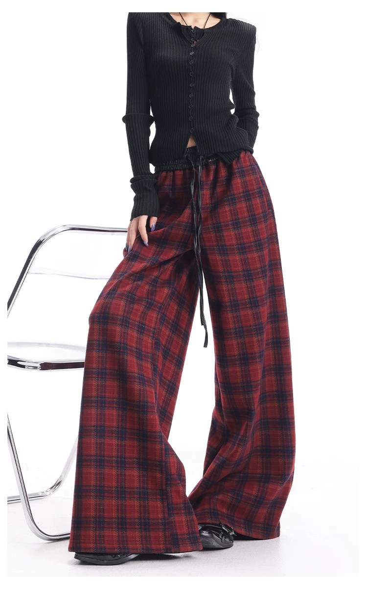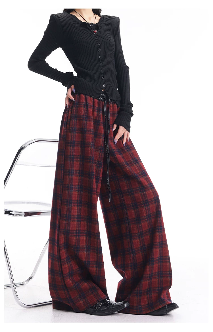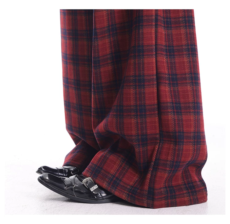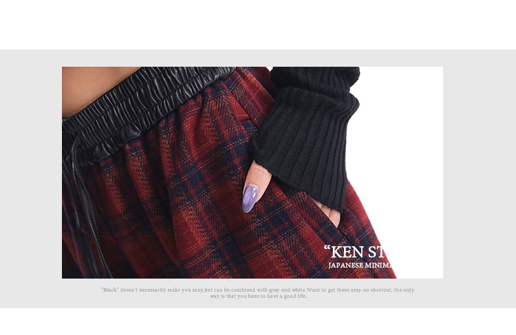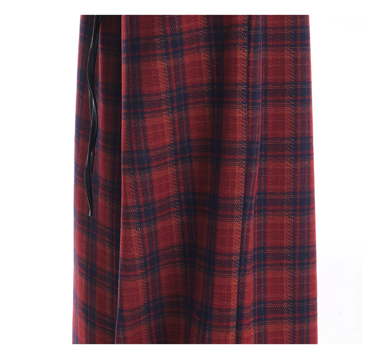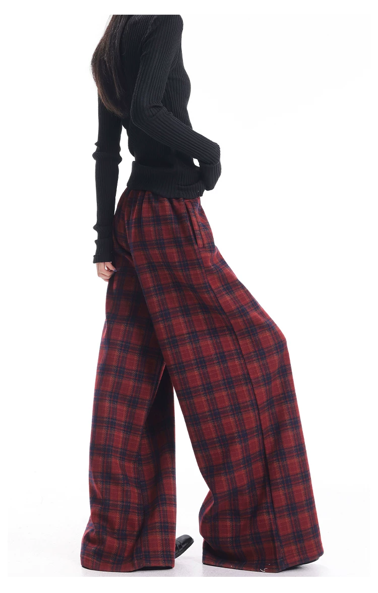 - KEN STUDIO Quần kẻ sọc dày lót lông cừu màu đỏ thu đông mới dành cho nữ có eo co giãn và quần ống rộng bằng vải chắp vá