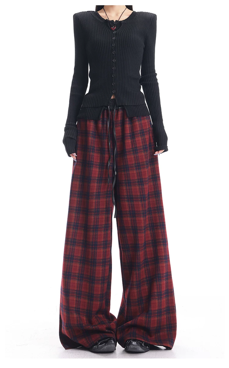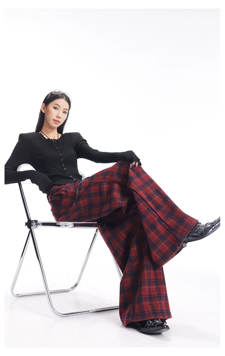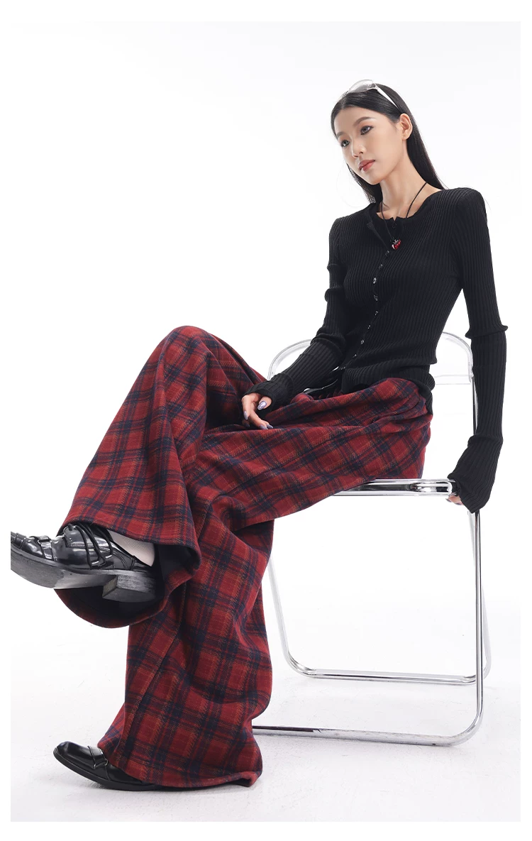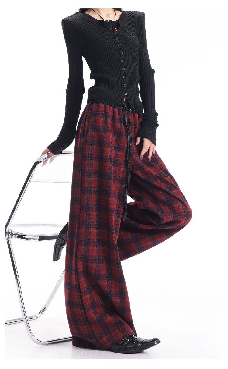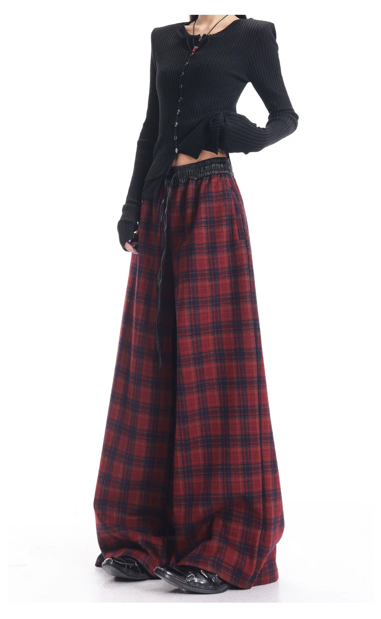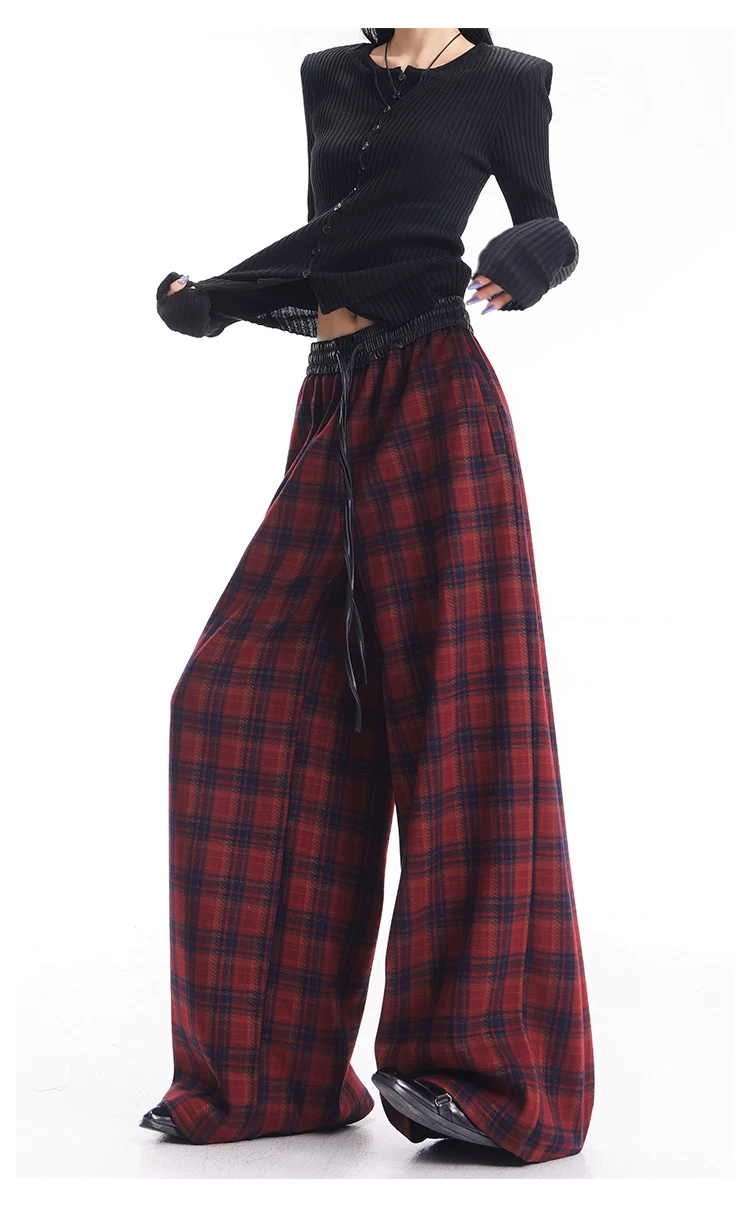 - KEN STUDIO Quần kẻ sọc dày lót lông cừu màu đỏ thu đông mới dành cho nữ có eo co giãn và quần ống rộng bằng vải chắp vá