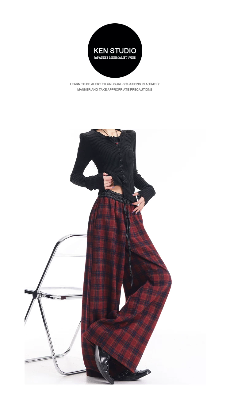 KEN STUDIO Quần kẻ sọc dày lót lông cừu màu đỏ thu đông mới dành cho nữ có eo co giãn và quần ống rộng bằng vải chắp vá