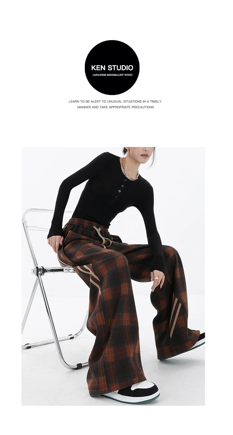 KEN STUDIO quần kẻ sọc giản dị theo phong cách retro mới mùa thu đông dành cho nữ với thiết kế màu sắc tương phản quần ống rộng thẳng