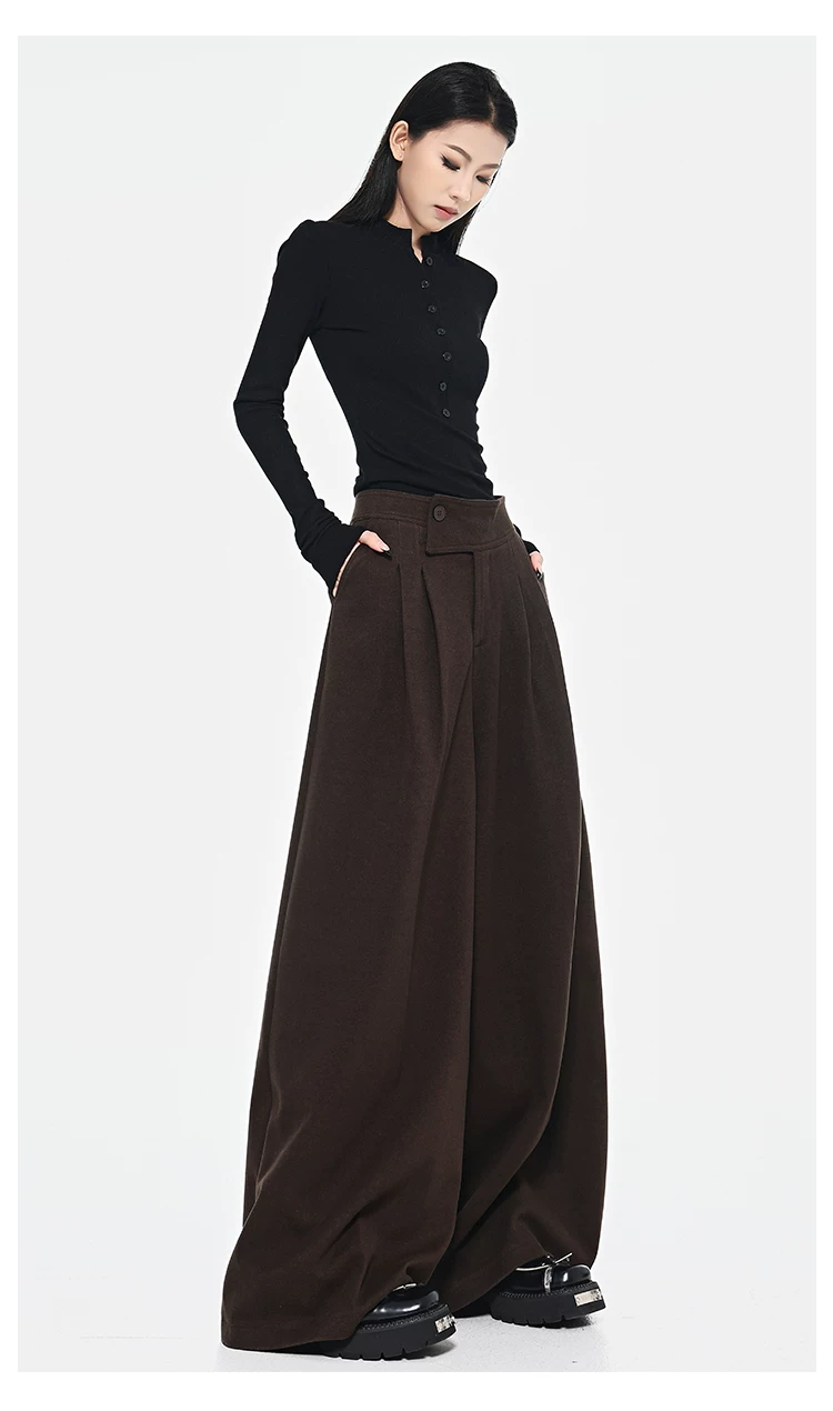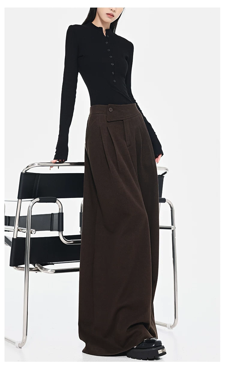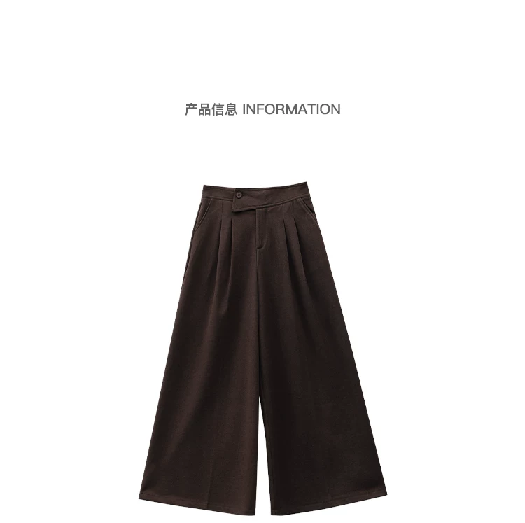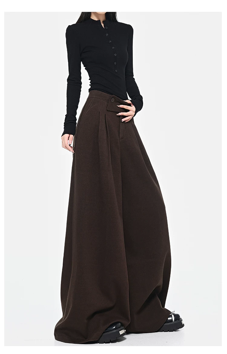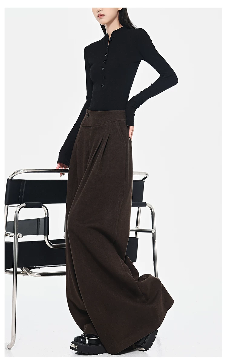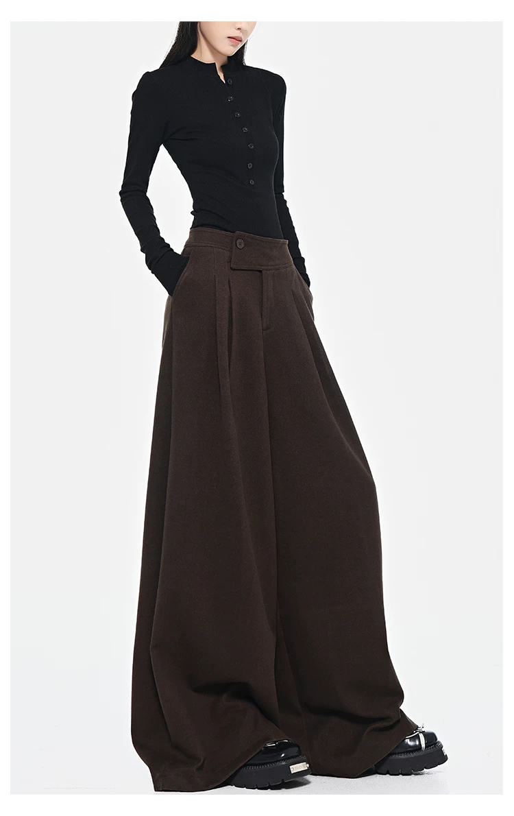 - KEN STUDIO Quần len dày màu cà phê mới dành cho nữ mùa thu đông, quần ống rộng thiết kế nút chéo phong cách Melard