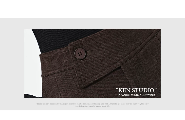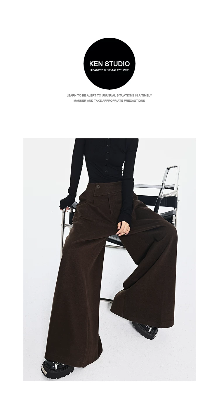 KEN STUDIO Quần len dày màu cà phê mới dành cho nữ mùa thu đông, quần ống rộng thiết kế nút chéo phong cách Melard
