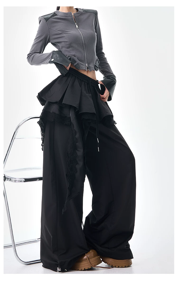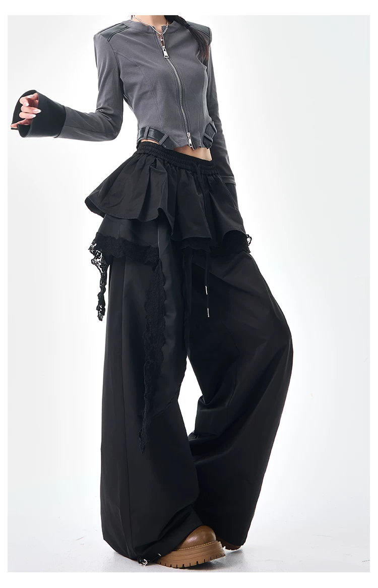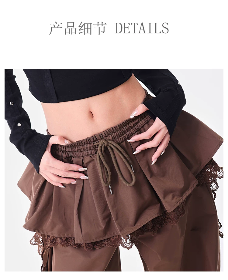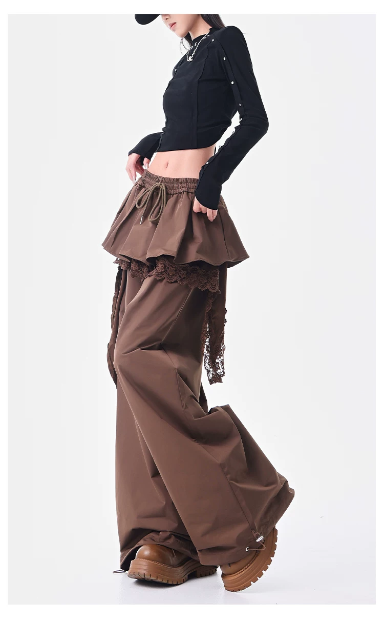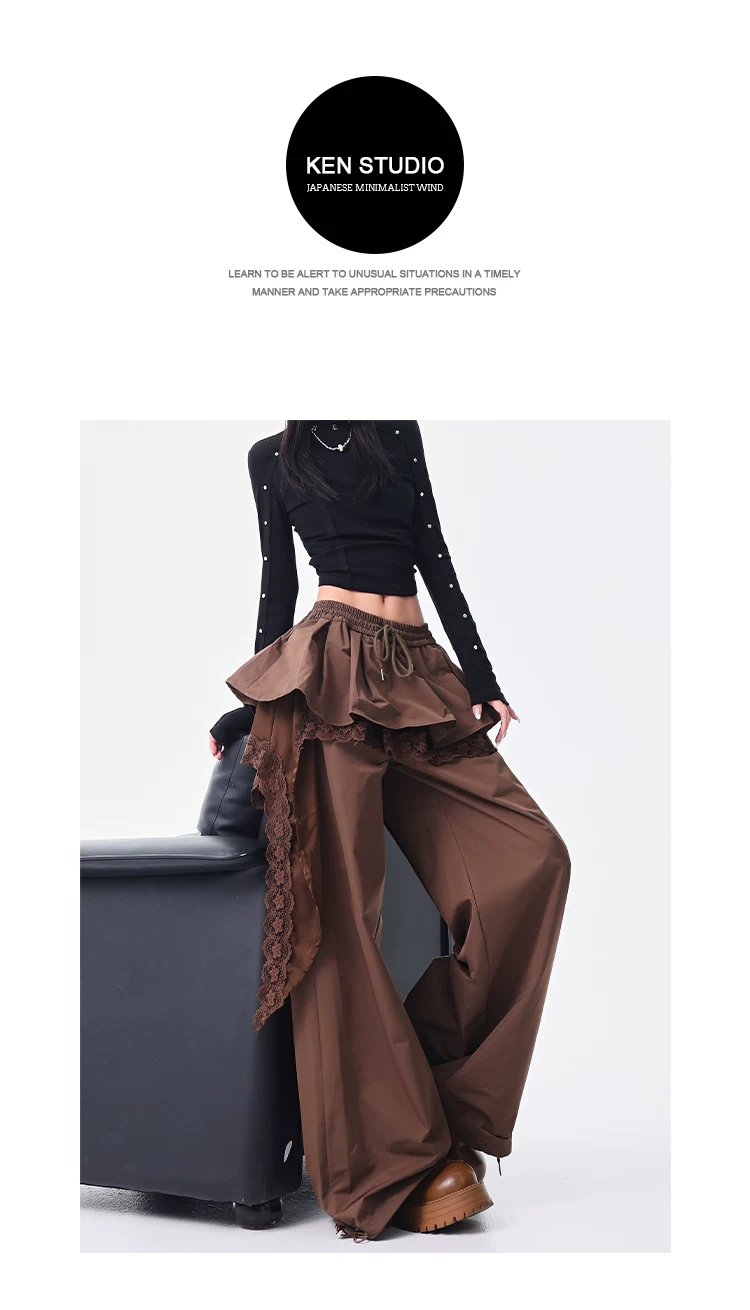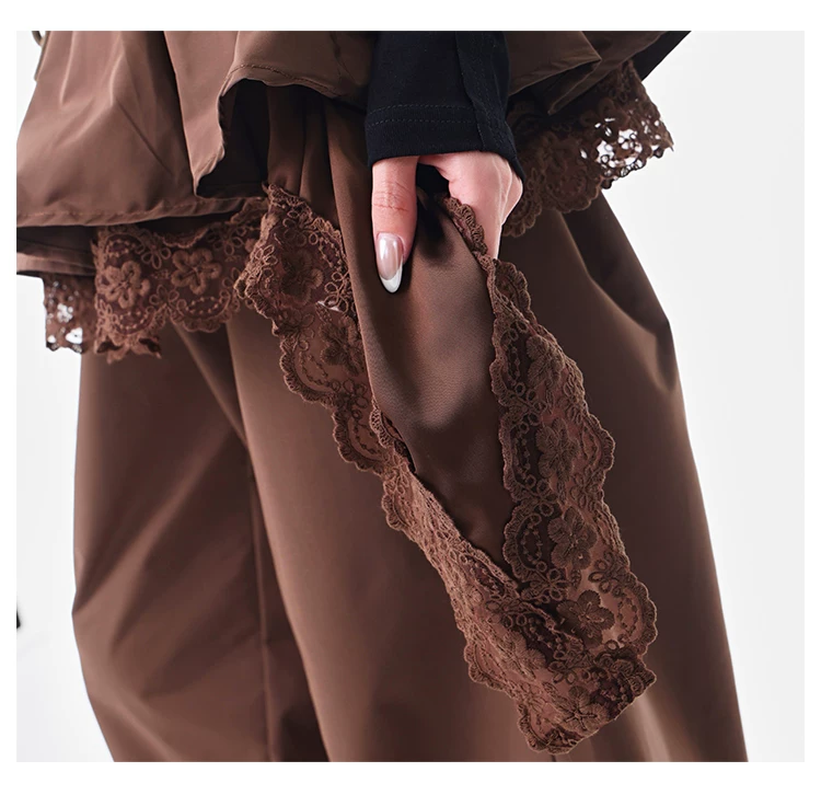 KEN STUDIO quần ống đứng màu cà phê mới đầu thu dành cho nữ, quần ống rộng giả hai mảnh thiết kế viền ren.