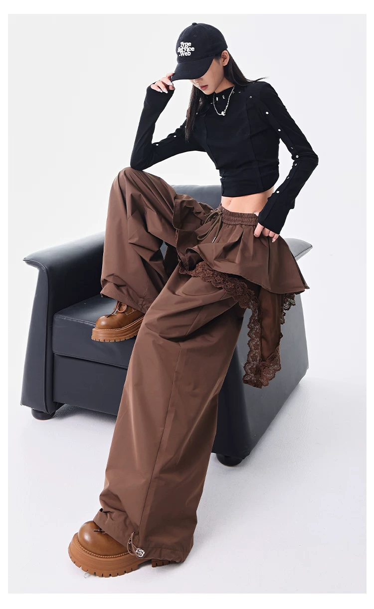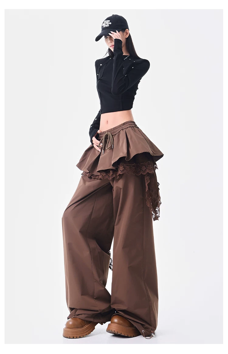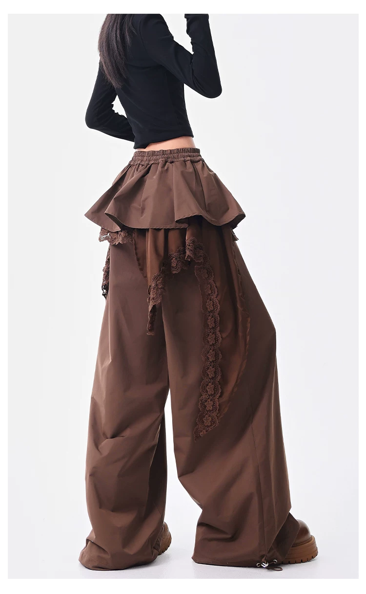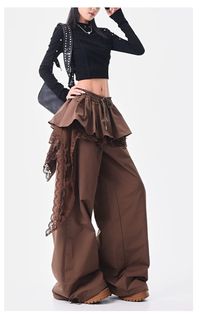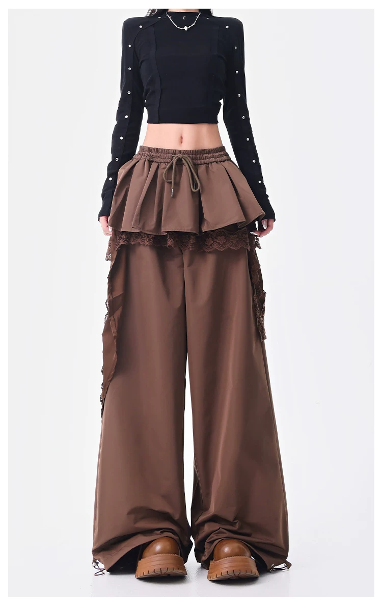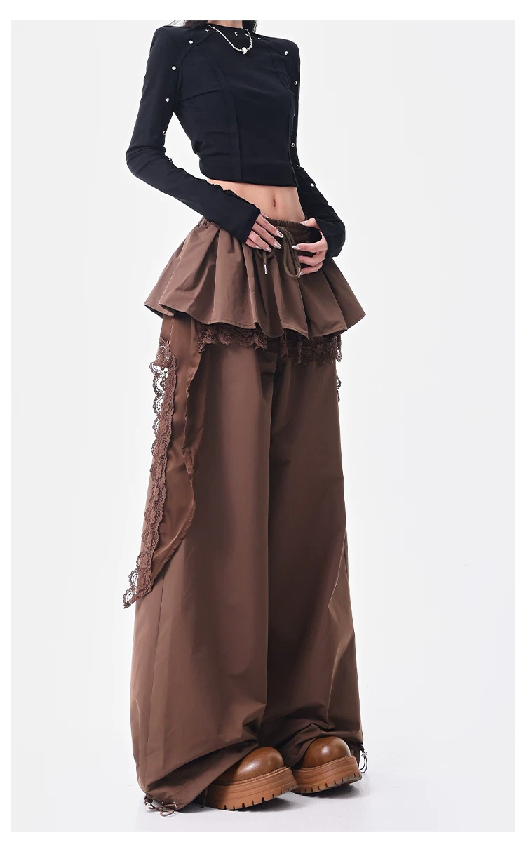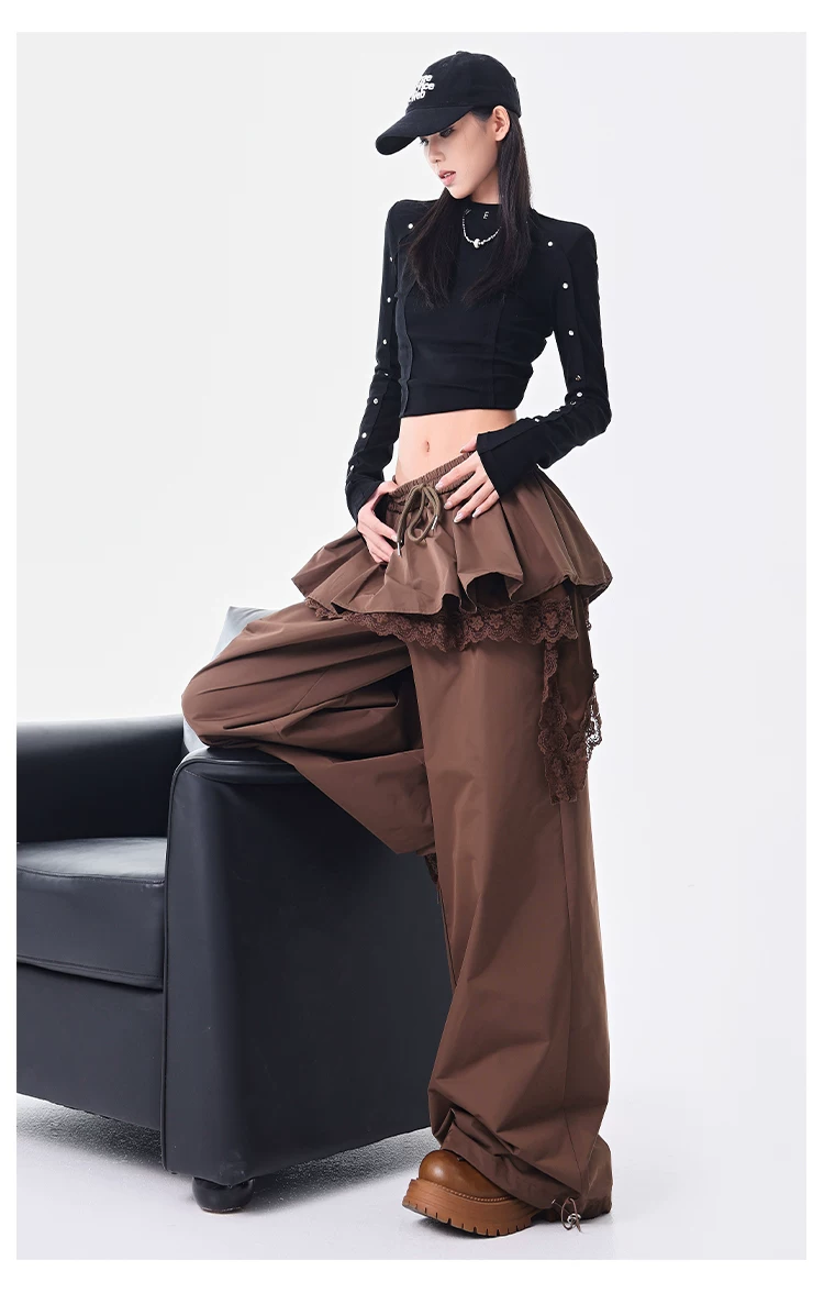 - KEN STUDIO quần ống đứng màu cà phê mới đầu thu dành cho nữ, quần ống rộng giả hai mảnh thiết kế viền ren.