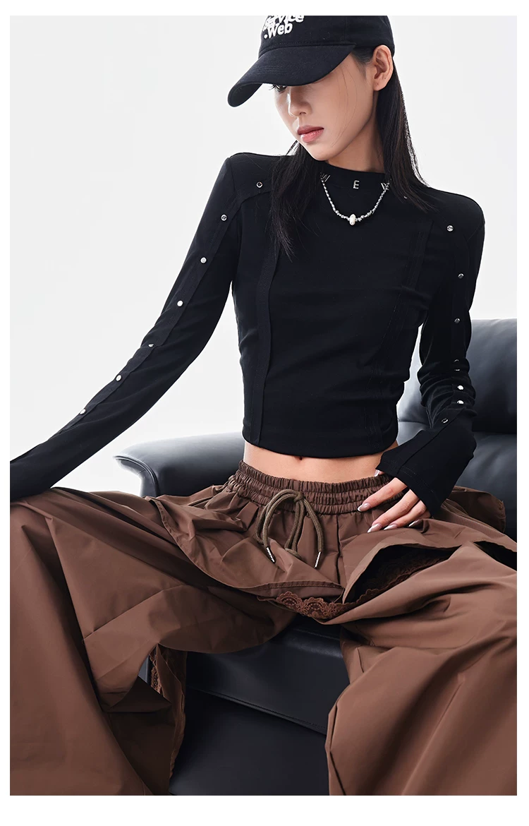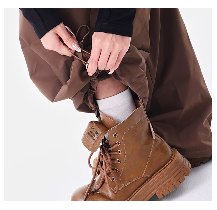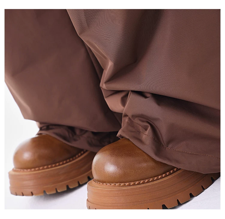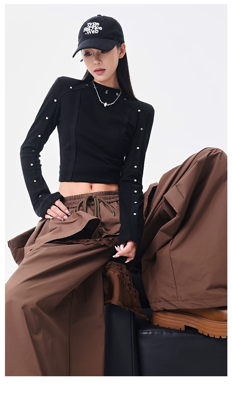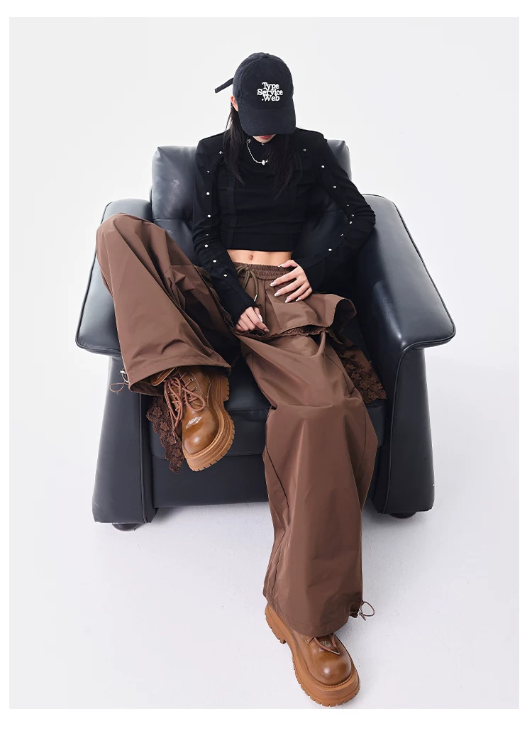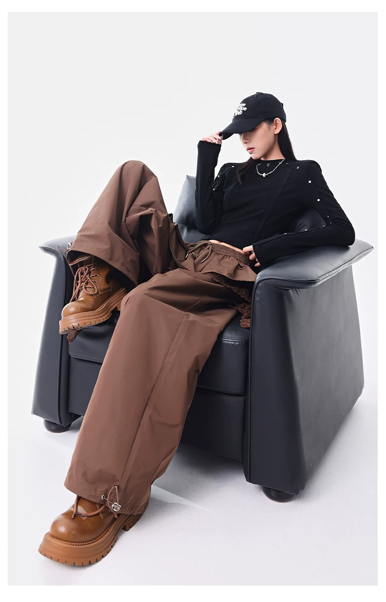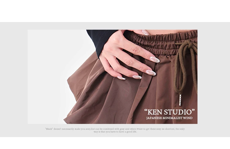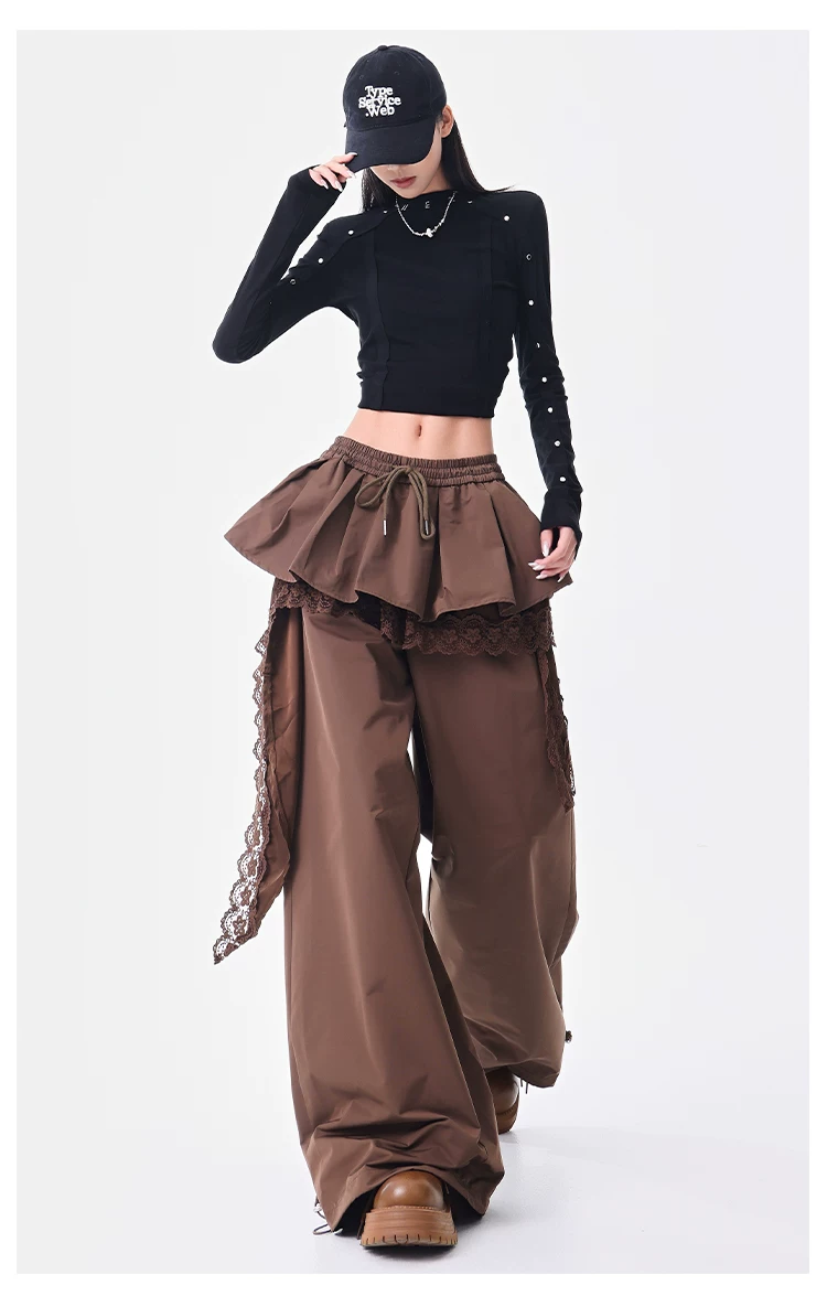 - KEN STUDIO quần ống đứng màu cà phê mới đầu thu dành cho nữ, quần ống rộng giả hai mảnh thiết kế viền ren.