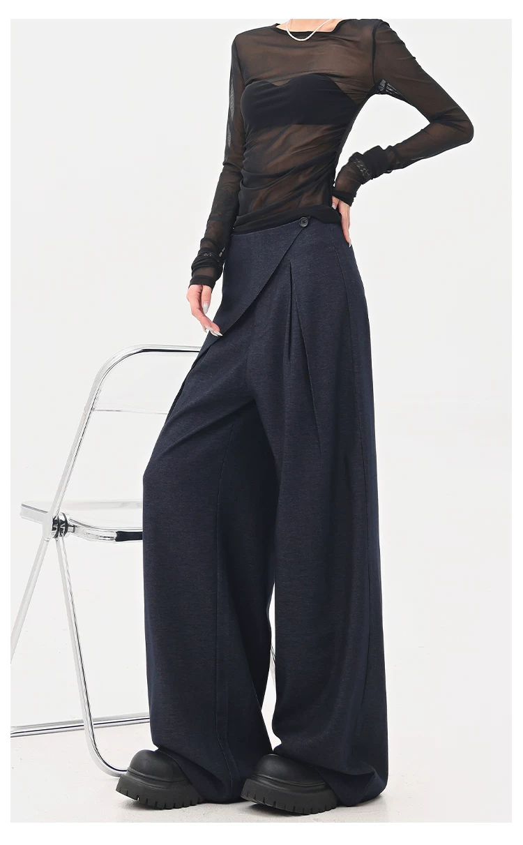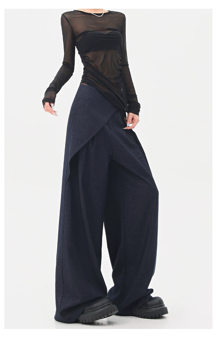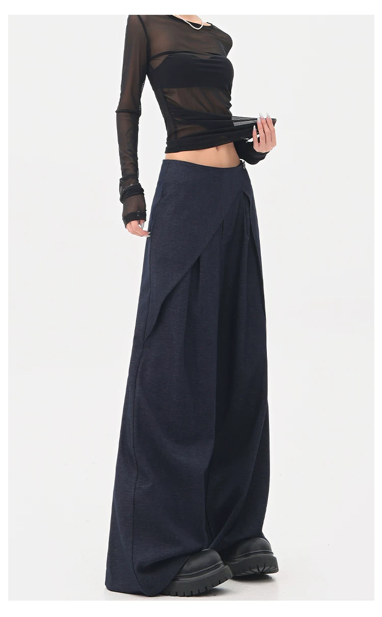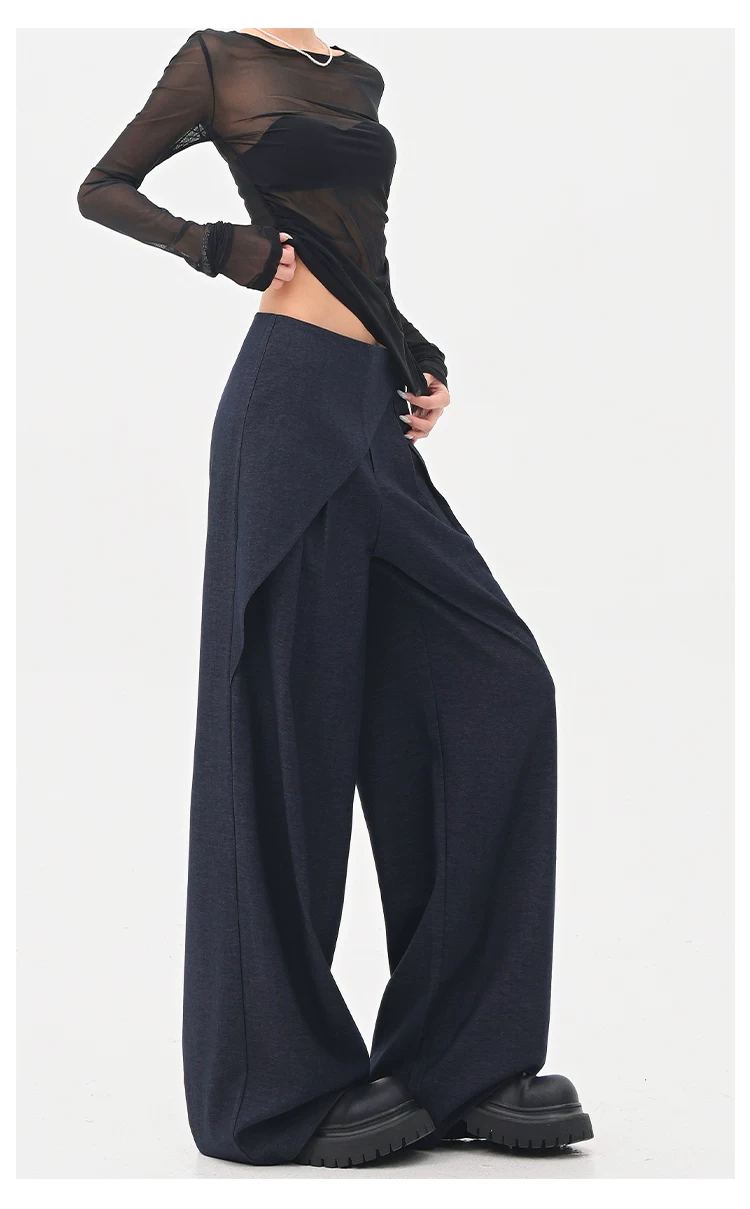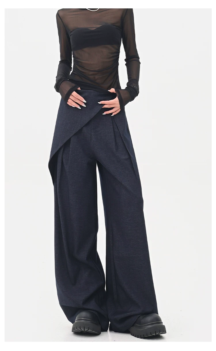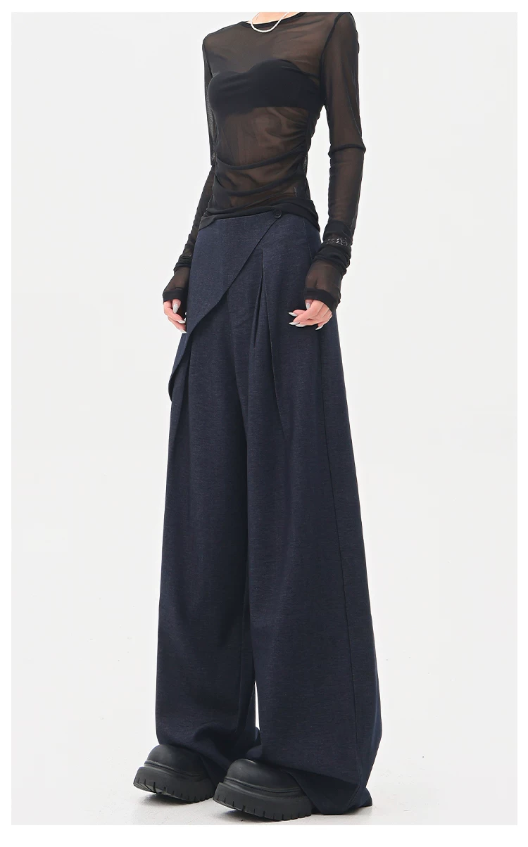 - KEN STUDIO quần tây denim màu xanh mới mùa hè dành cho nữ, quần ống rộng giả hai mảnh xếp ly lưng cao.