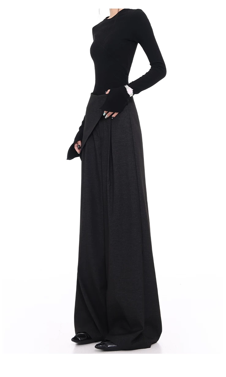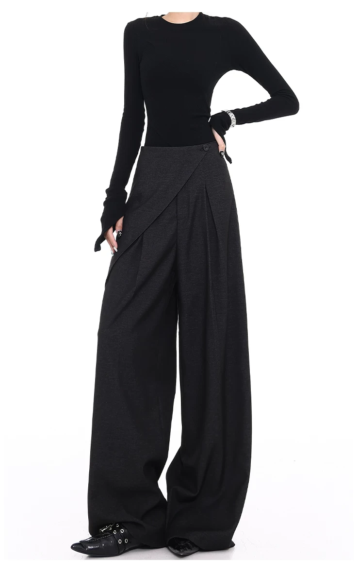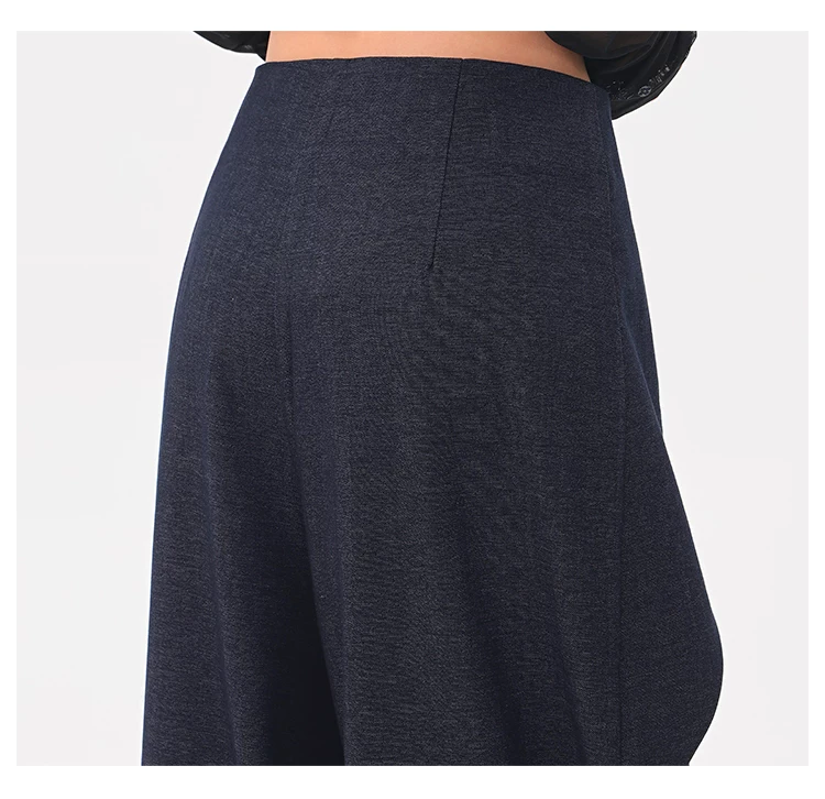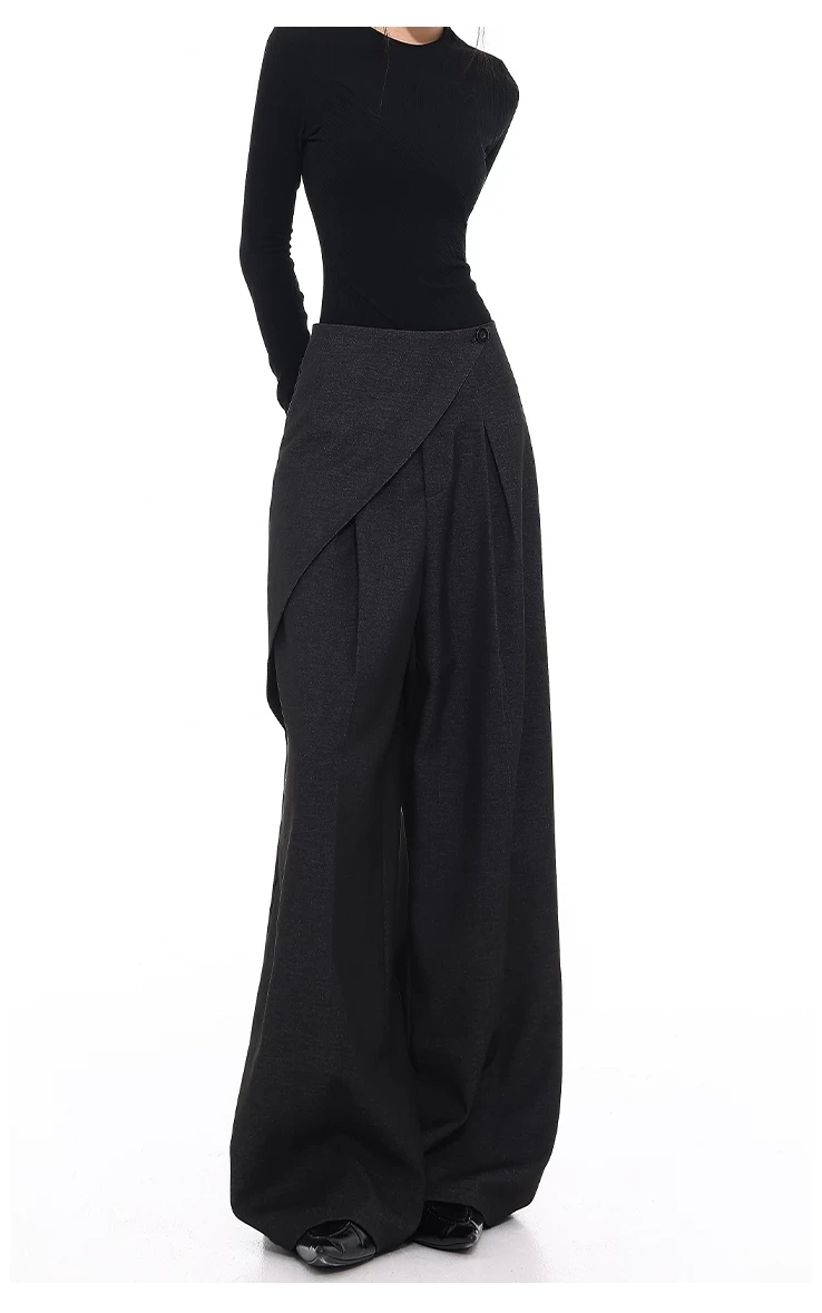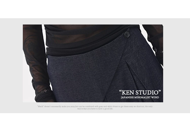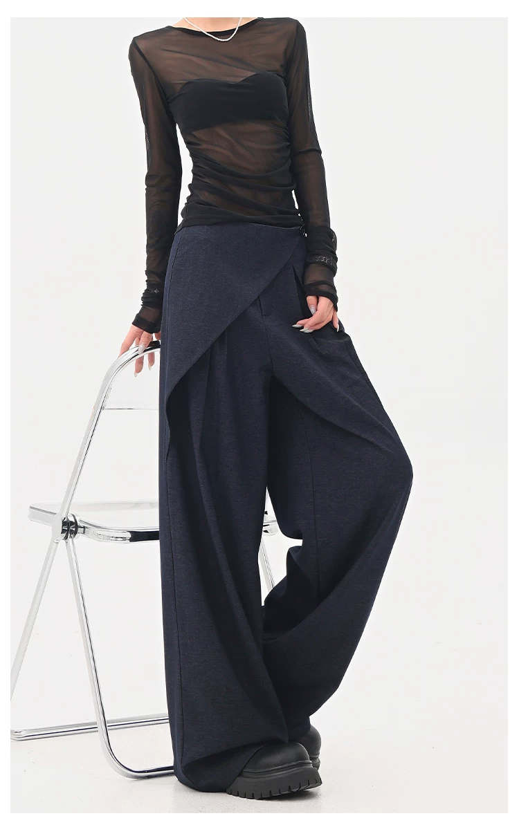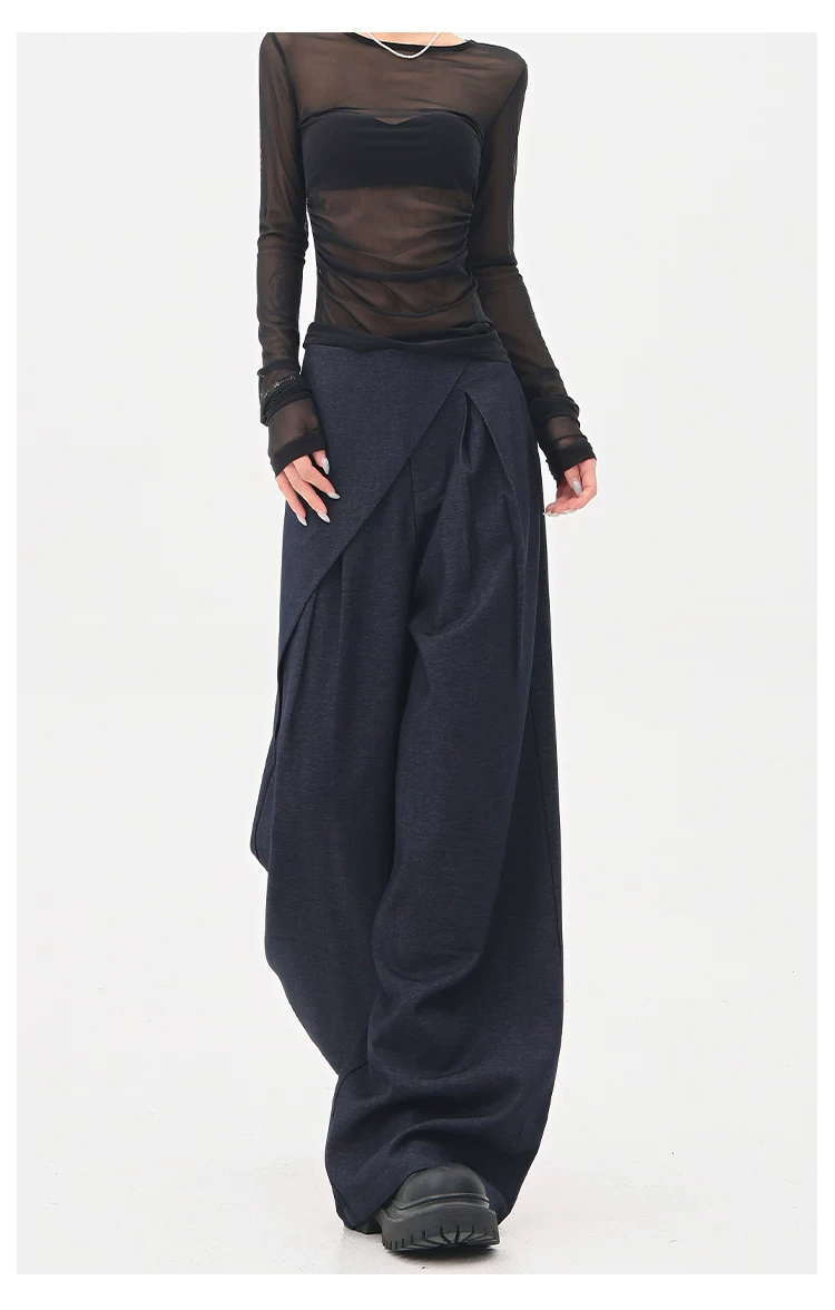 - KEN STUDIO quần tây denim màu xanh mới mùa hè dành cho nữ, quần ống rộng giả hai mảnh xếp ly lưng cao.