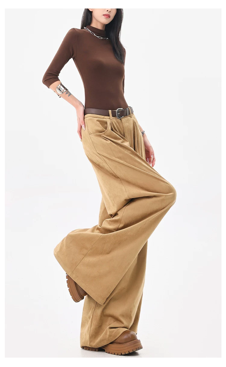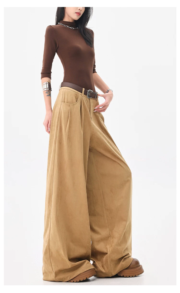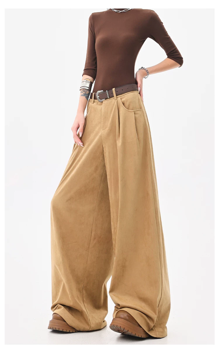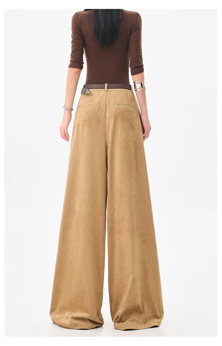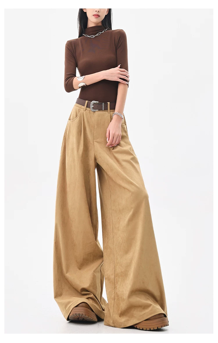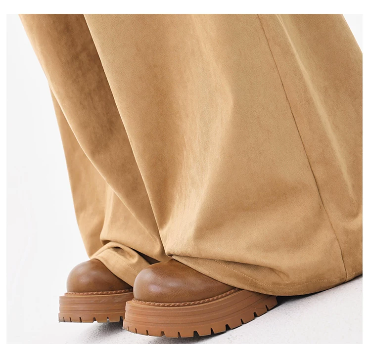 - KEN STUDIO Quần tây ống rộng da lộn màu kaki mới thu đông dành cho nữ, quần cạp cao, dáng rộng, quần thường ngày giúp giảm béo