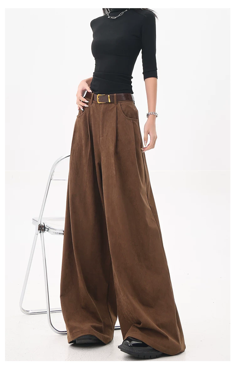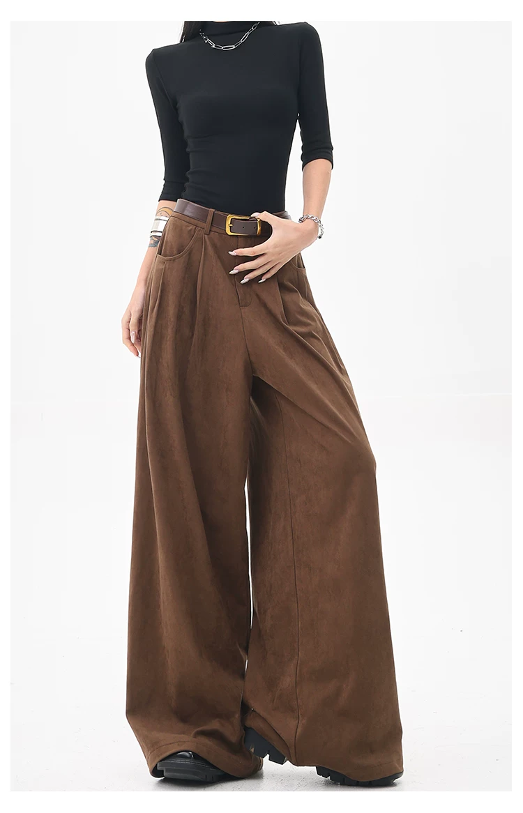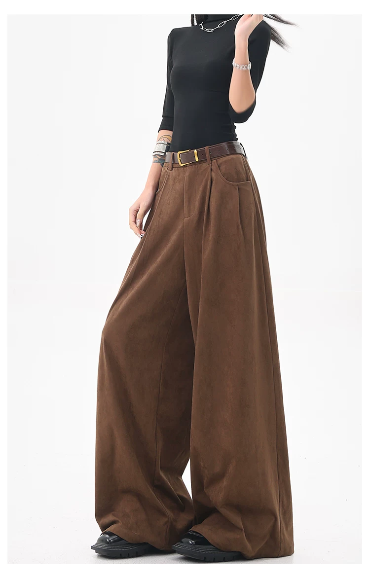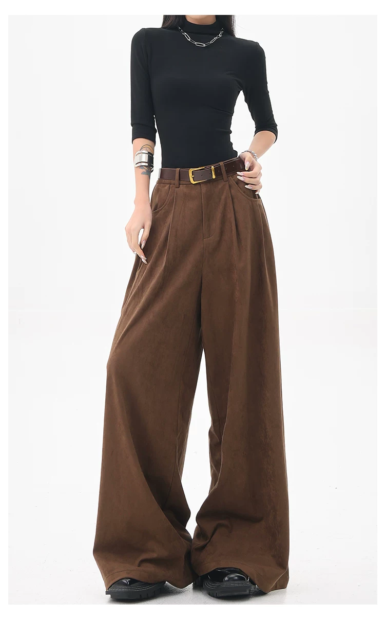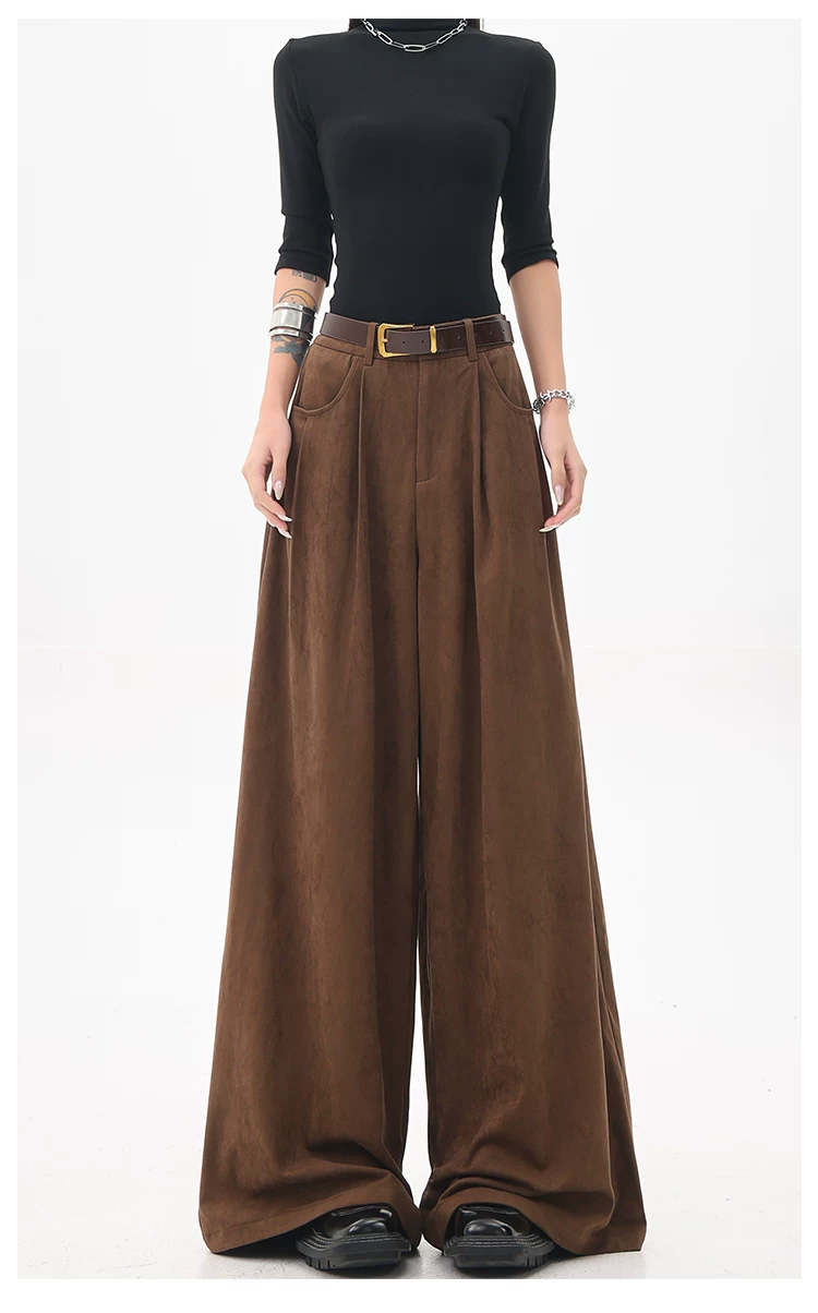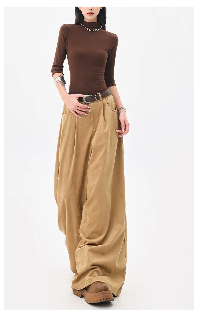 - KEN STUDIO Quần tây ống rộng da lộn màu kaki mới thu đông dành cho nữ, quần cạp cao, dáng rộng, quần thường ngày giúp giảm béo