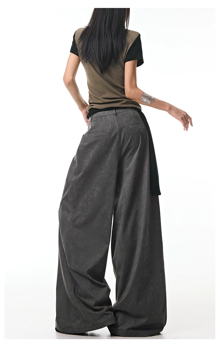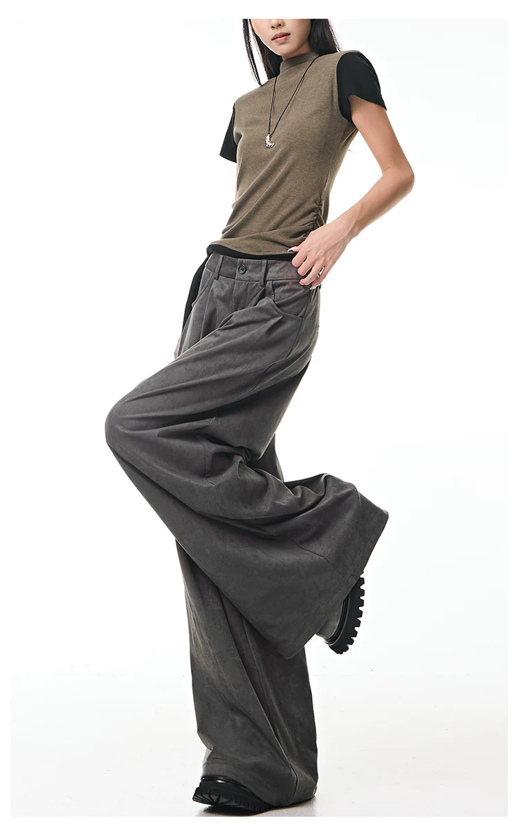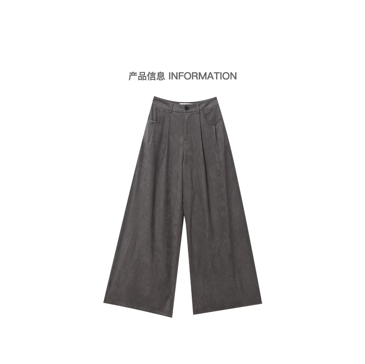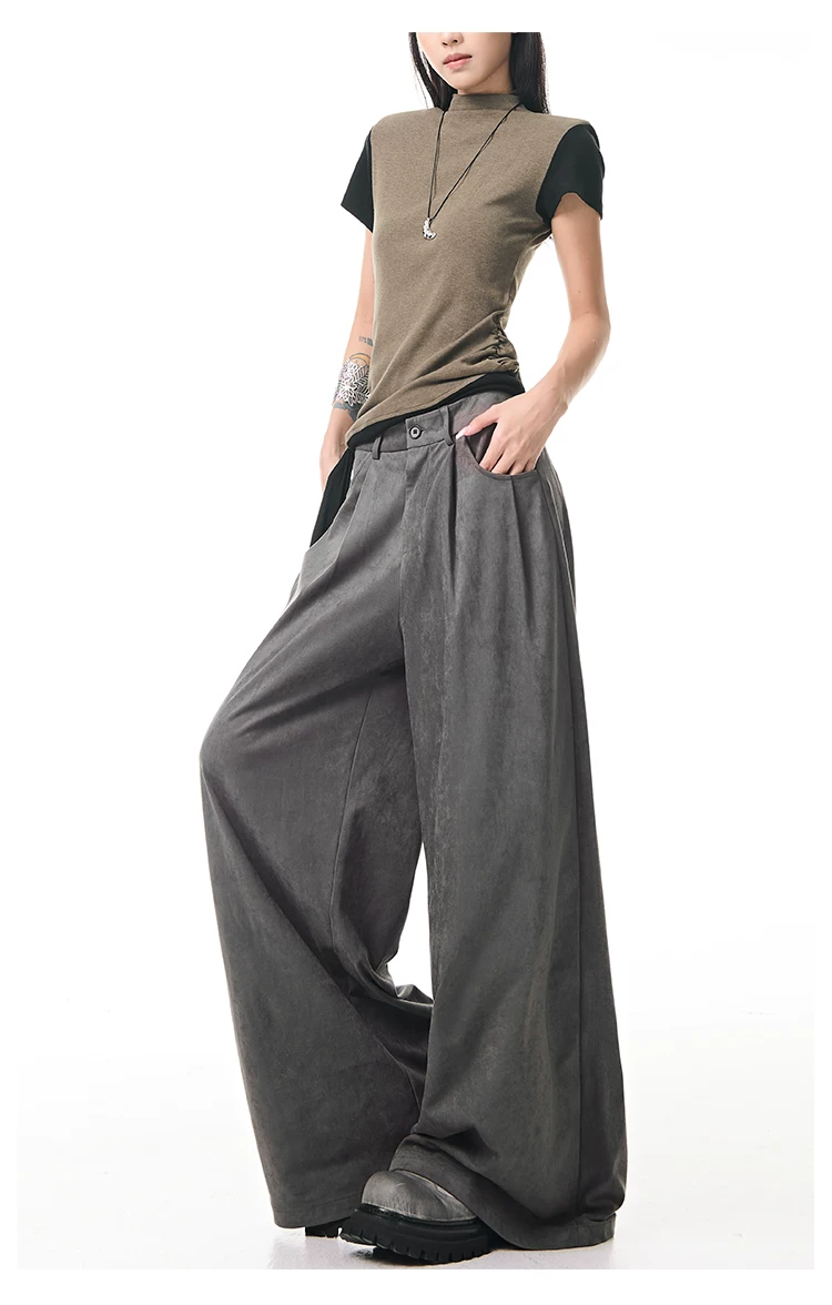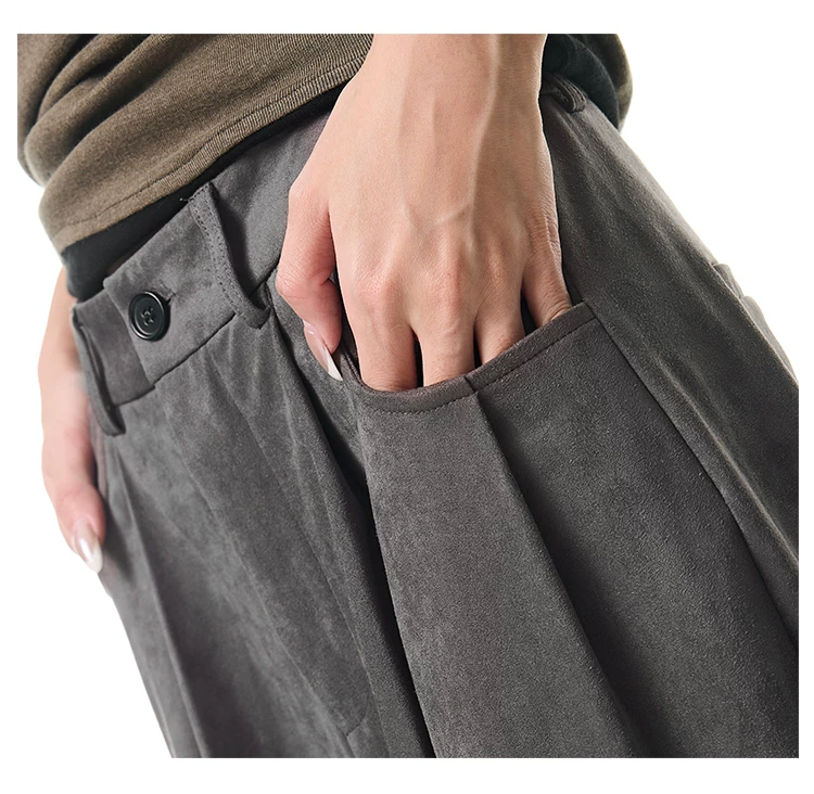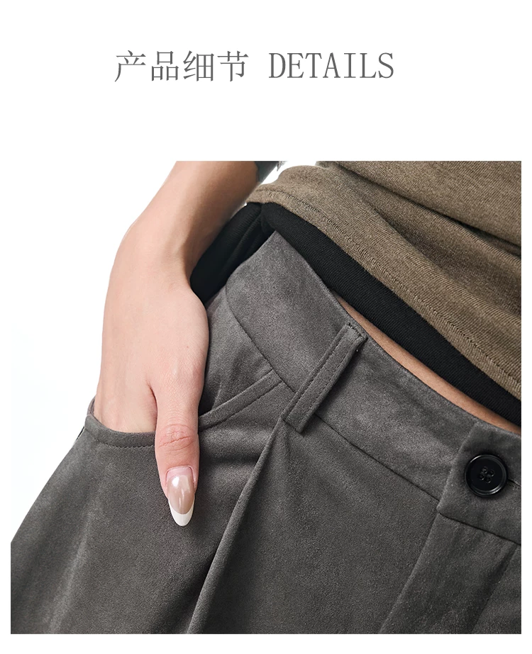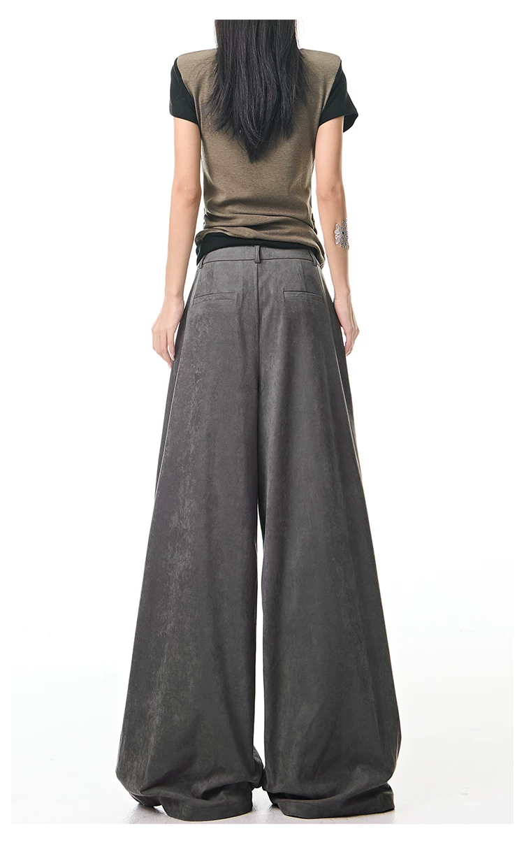 - KEN STUDIO Quần tây ống rộng da lộn màu xám thu đông mới dành cho nữ, quần cạp cao, dáng rộng, quần thường ngày giúp giảm béo