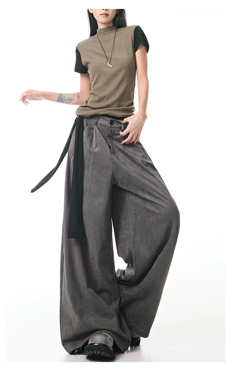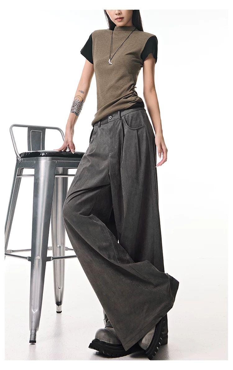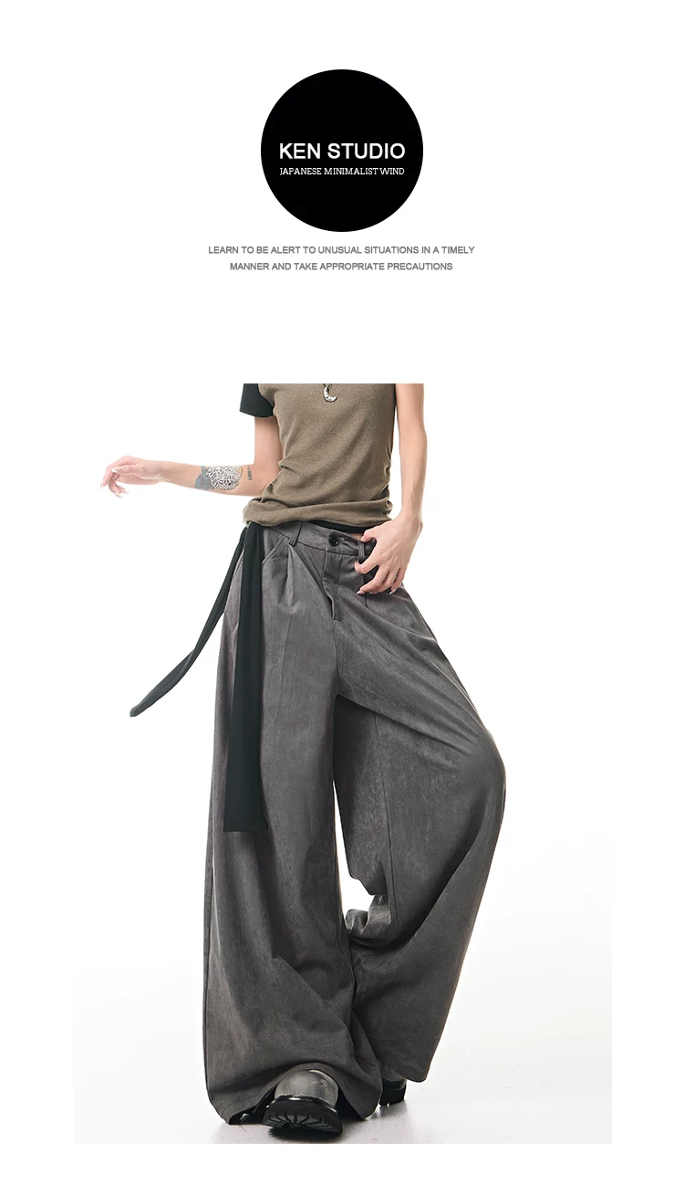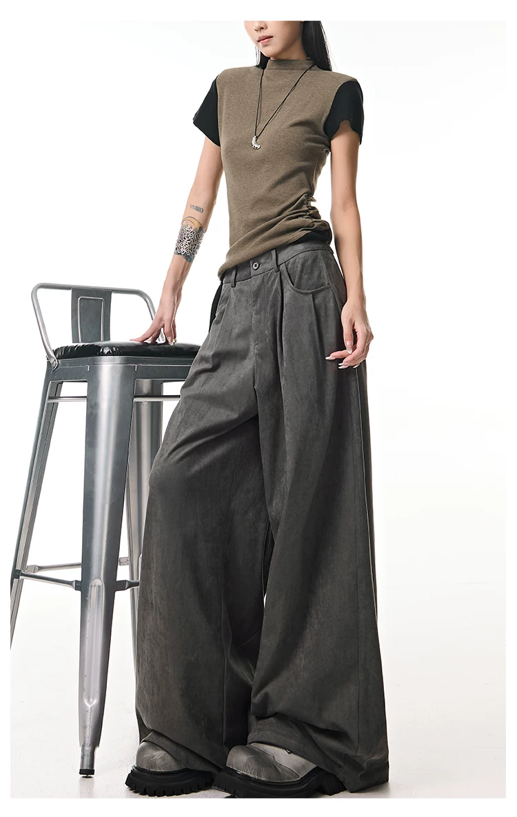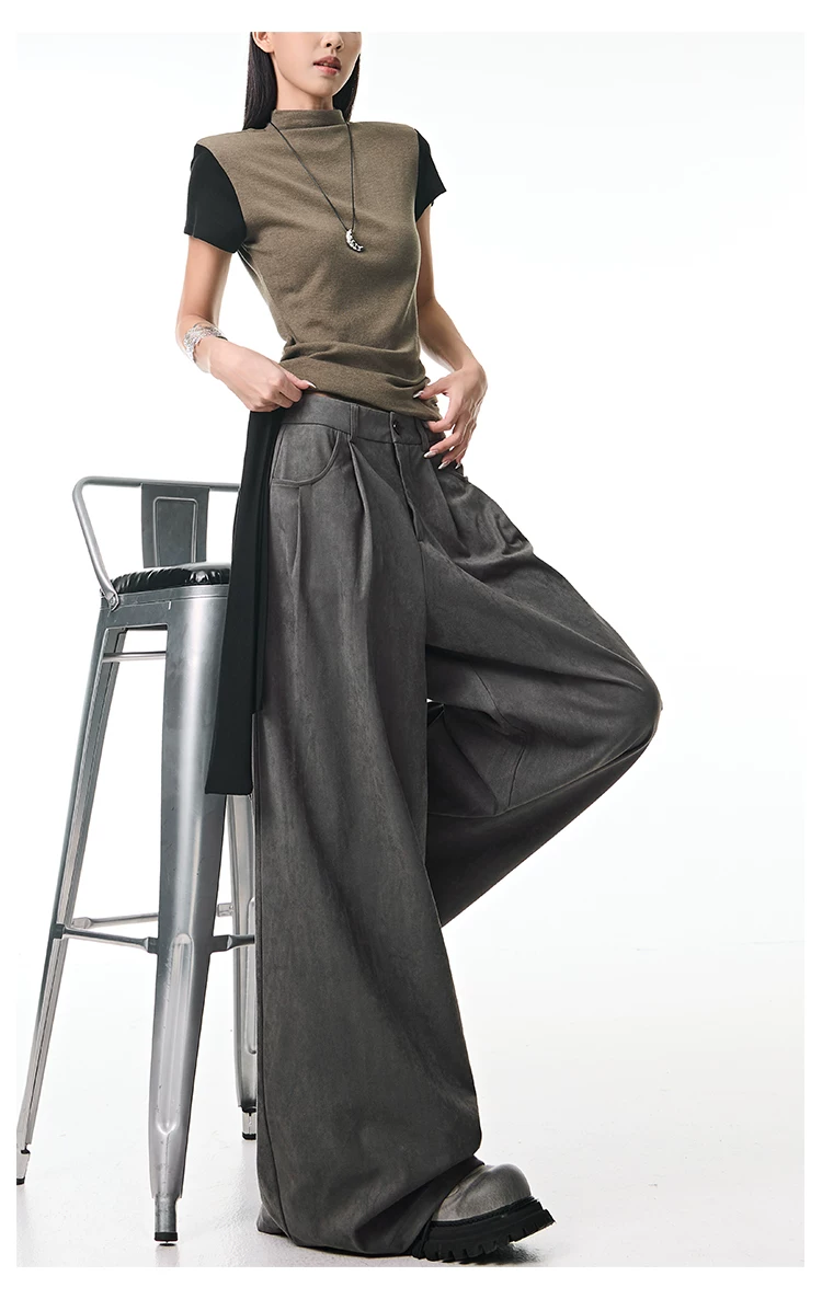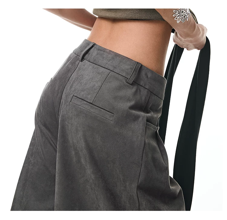 - KEN STUDIO Quần tây ống rộng da lộn màu xám thu đông mới dành cho nữ, quần cạp cao, dáng rộng, quần thường ngày giúp giảm béo