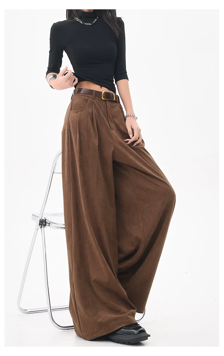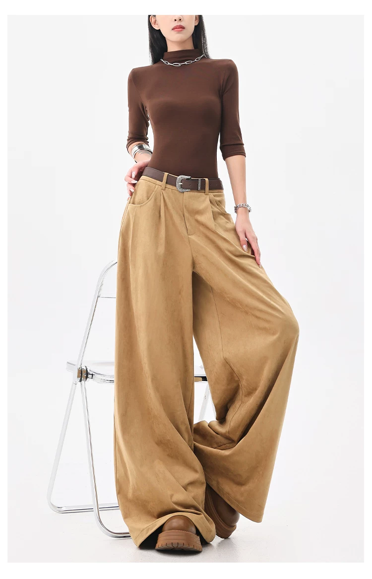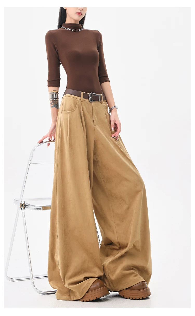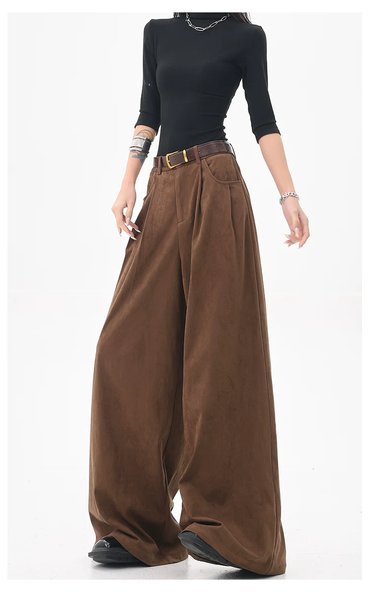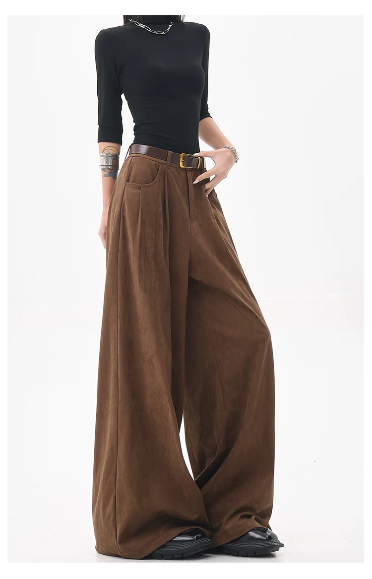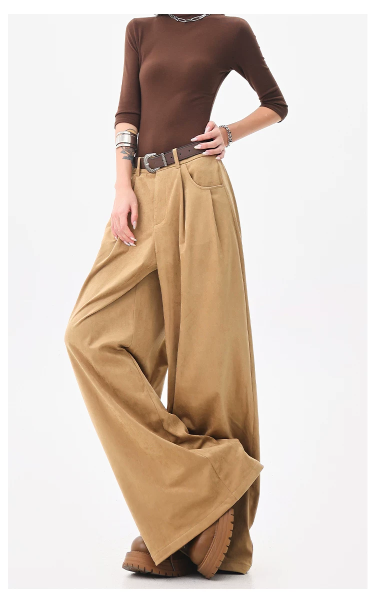- KEN STUDIO Quần tây ống rộng da lộn màu xám thu đông mới dành cho nữ, quần cạp cao, dáng rộng, quần thường ngày giúp giảm béo