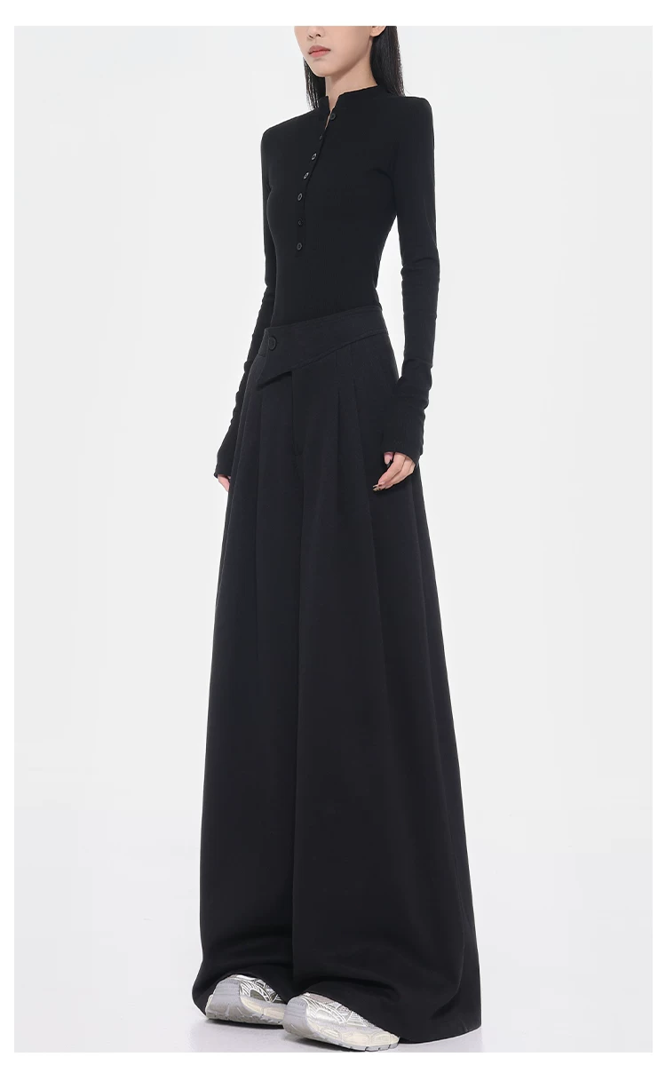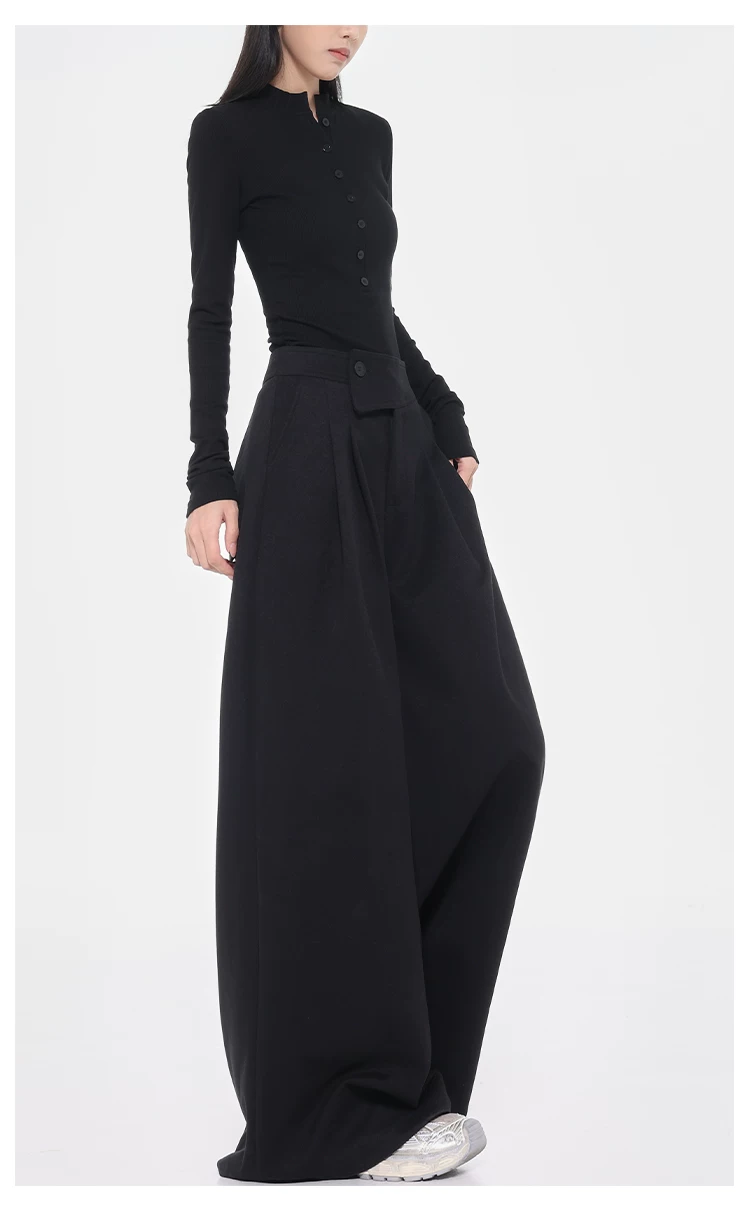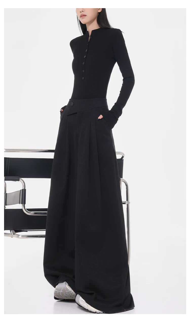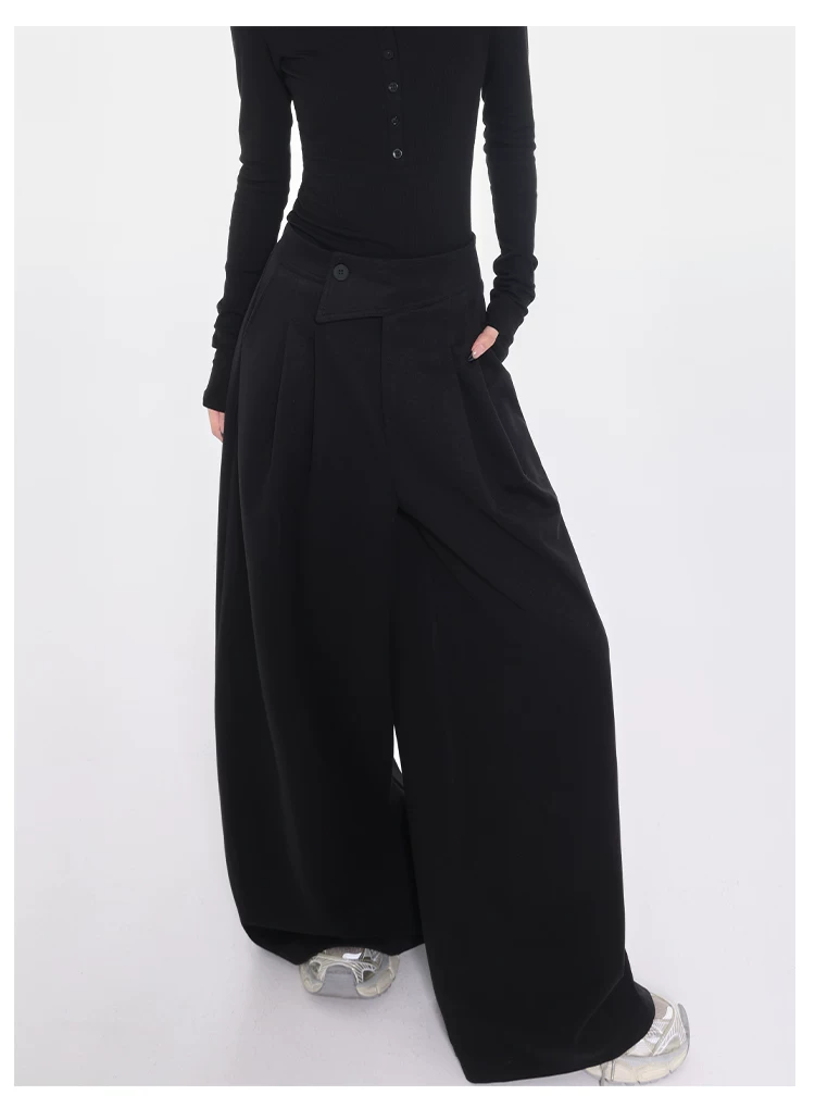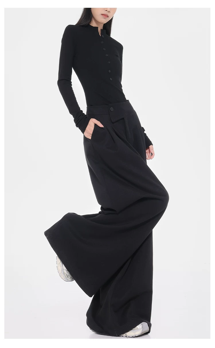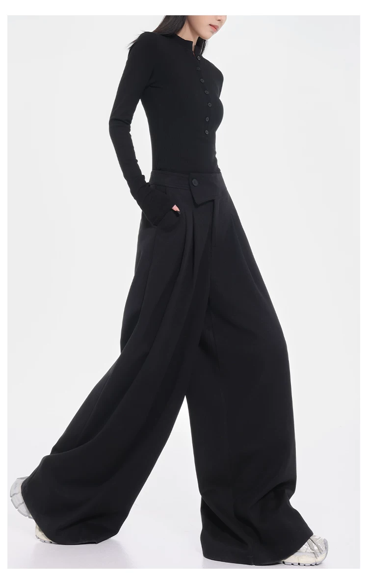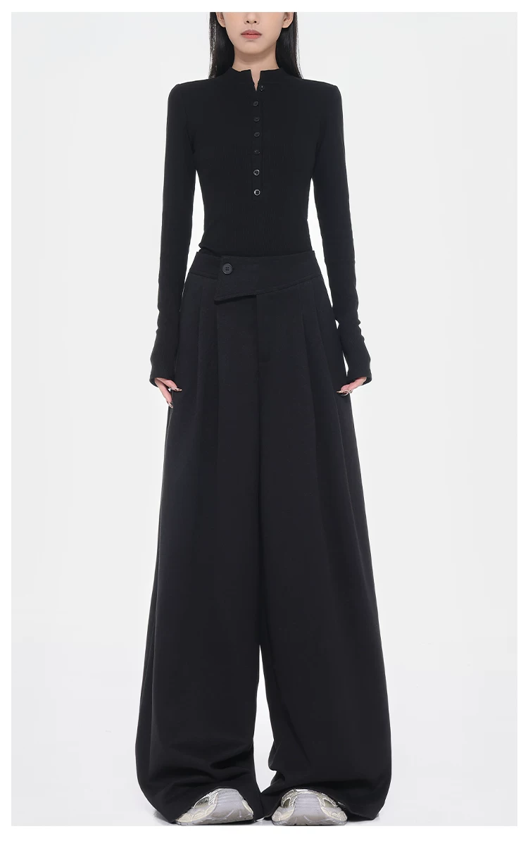 - KEN STUDIO Quần tây ống rộng dày dặn lưng cao thu đông mới dành cho nữ với thiết kế khuy chéo quần ống đứng kiểu dáng đơn giản