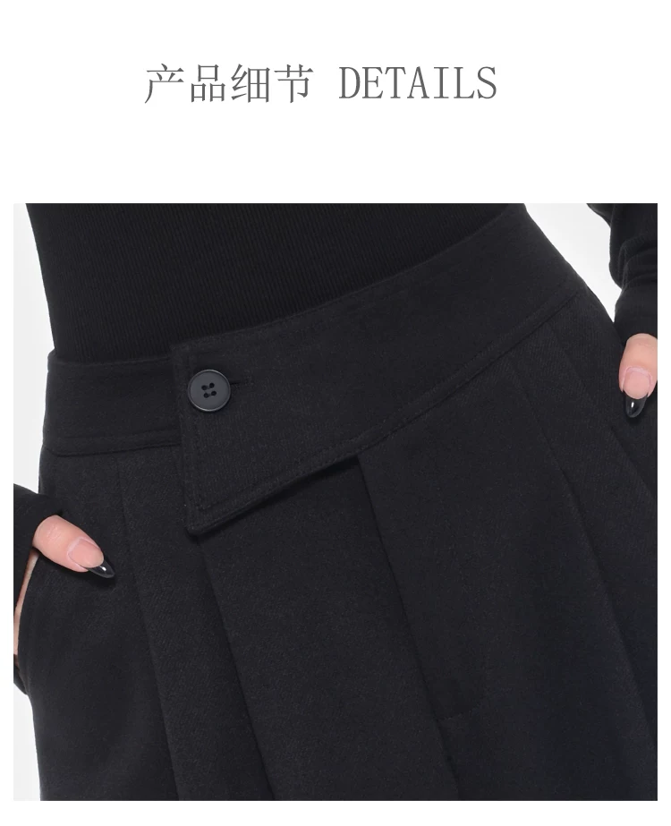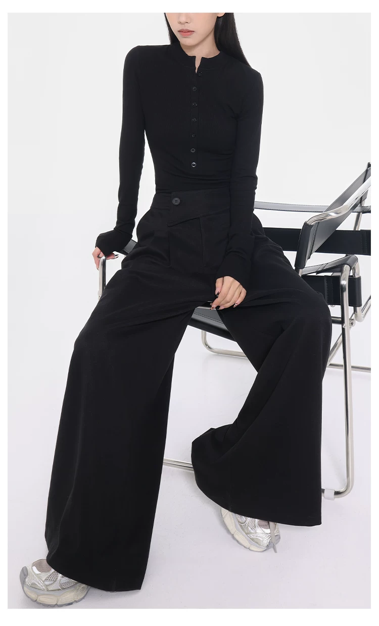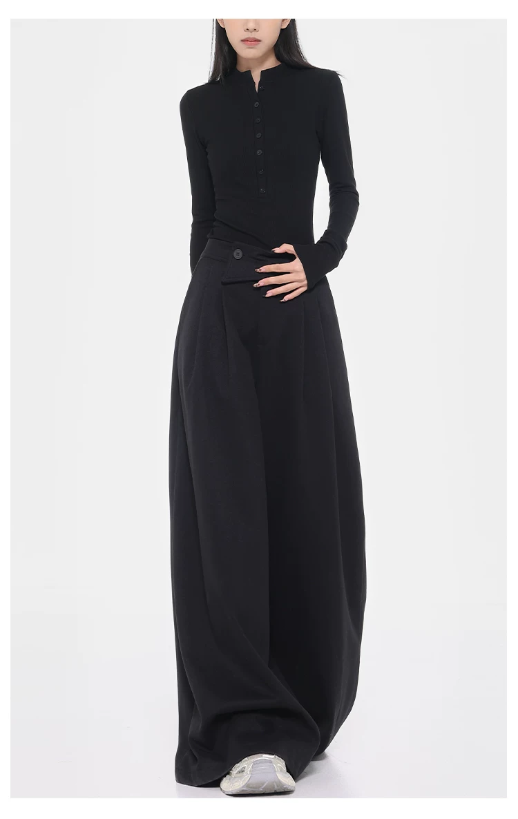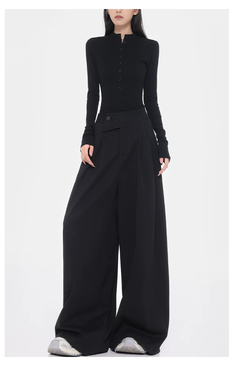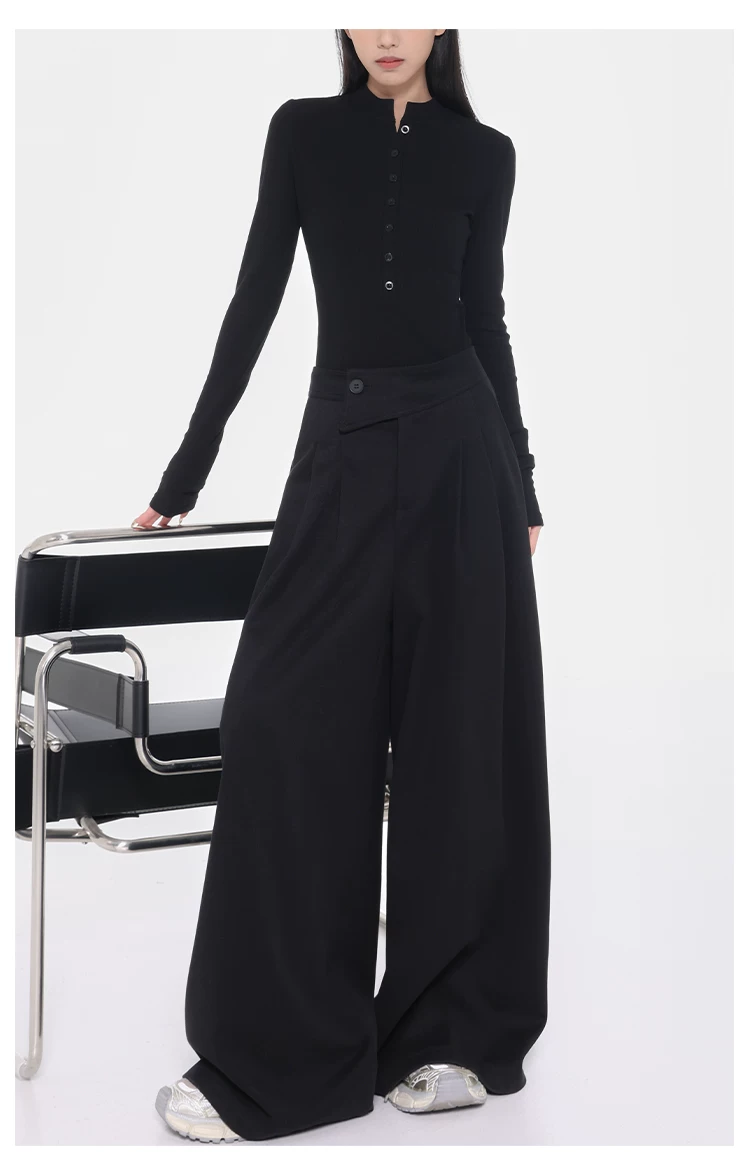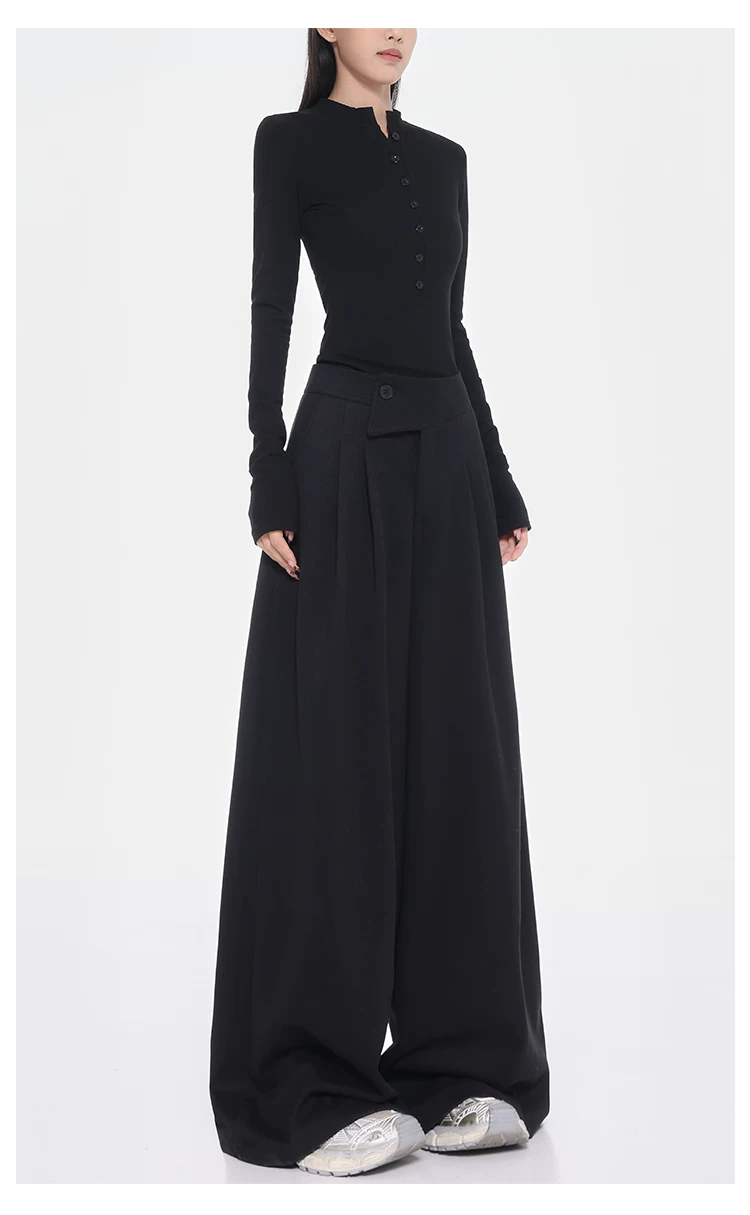 - KEN STUDIO Quần tây ống rộng dày dặn lưng cao thu đông mới dành cho nữ với thiết kế khuy chéo quần ống đứng kiểu dáng đơn giản