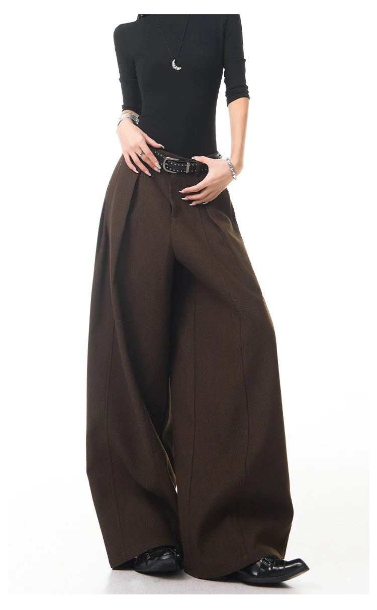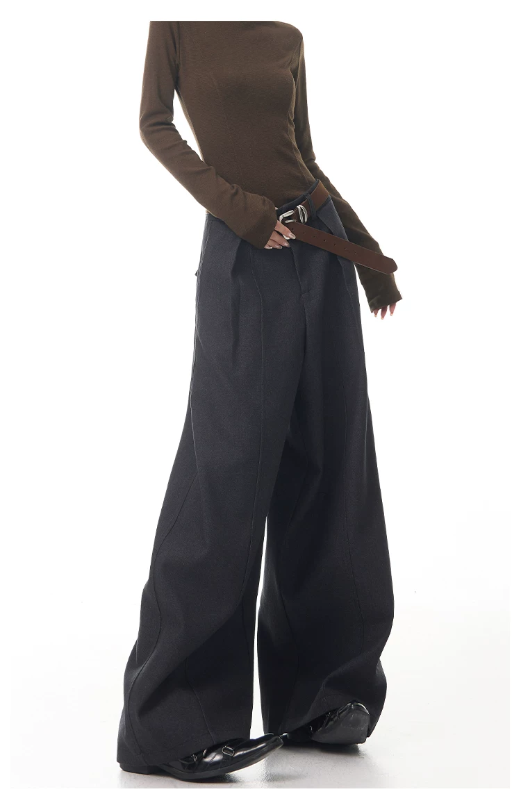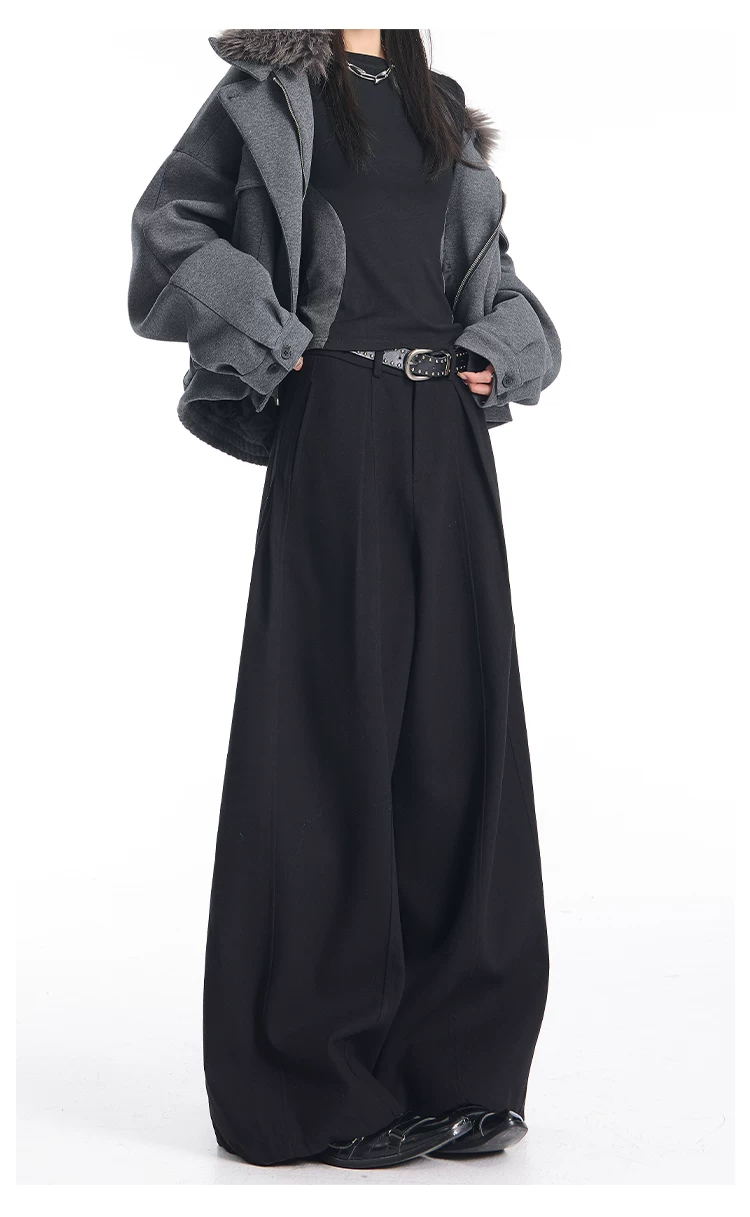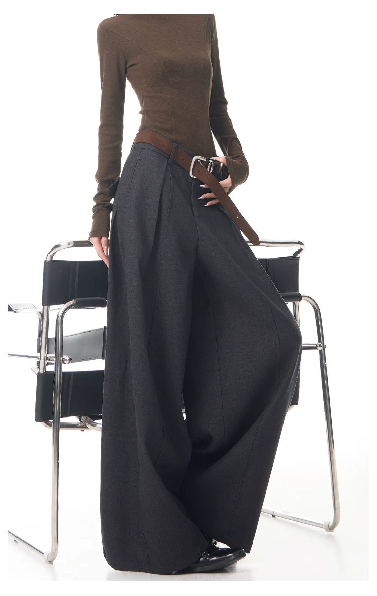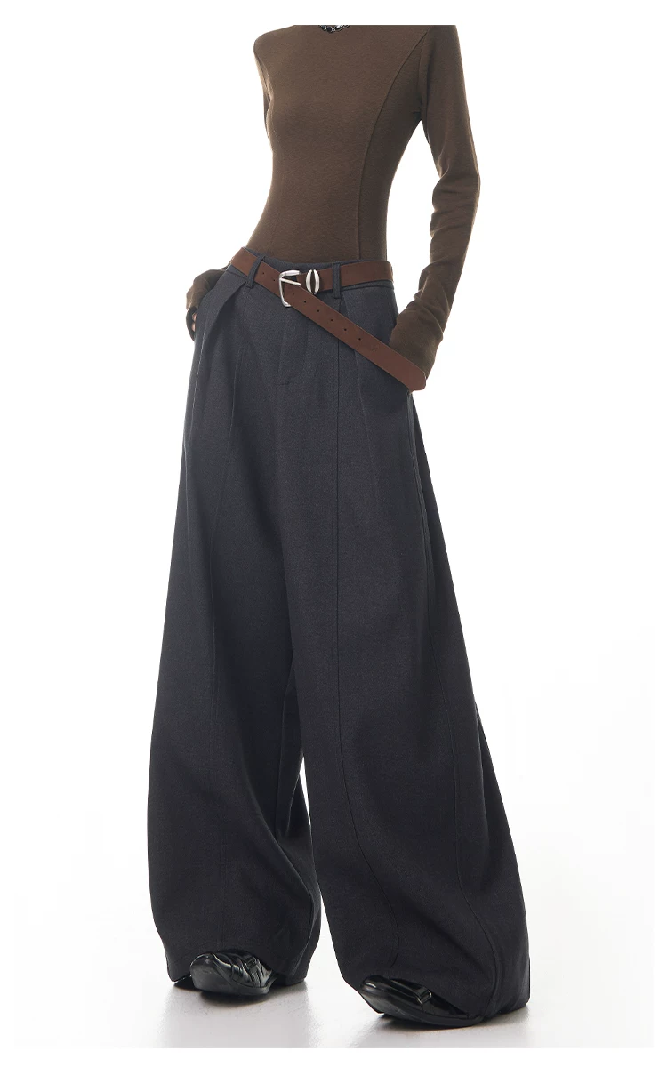 - KEN STUDIO Quần tây ống rộng len màu xám thu đông mới dành cho nữ, quần cạp cao, tôn dáng, quần dài xếp nếp