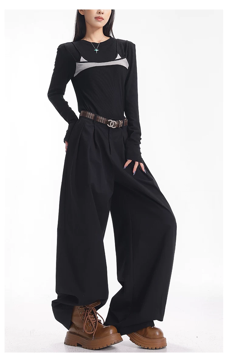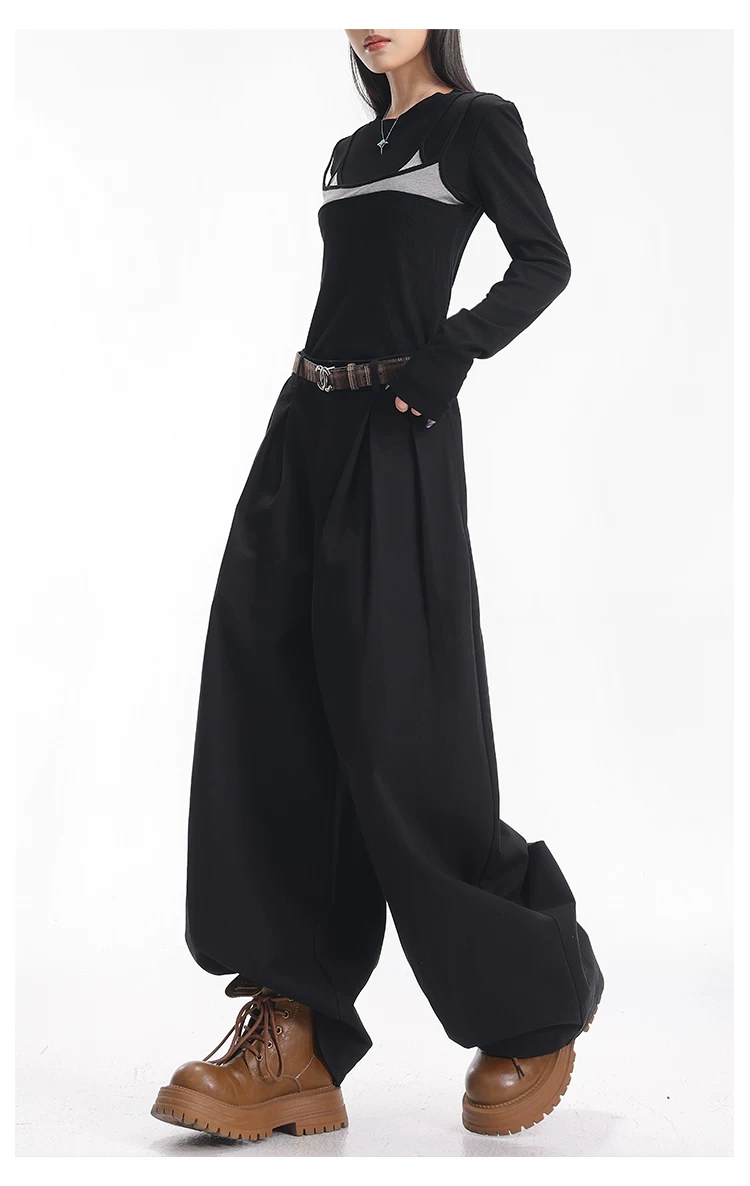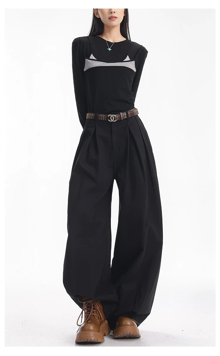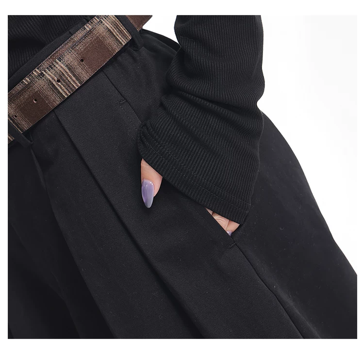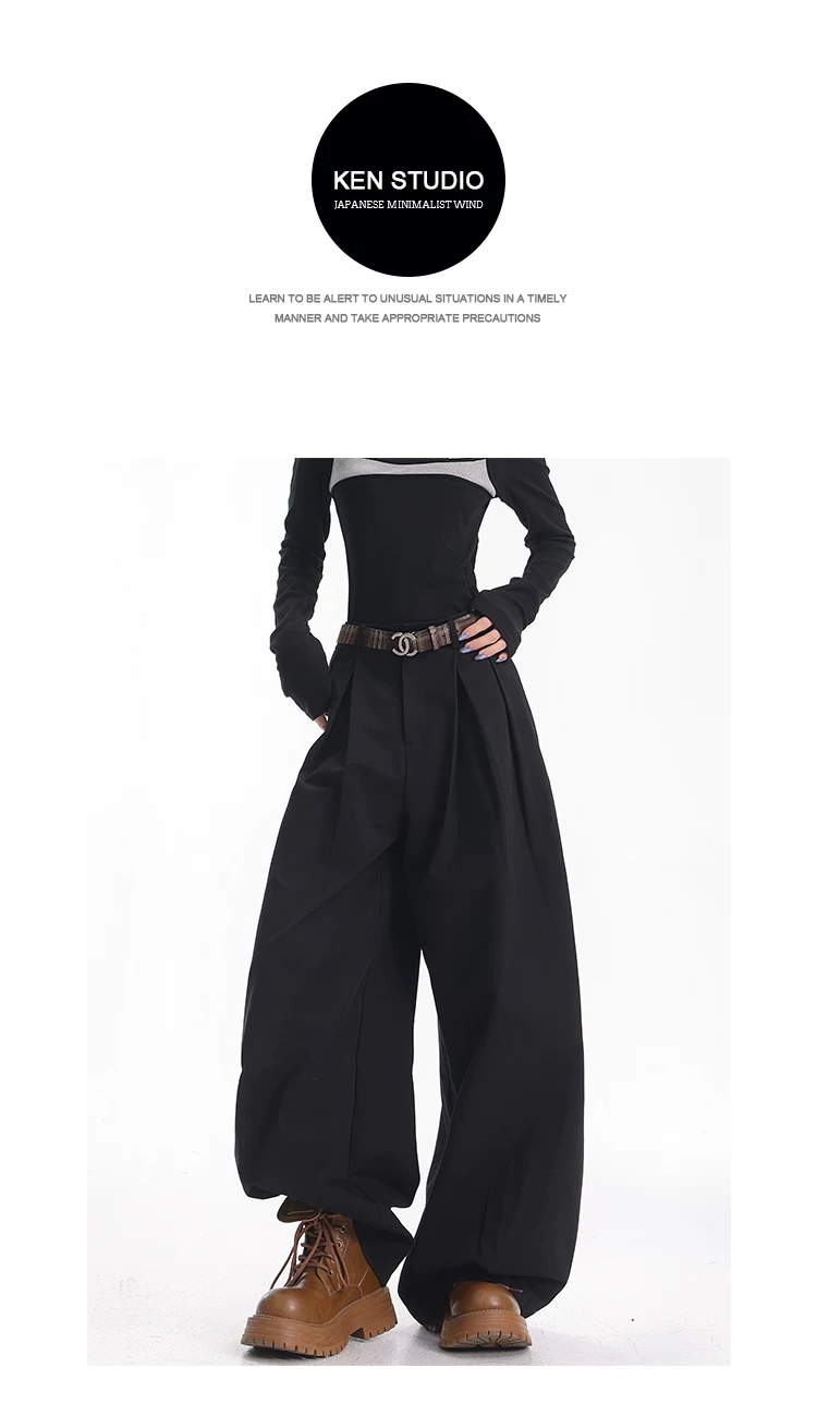 - KEN STUDIO Quần tây ống rộng màu đen thu đông mới dành cho nữ với thiết kế xếp ly, quần ống rộng dáng suông và tôn dáng